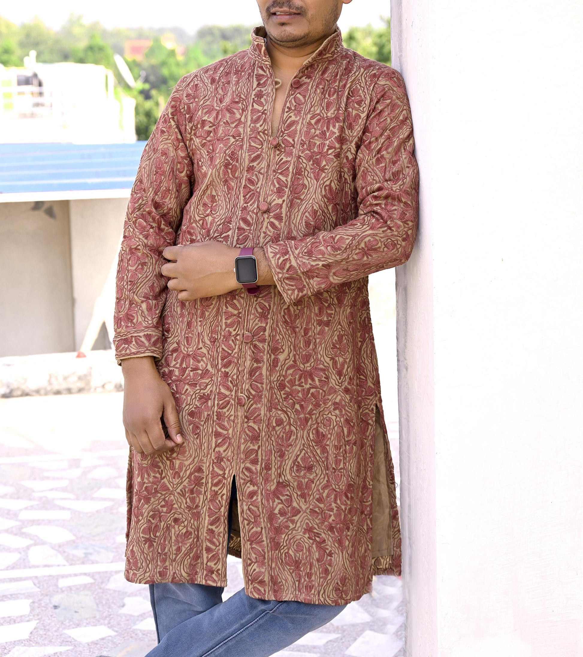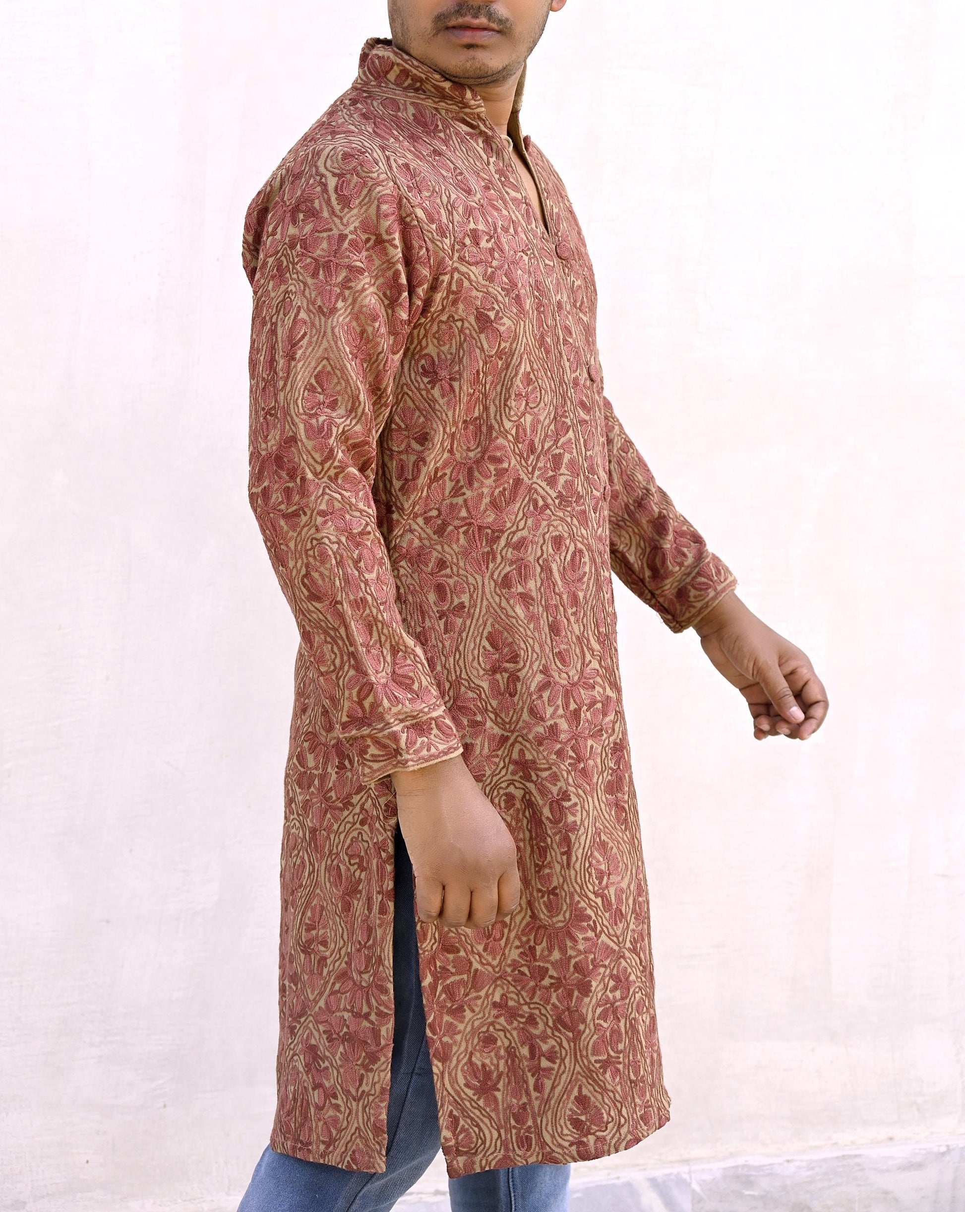 This one-of-a-kind Kashmiri coat is truly a masterpiece, beautifully handcrafted in pure wool. The brown thread embroidery stands out as the highlight of the piece, featuring an elegant floral pattern at the center that adds to its timeless charm. The detailed button work and functional side pockets enhance both its elegance and practicality, making it a perfect blend of comfort and classic Kashmiri craftsmanship.