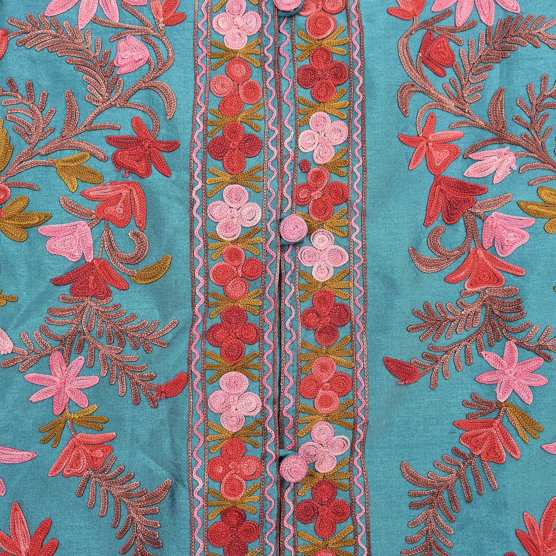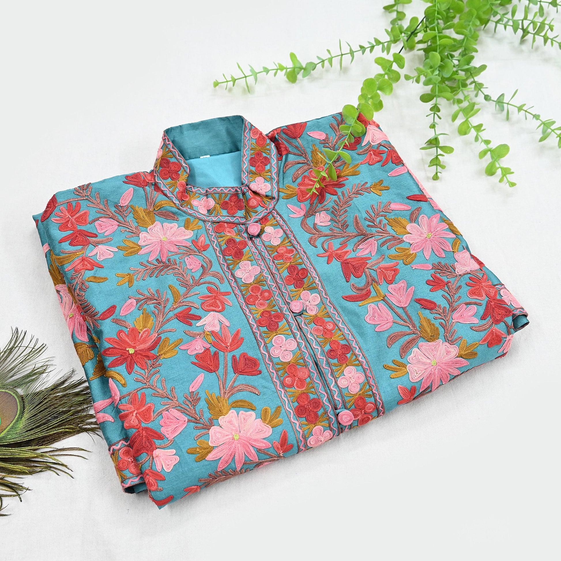 Stunning Embroidered Kashmiri Coat – Green Raw Silk Fabric