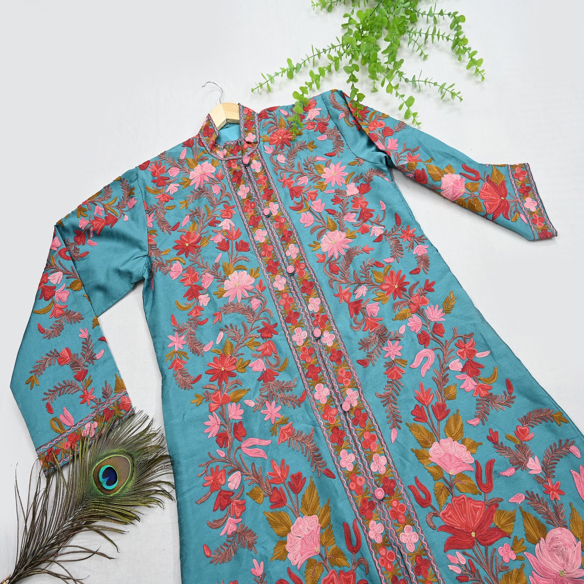 This one-of-a-kind Kashmiri coat is truly a masterpiece, beautifully handcrafted in pure wool. The Multi thread embroidery stands out as the highlight of the piece, featuring an elegant floral pattern at the center that adds to its timeless charm. The detailed button work and functional side pockets enhance both its elegance and practicality, making it a perfect blend of comfort and classic Kashmiri craftsmanship.