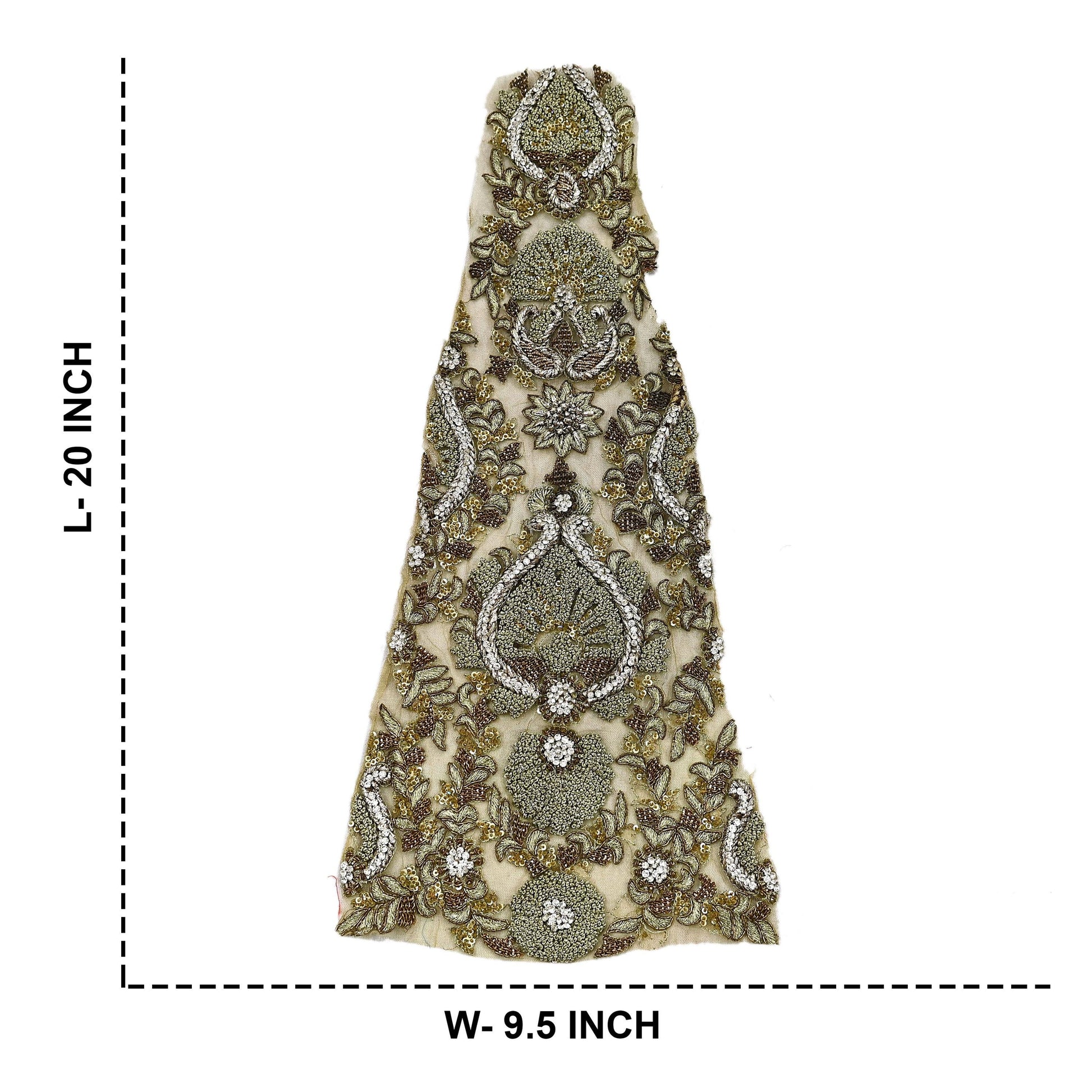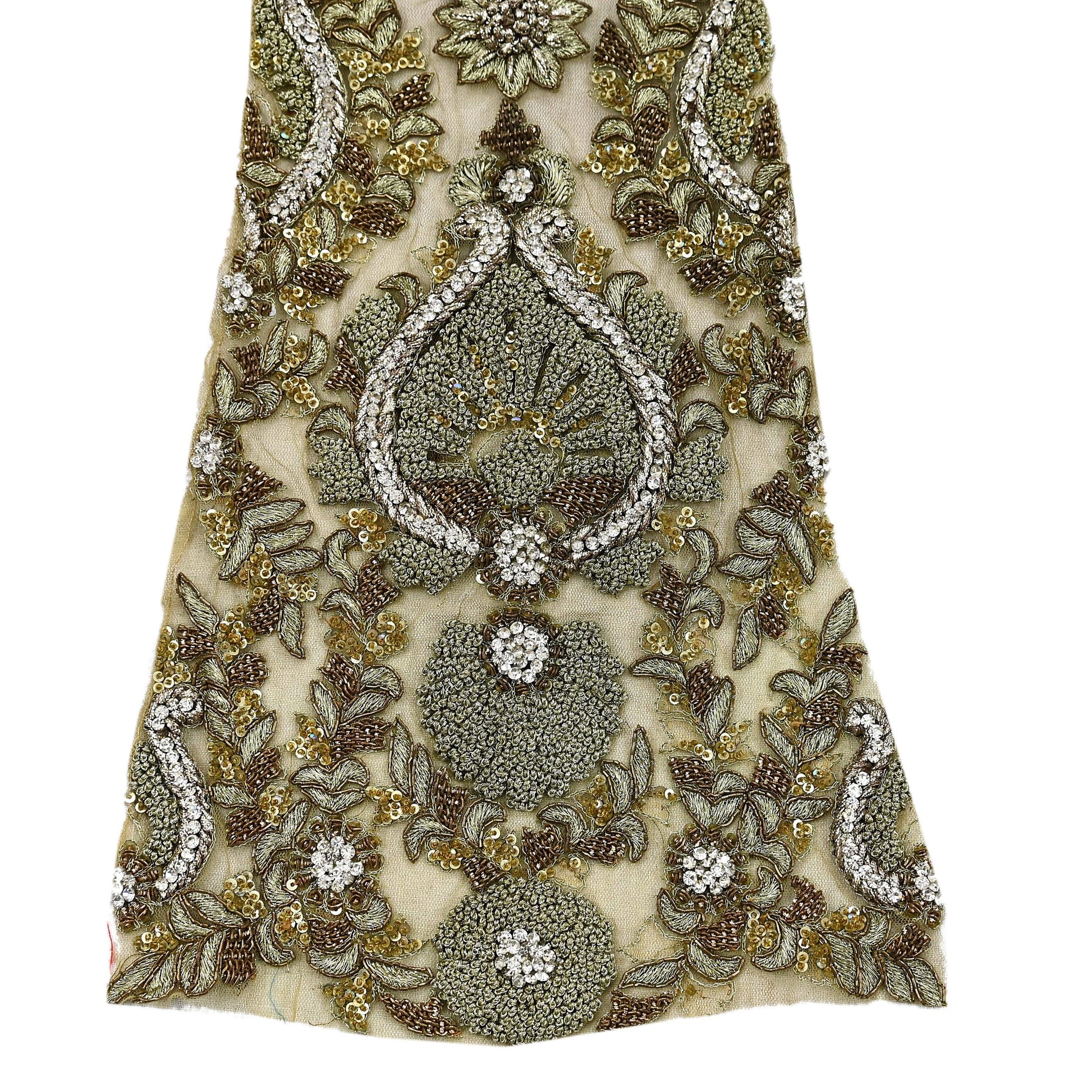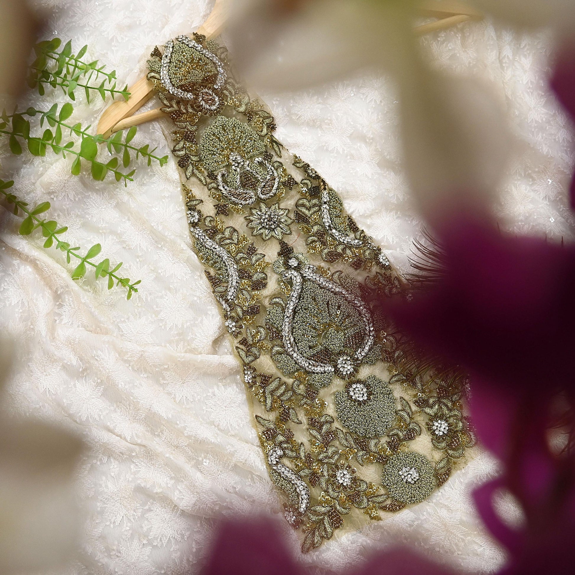 Enhance your craft with this stunning set of 1 hand-embroidered vintage appliques, cut from an elegant Net/Mesh sari in soft Green. These graceful pieces feature floral motifs embellished with golden Beaded, white Stone, Golden sequins, zardozi/dabka, and zari, Silver Gota patti embroidery, showcasing exquisite traditional Indian craftsmanship.