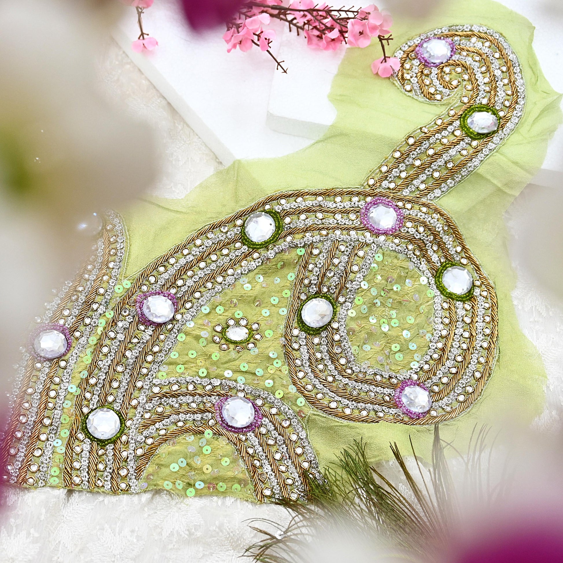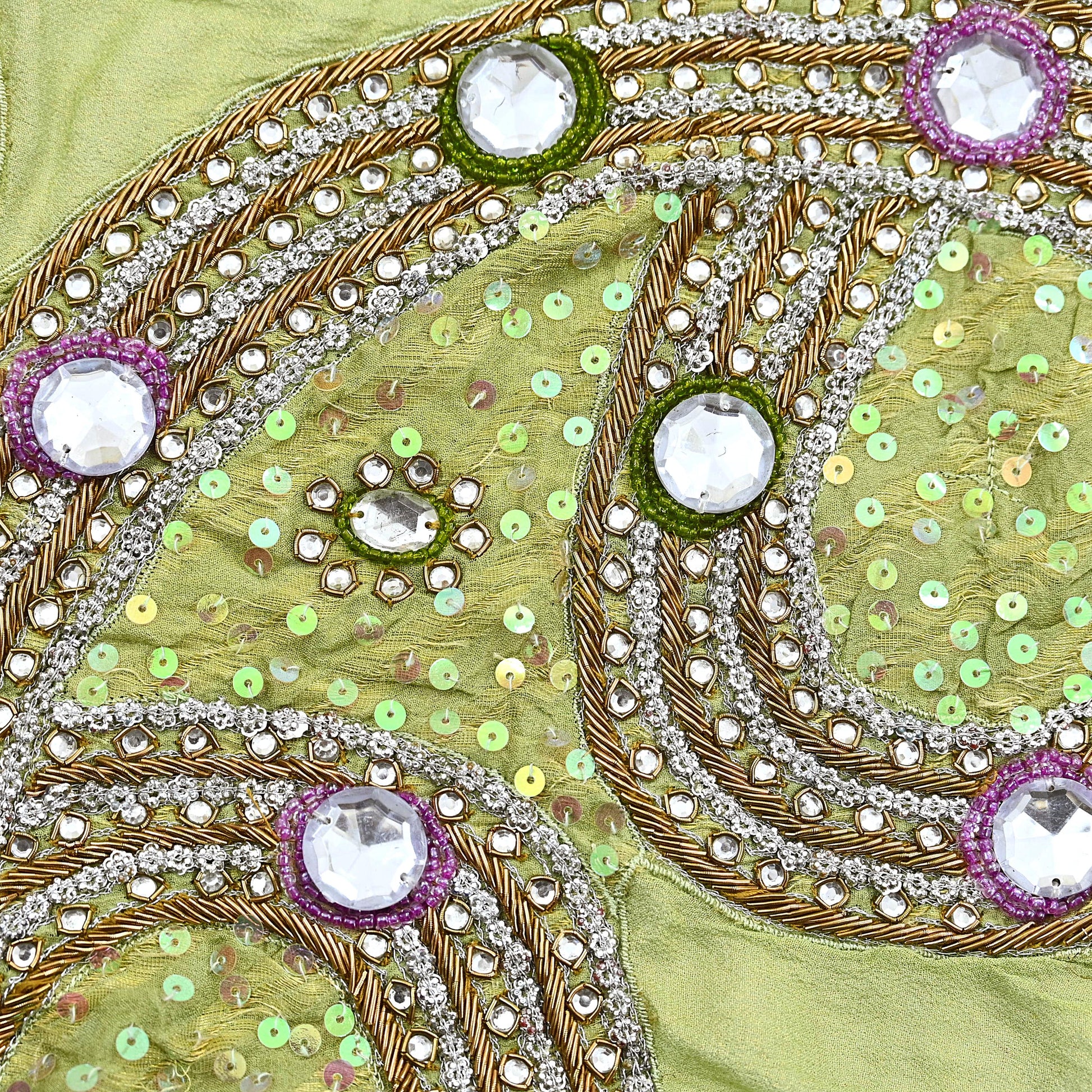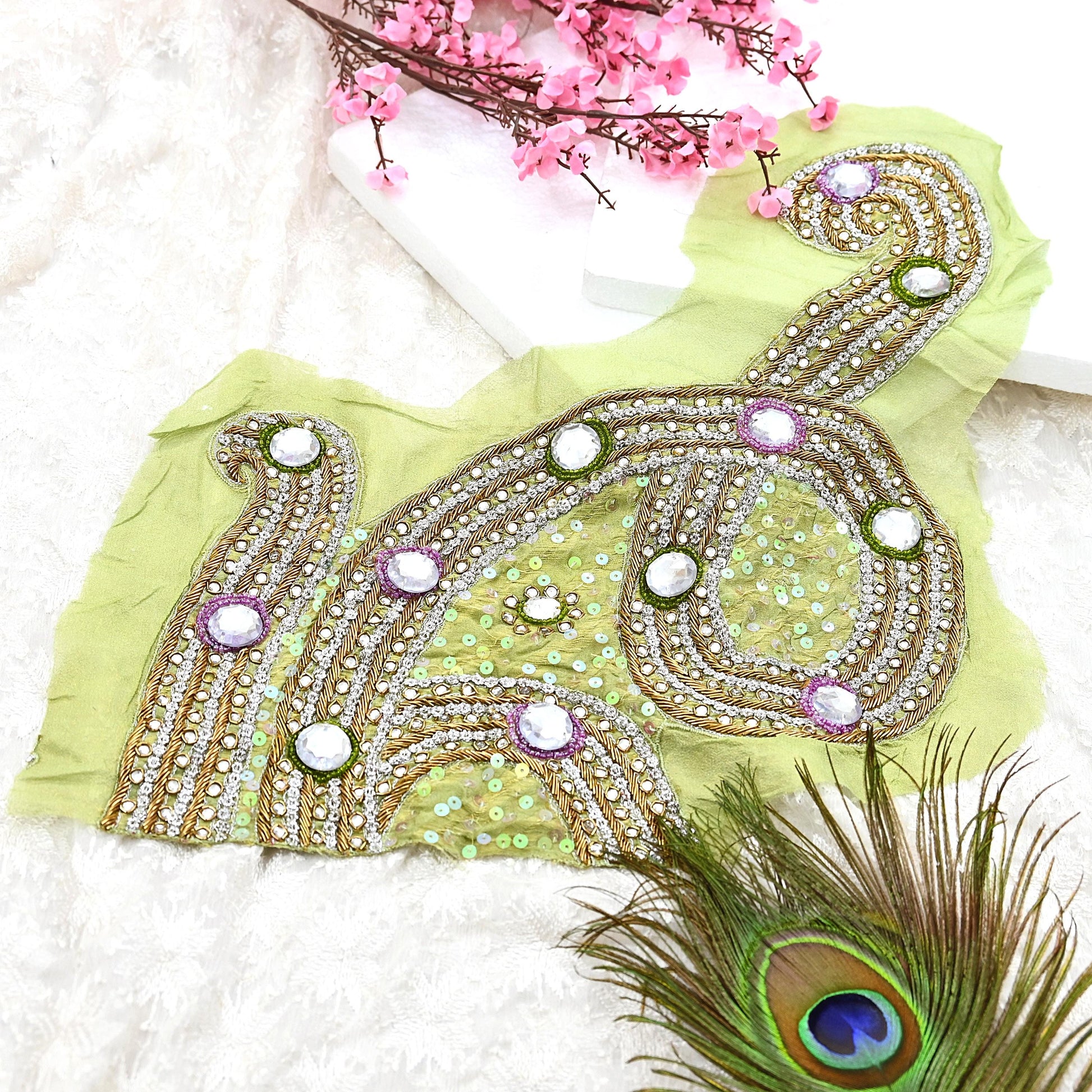 Enhance your craft with this stunning set of 1 hand-embroidered vintage appliques, cut from an elegant pure georgette silk sari in soft Green. These graceful pieces feature floral motifs embellished with white Stones, green & Purple beaded, Golden zardozi/dabka, and zari, embroidery, showcasing exquisite traditional Indian craftsmanship.