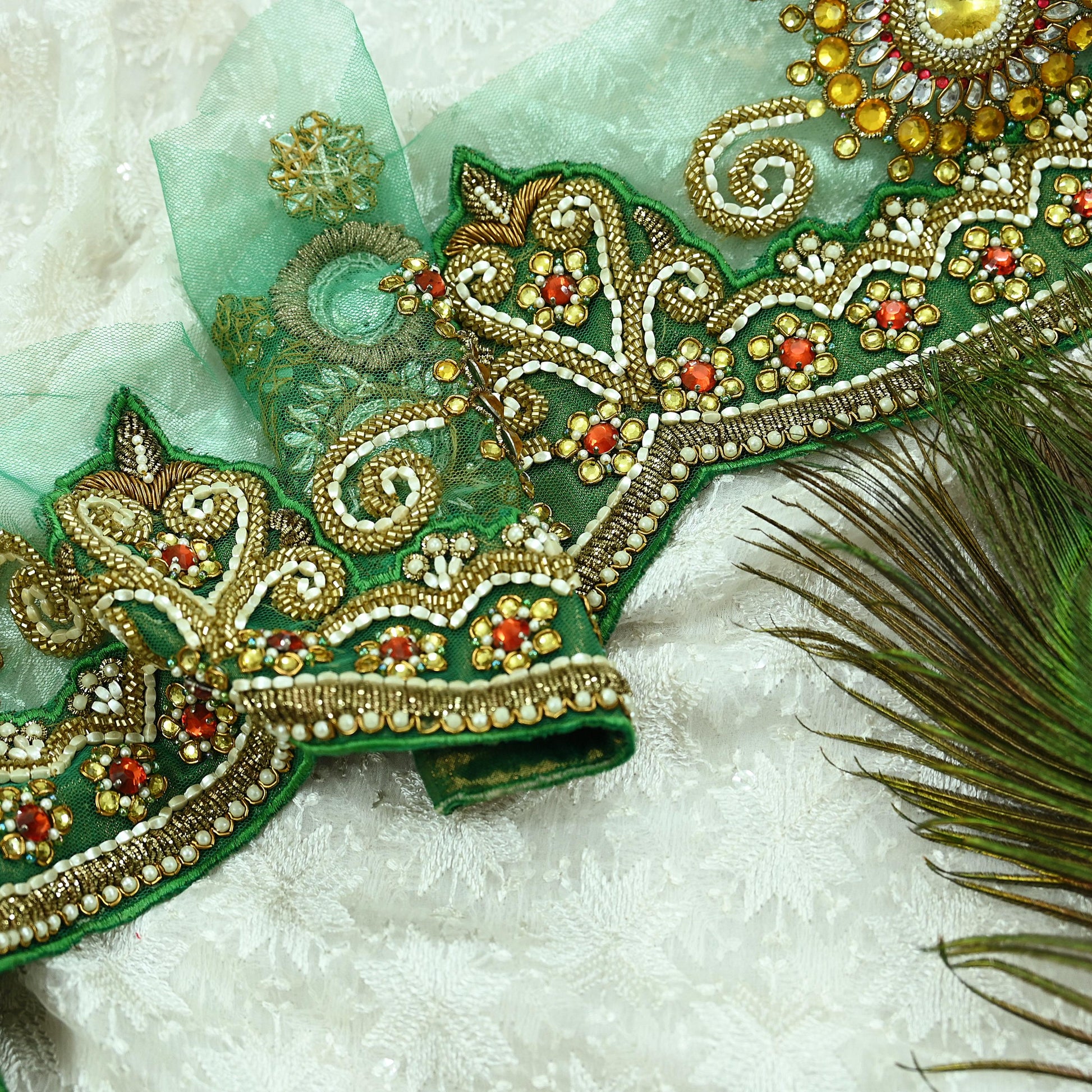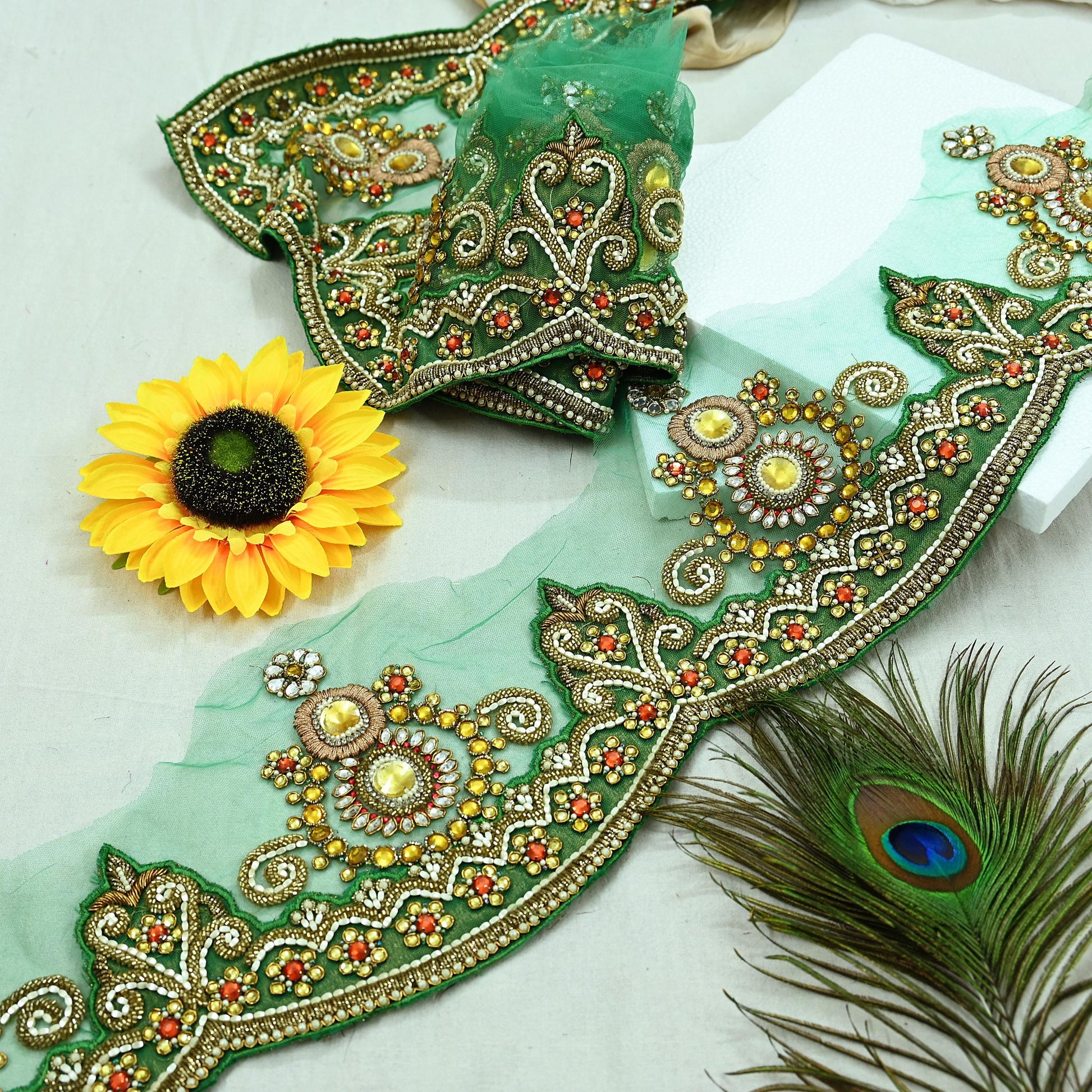 *Graceful Net/Mess Hand Embroidered Border In Green Color Highlighting Golden Zardozi/ Dabka Work.