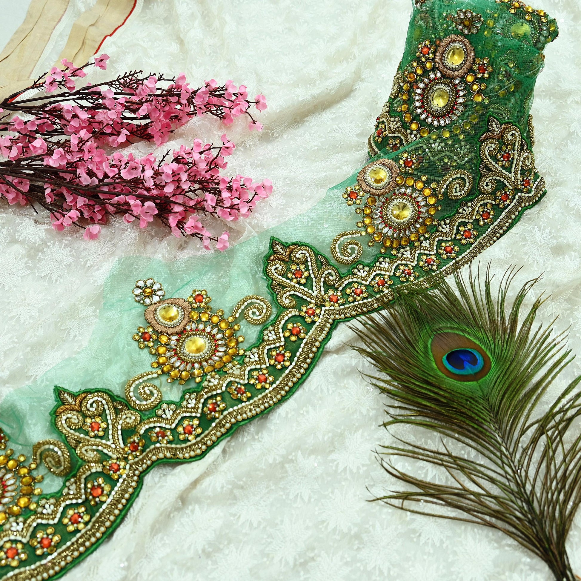 Indian Vintage Green Sari Border Hand Embroidered 1yd Craft Trim Lace Sewing Net/Mess Ribbon Recycled Sari Border Zardozi/ Dabka Zari