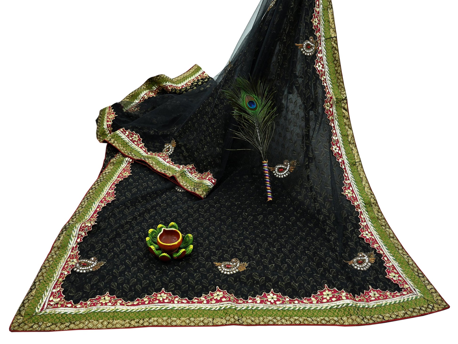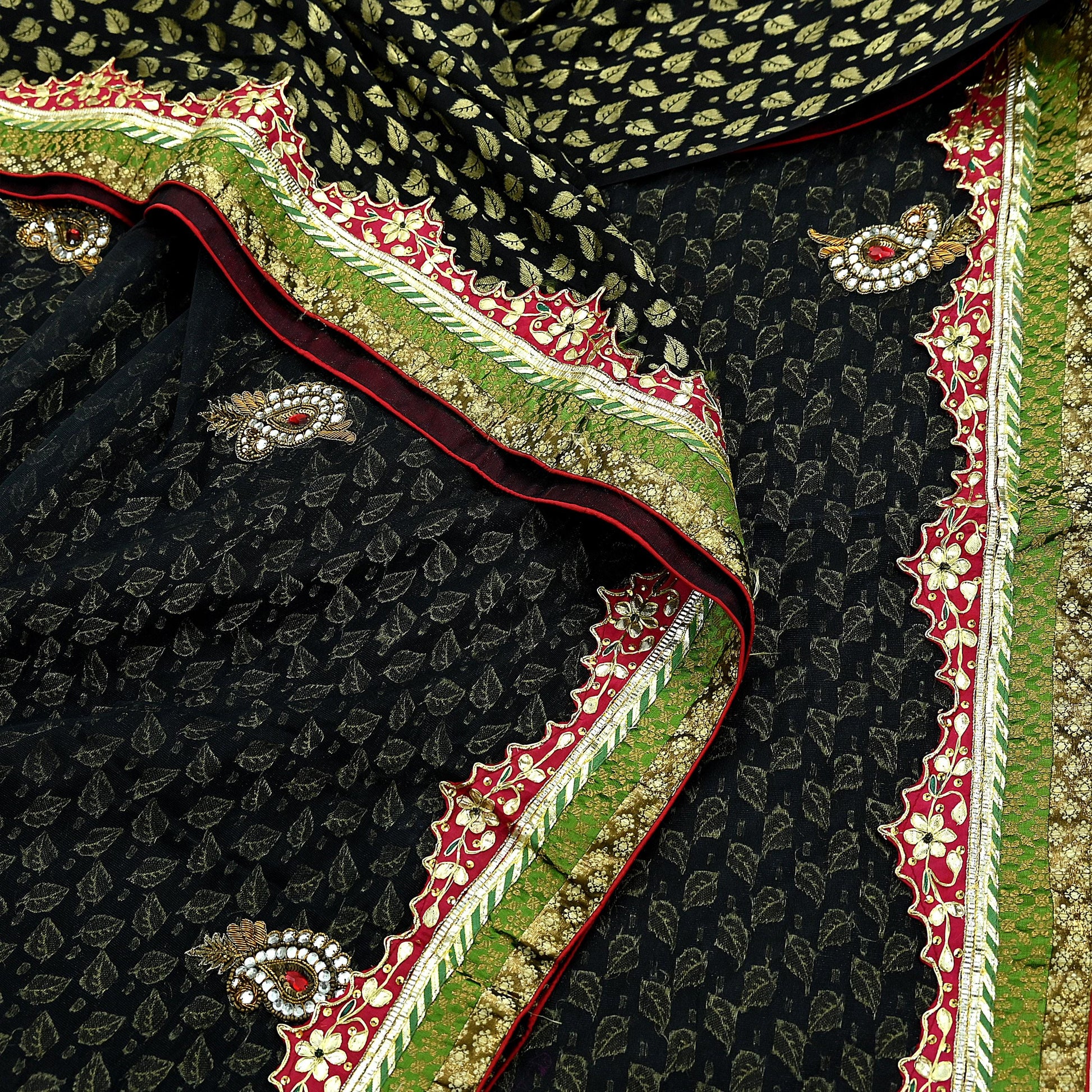 *Pallu & Border Features Floral & Paisley Design Embellished With Golden Zardozi/ Dabka, Zari, Red & White Stones, Golden Gota patti, Golden Sequins Work.