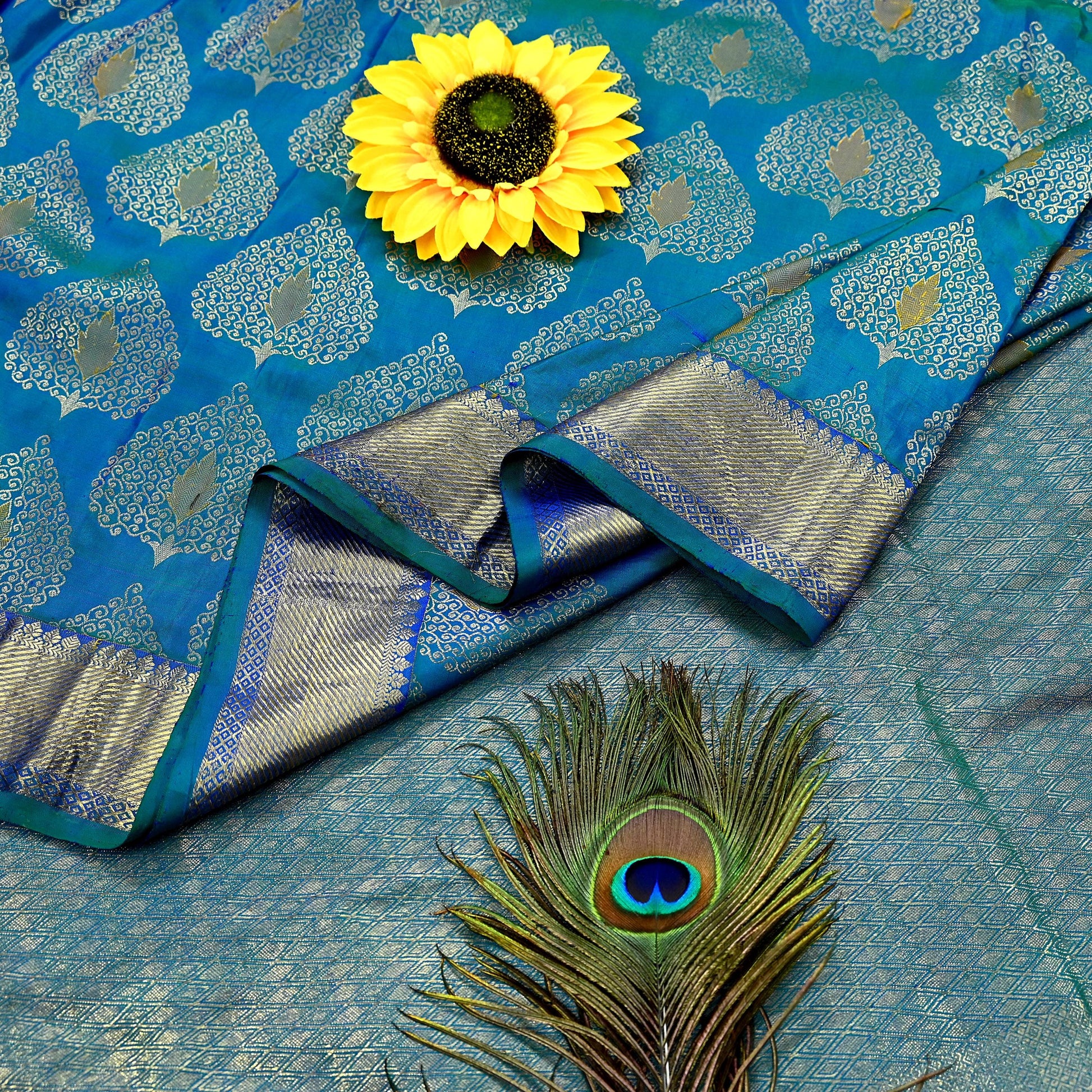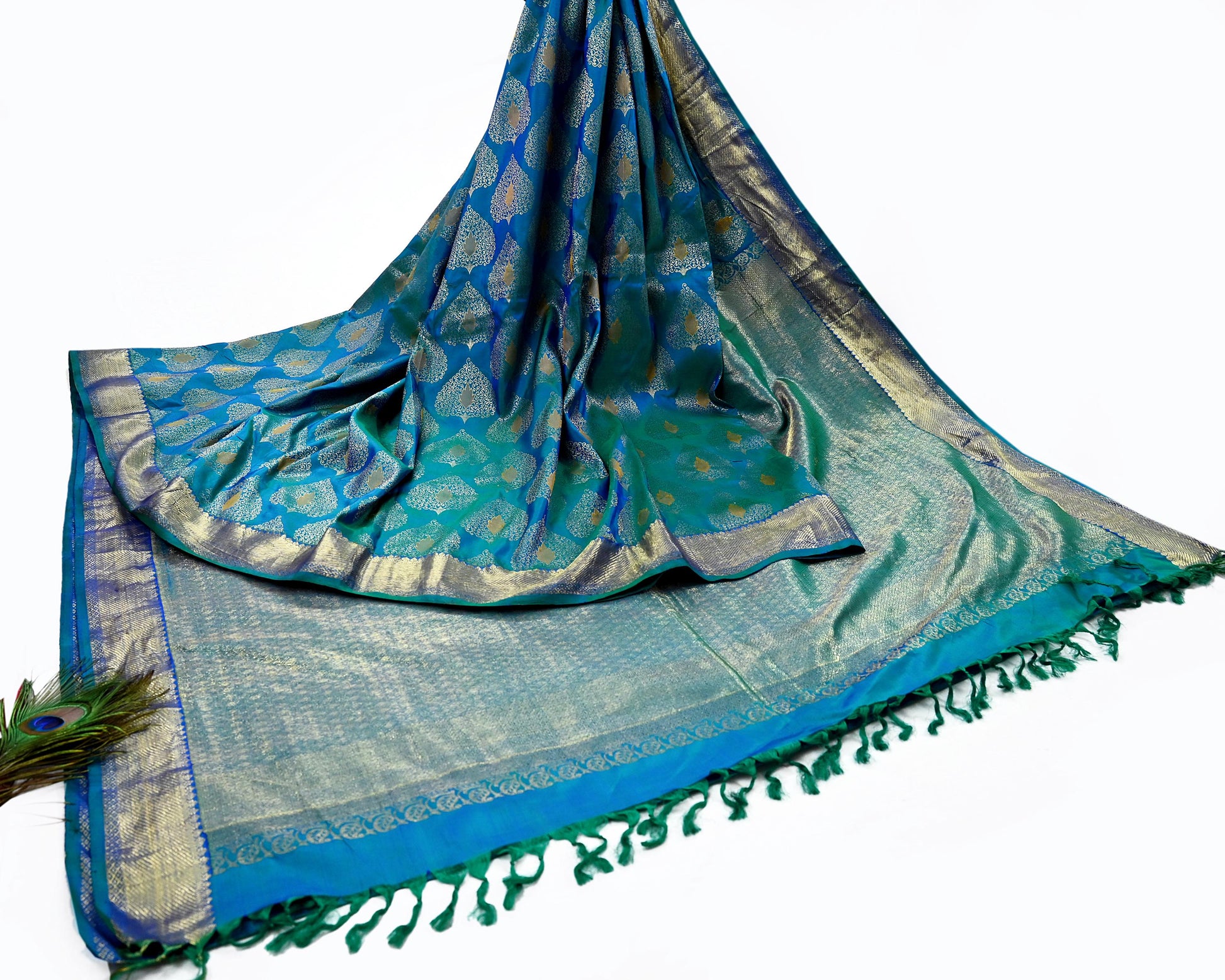 *pallu & border sari features Geometric Motif Design with Golden Metallic Woven Zari, Green woven work. With Green silk Fringes work On pallu.