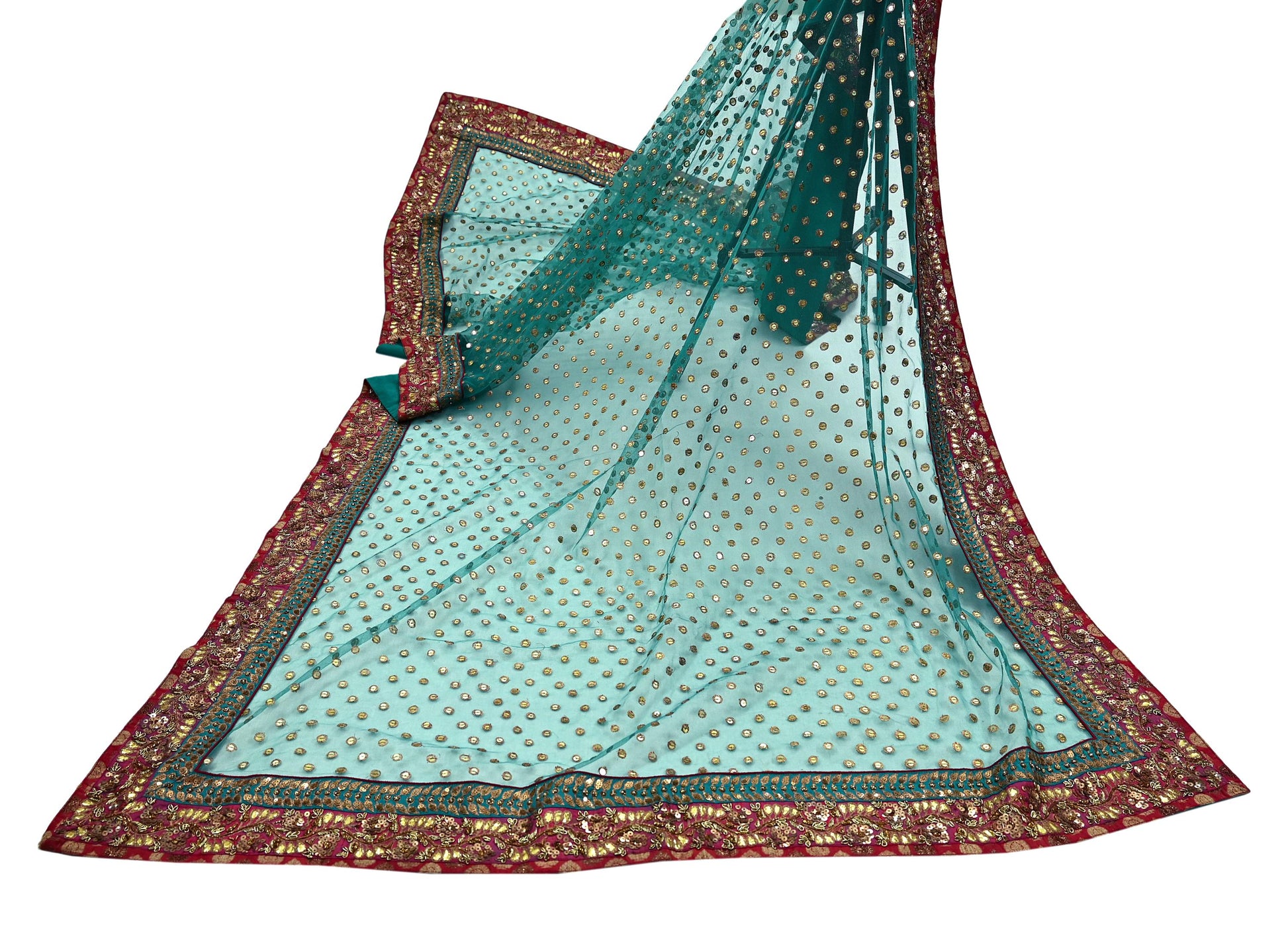 Stunning Beautiful Heavy Dupatta Hand Embroidered Net Dupatta/Stole In Green Color Fabric. This one of a kind item is difficult to express in words. Border feature is floral & Paisley design embroidered Golden Sequins, pure metallic Copper zardozi/Dabka/Zari And Golden Gota patti, Golden Sequins, Golden Beaded work embellished work is the highlight of the dupatta. Also you can see similar Zardozi, Beaded work with floral pattern in center part adds to its beauty. Green & Maroon silk Border work is giving a fabulous look to the dupatta. Awesome one !!!