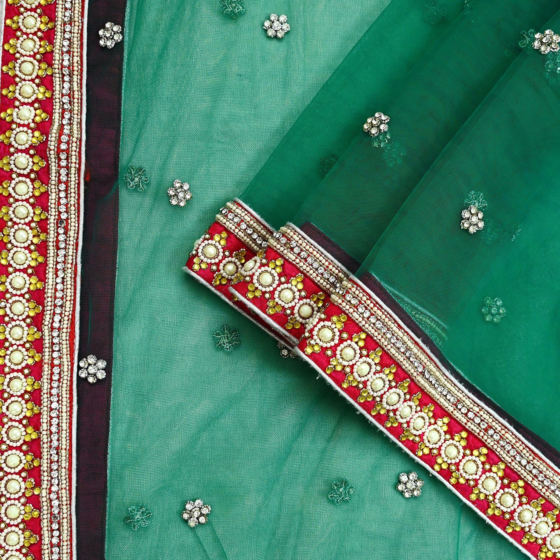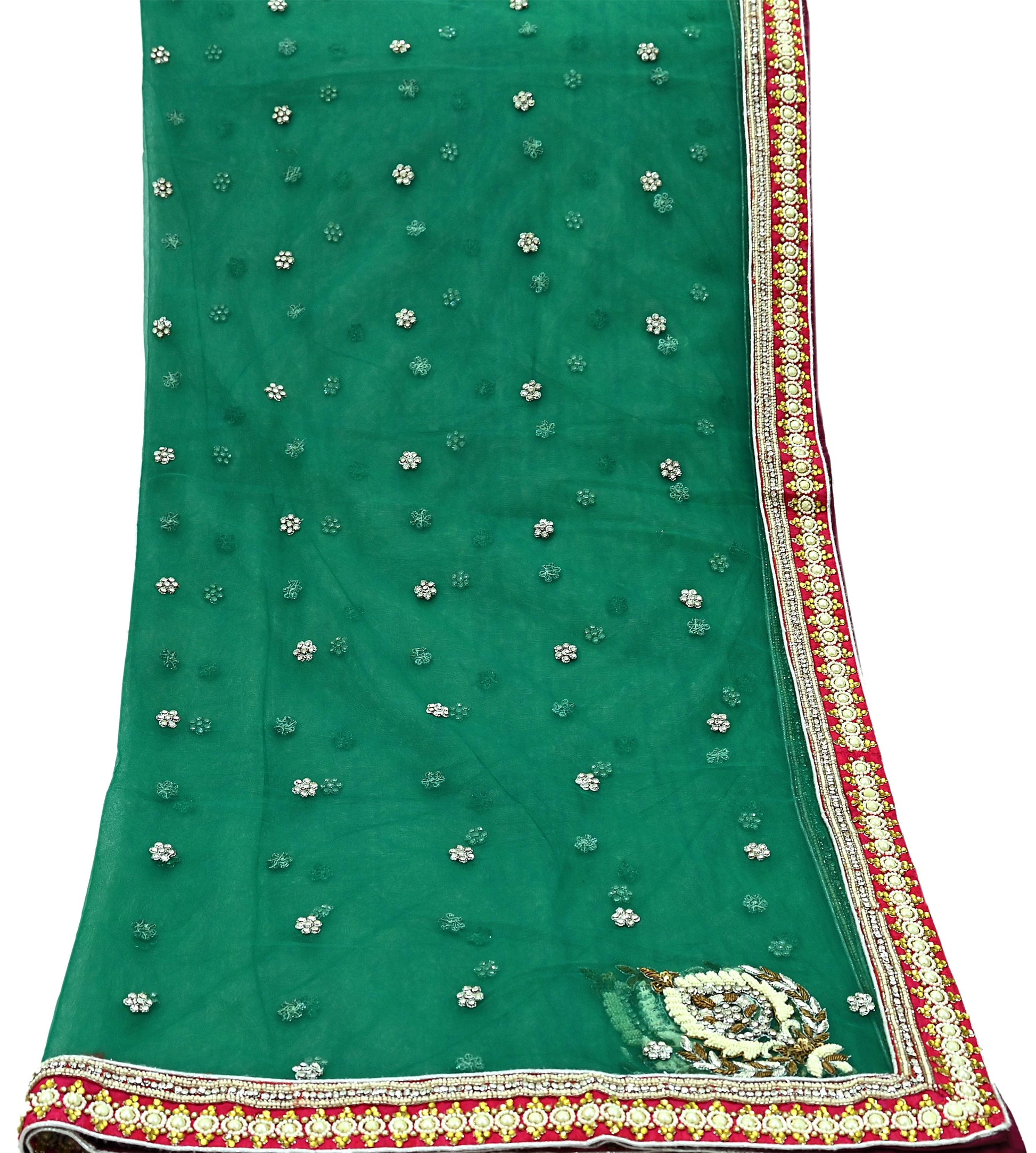 Stunning Beautiful Heavy Dupatta Hand Embroidered Net Dupatta/Stole In Green Color Fabric. This one of a kind item is difficult to express in words. Border feature is floral & Paisley design embroidered pure metallic Copper & Golden zardozi/Dabka/Zari And Golden, White Stone/Beaded, Silver Glass Beaded, White Pearl Like Beaded work embellished work is the highlight of the dupatta. Also you can see similar Zardozi, Beaded work with floral pattern in center part adds to its beauty. Rani Pink Chanderi Border work is giving a fabulous look to the dupatta. Awesome one !!!