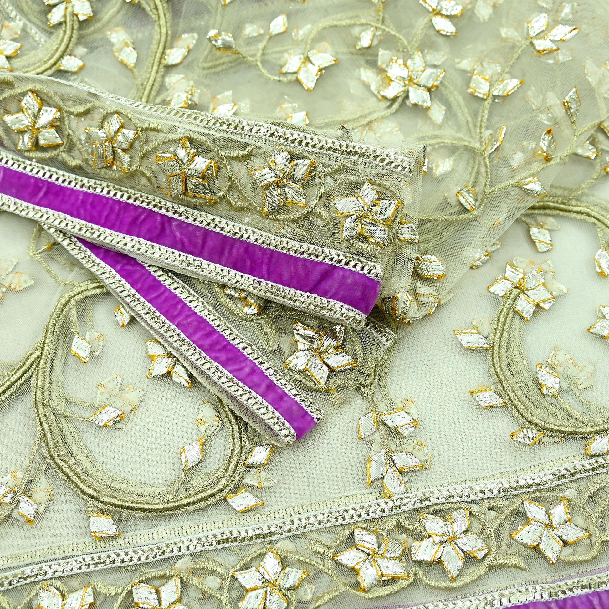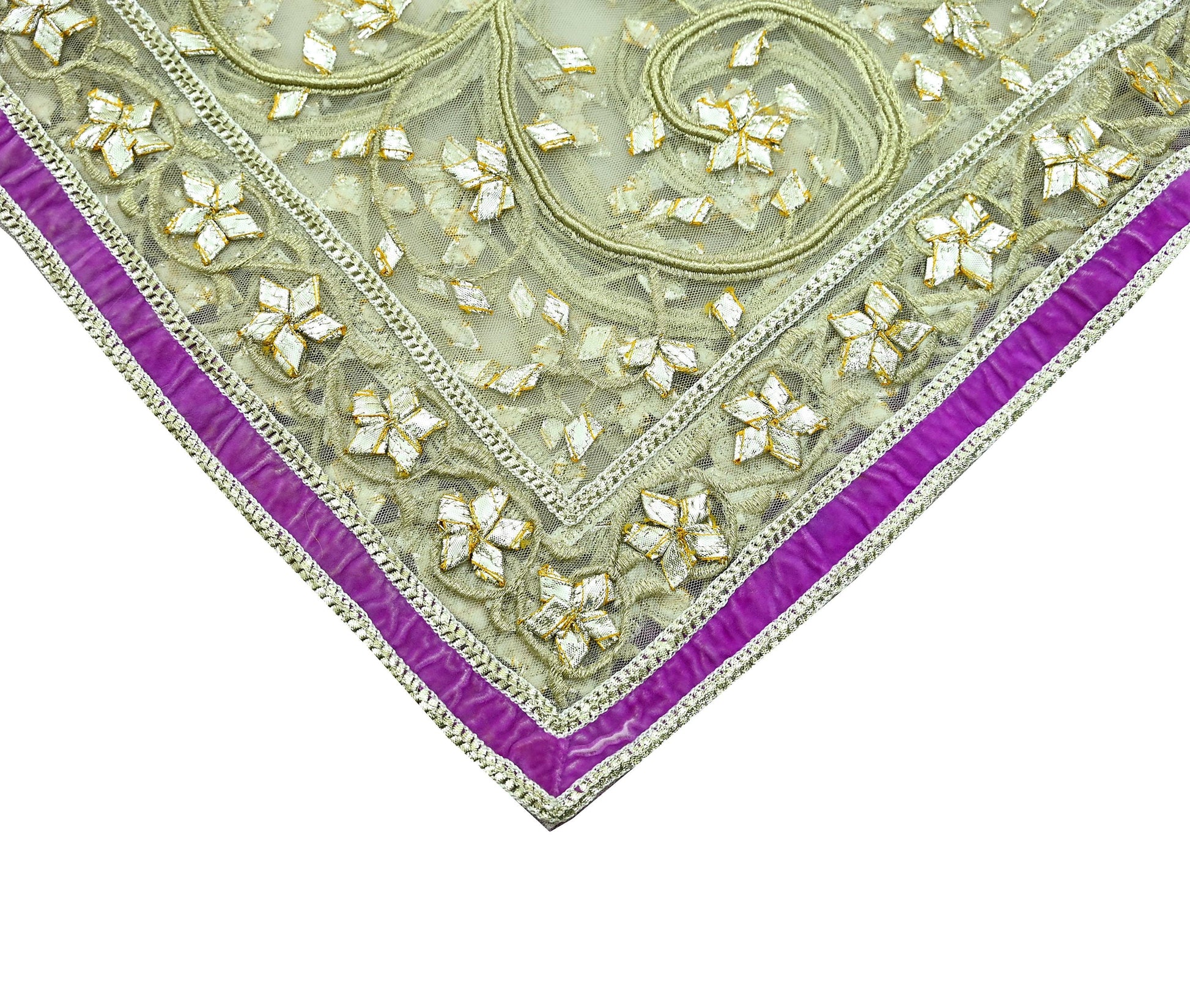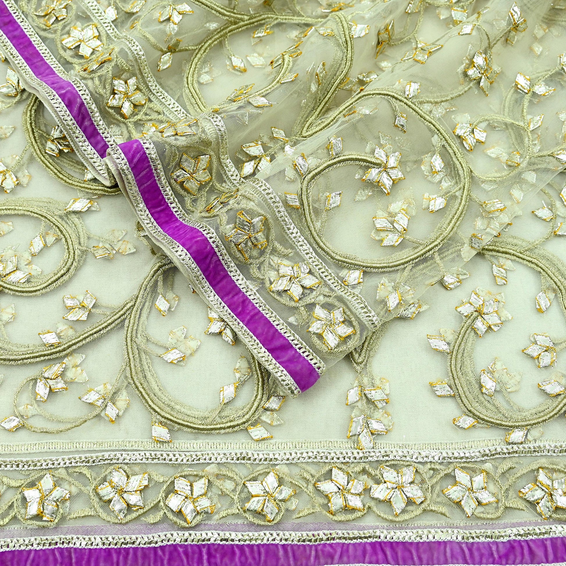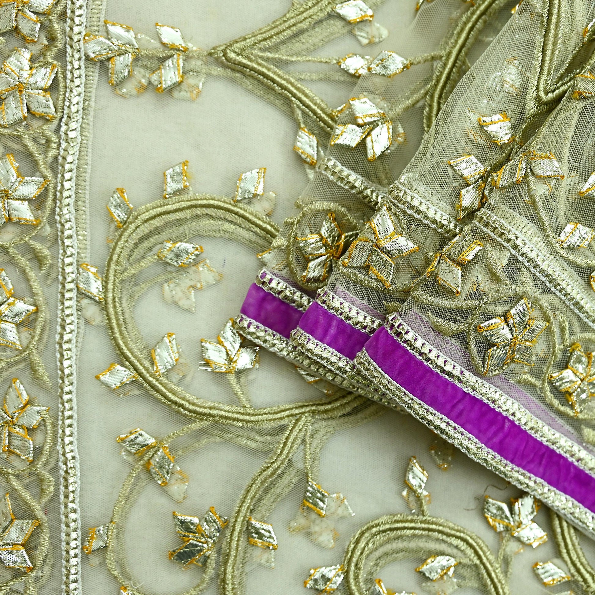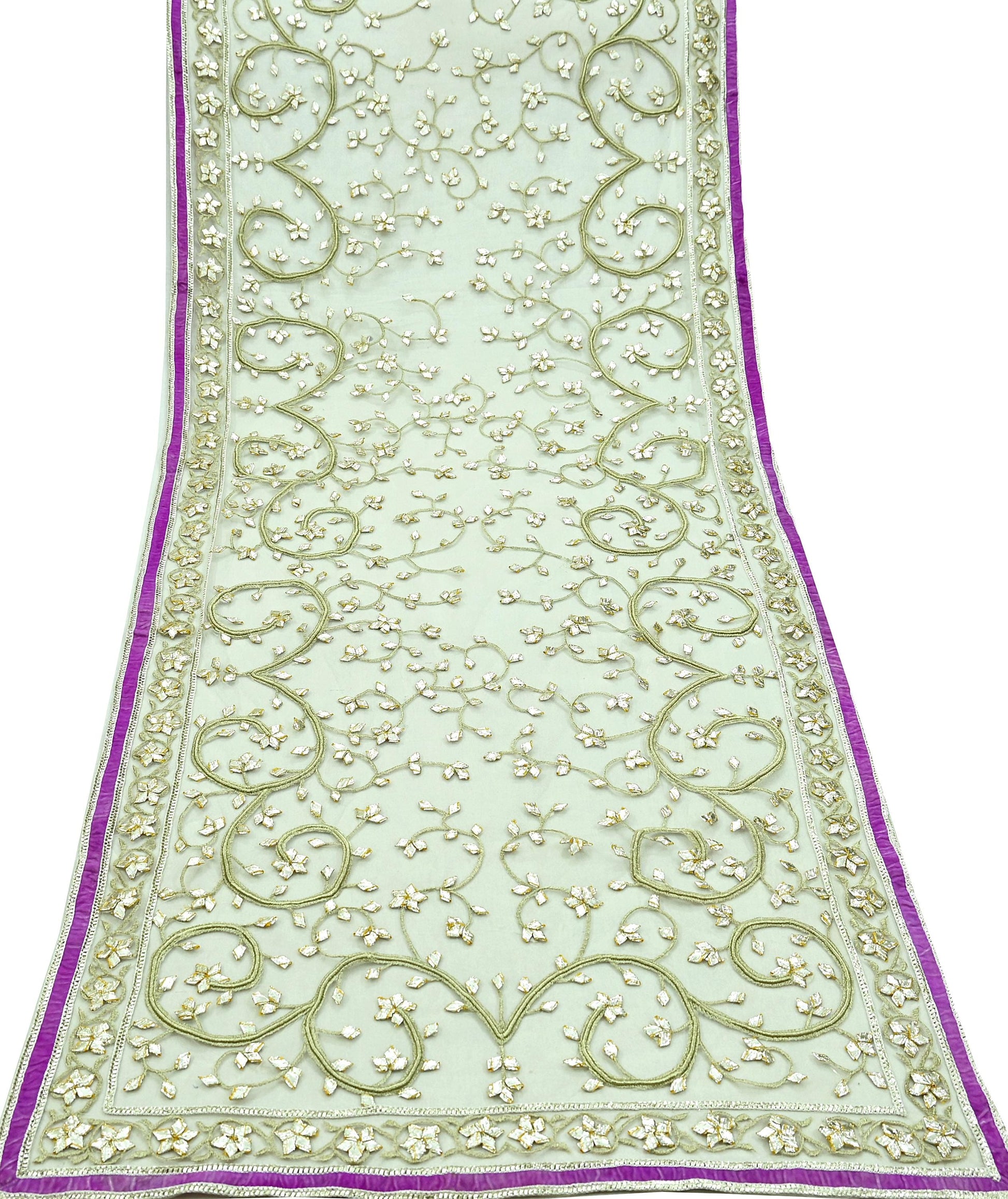 Stunning Beautiful Heavy Dupatta Hand Embroidered Net Dupatta/Stole In Ivory Color Dupatta. This one of a kind item is difficult to express in words. Border feature is floral design embroidered pure metallic Golden Gota patti, Golden Zari work embellished work is the highlight of the dupatta. Also you can see similar work with floral pattern in center part adds to its beauty. Purple Velvet Border work is giving a fabulous look to the dupatta. Awesome one !!!