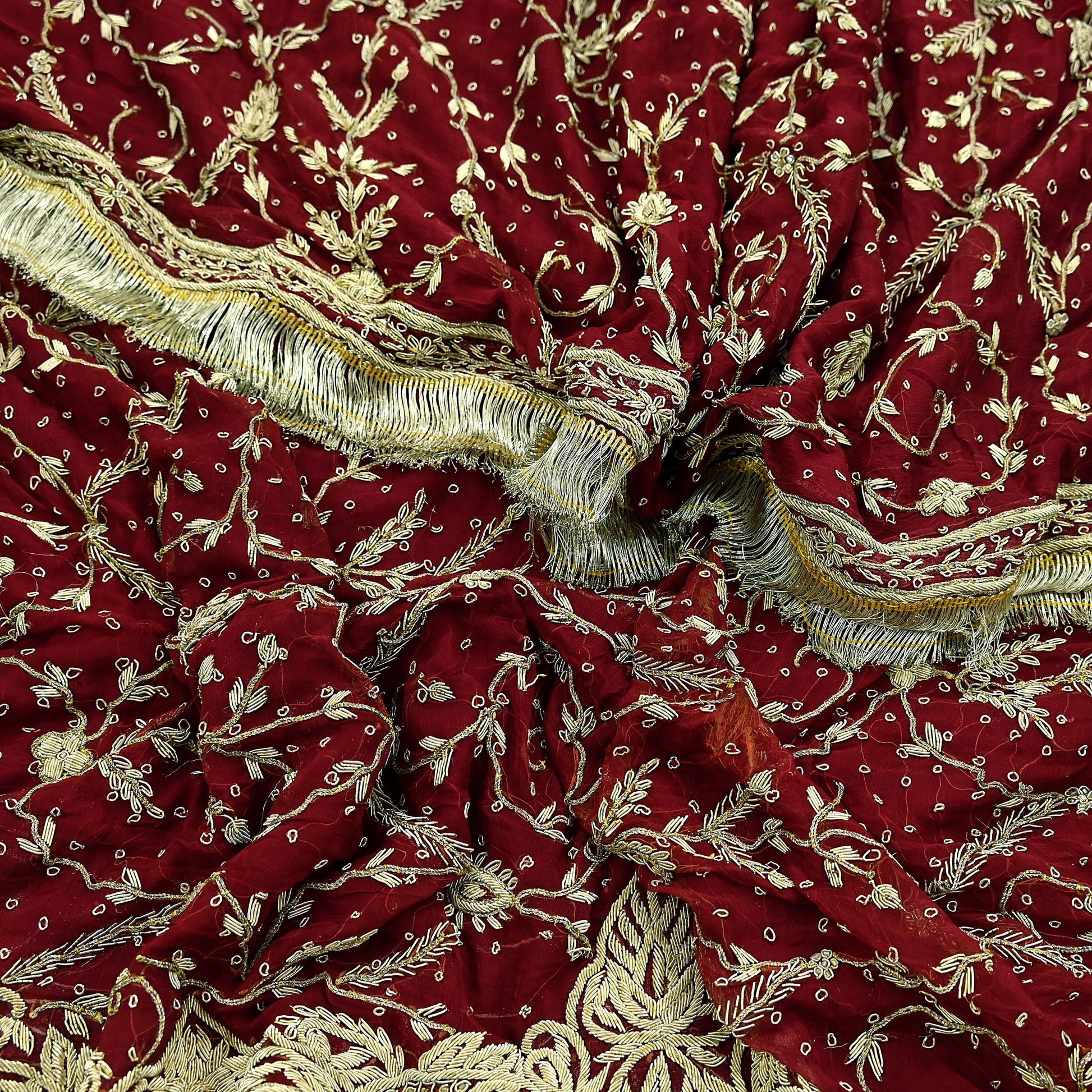 Step into Majestic Elegance with this Stunning Very Heavy Hand Embroidered Dupatta, meticulously crafted from 100% Pure Chiffon Silk in a rich Maroon hue. This extraordinary piece is truly one-of-a-kind and radiates regal charm with every fold.