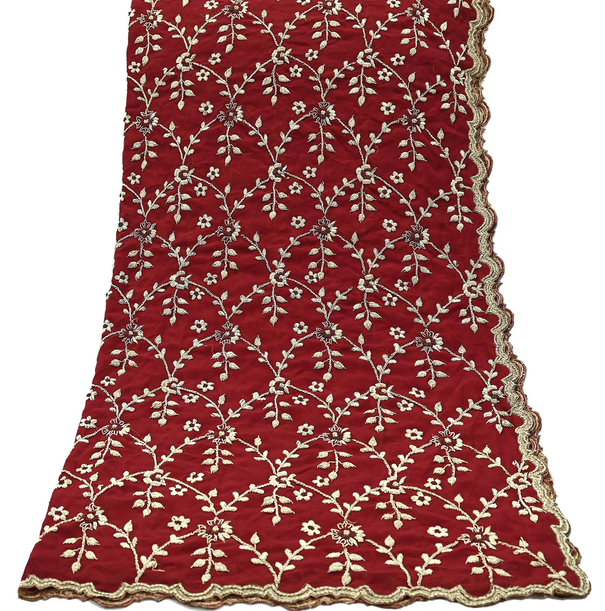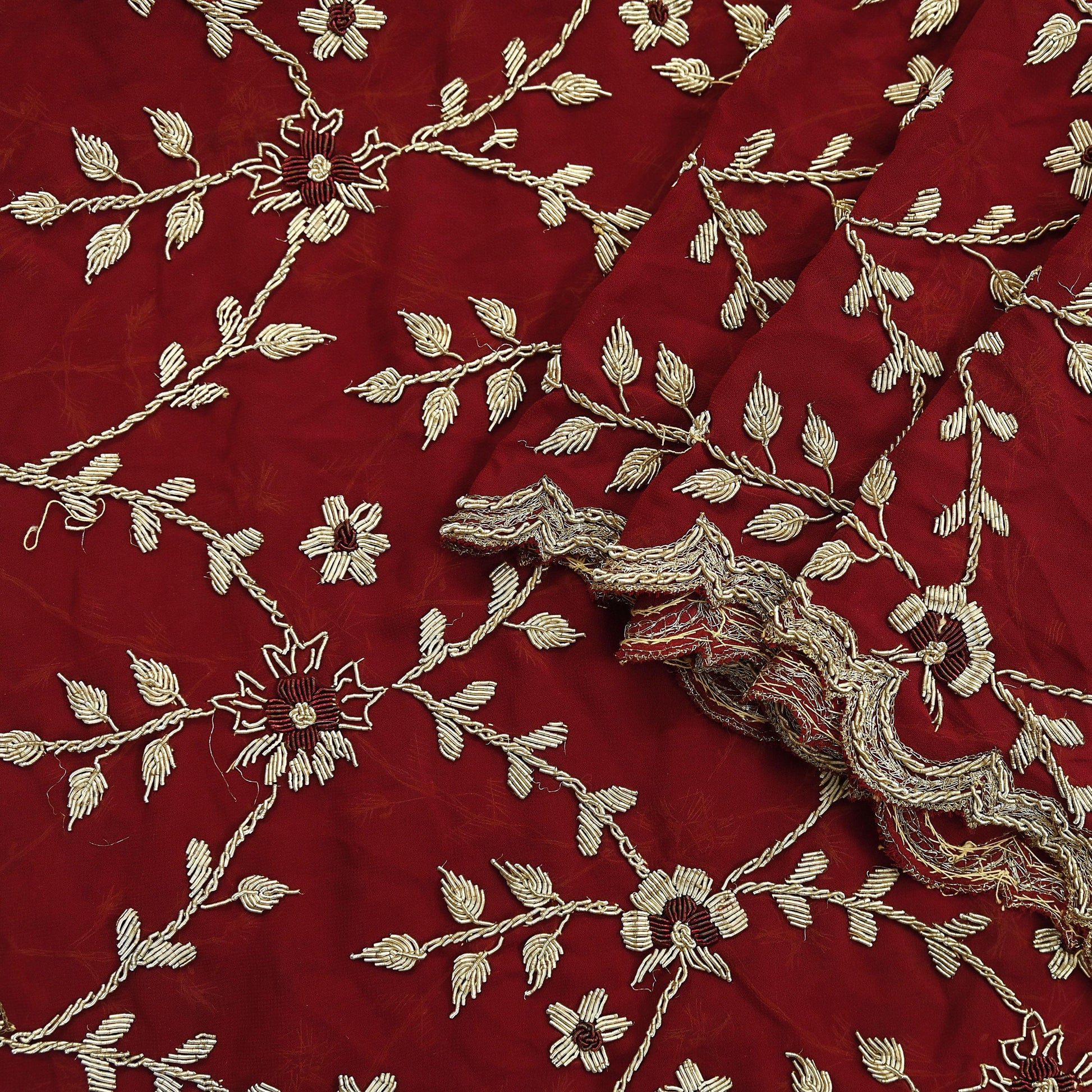 Elevate your traditional wardrobe with this luxurious maroon dupatta, a true heirloom piece crafted from 100% pure georgette silk. This stunning dupatta features a beautifully hand-embroidered floral border with pure metallic golden and maroon zardozi, dabka, and zari work, making it a true work of art.