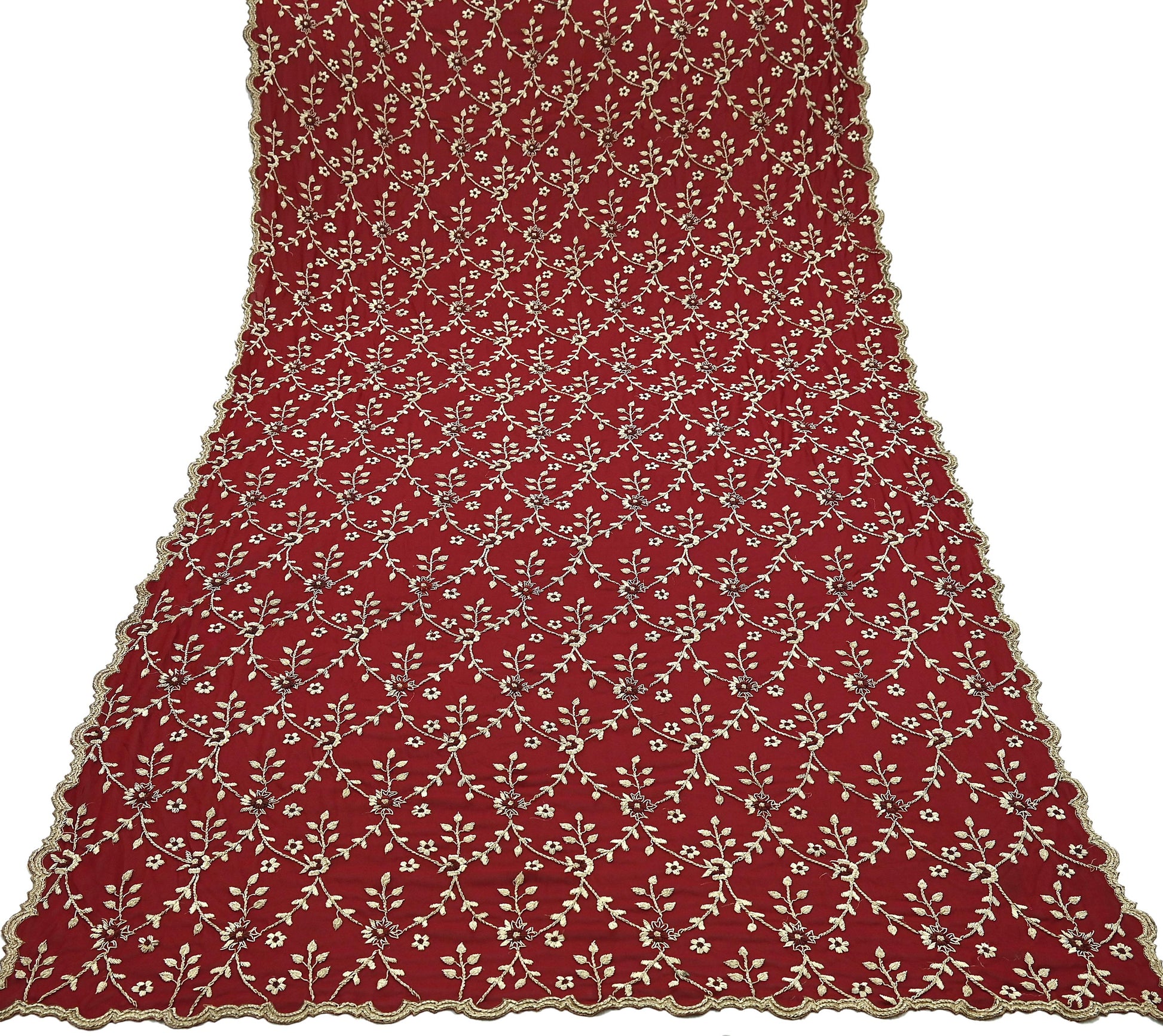 Indian Vintage Heavy Bridal Dupatta Maroon Pure Georgette Silk | Hand Embroidered Zardozi Zari Dabka Stole | Floral Wedding/Party Hijab Veil