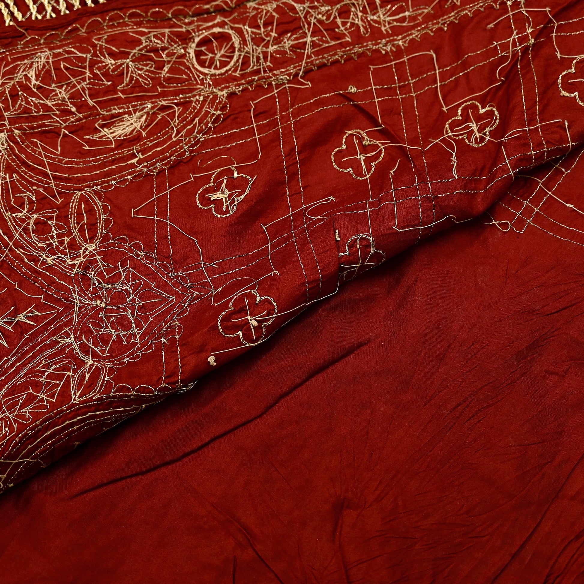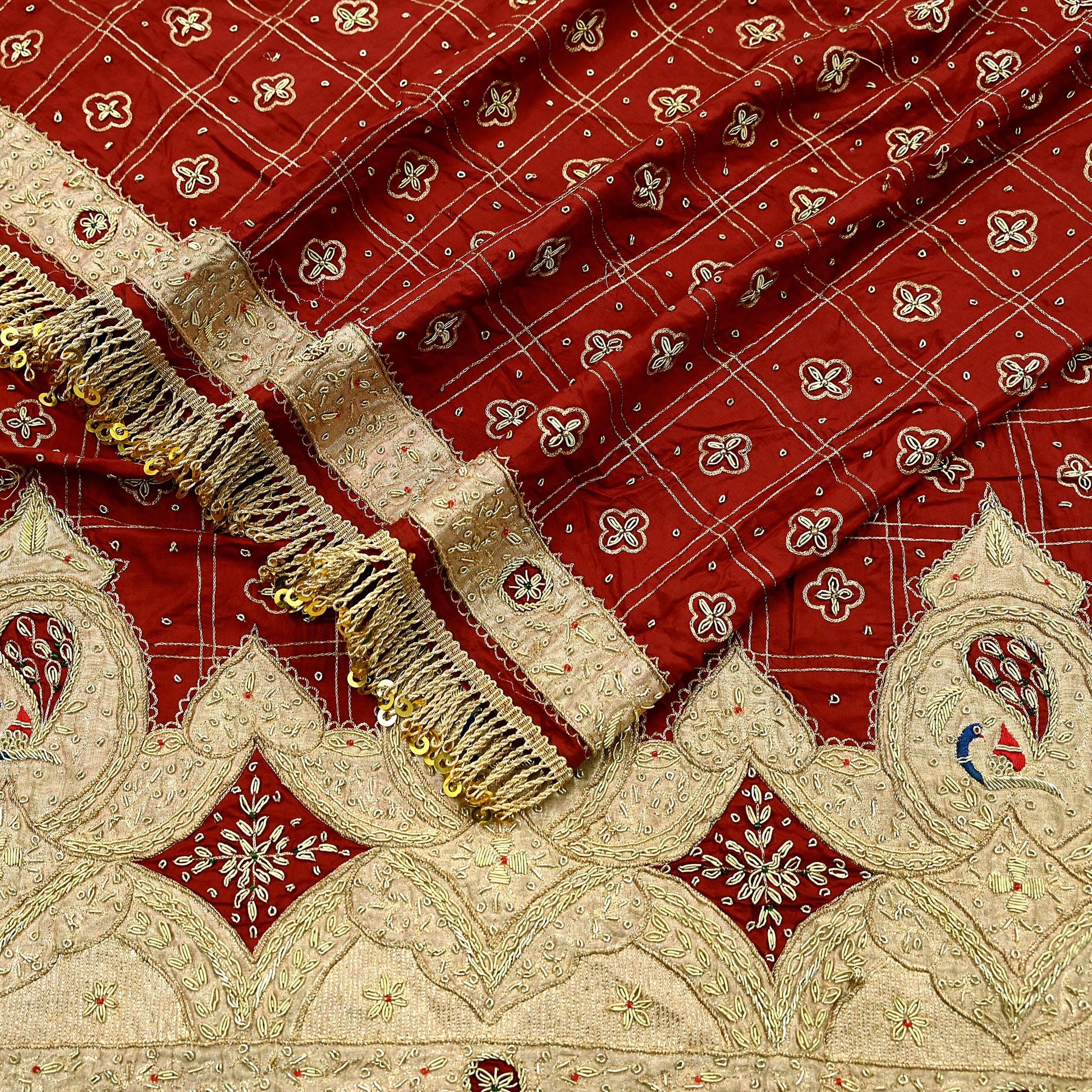 Stunning Very Heavy Dupatta Hand Embroidered 100% Pure Silk Dupatta/Stole In maroon Color Fabric. This one of a kind item is difficult to express in words. Border feature is Floral design embroidered pure metallic golden zardozi/ Dabka, Zari and Golden Sequins, Red & Green Beaded, Red & Blue Thread work embellished work is the highlight of the dupatta. Also you can see similar Zardozi work with floral pattern in center part adds to its beauty. Golden Fringes & Golden Tissue Silk Patch work is giving a fabulous look to the dupatta. Awesome one !!!