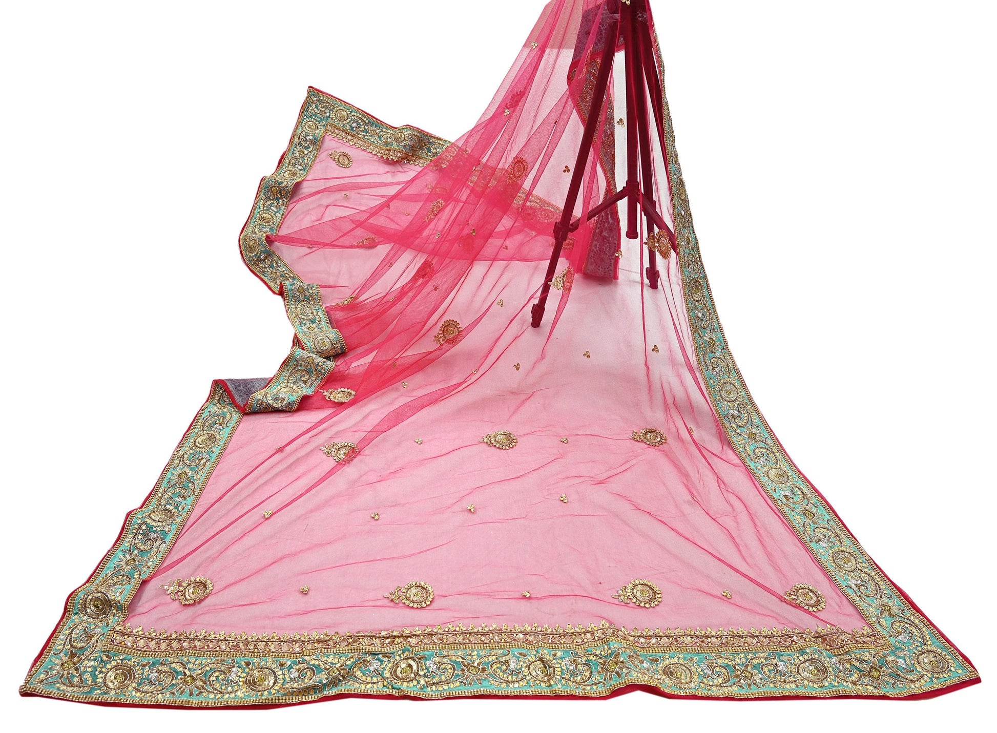 Indian Vintage Heavy Bridal Dupatta Pink Net Mesh Long Stole Hand Embroidered Scarves Silver Zardozi Dabka Zari Sequins Wedding Dupatta