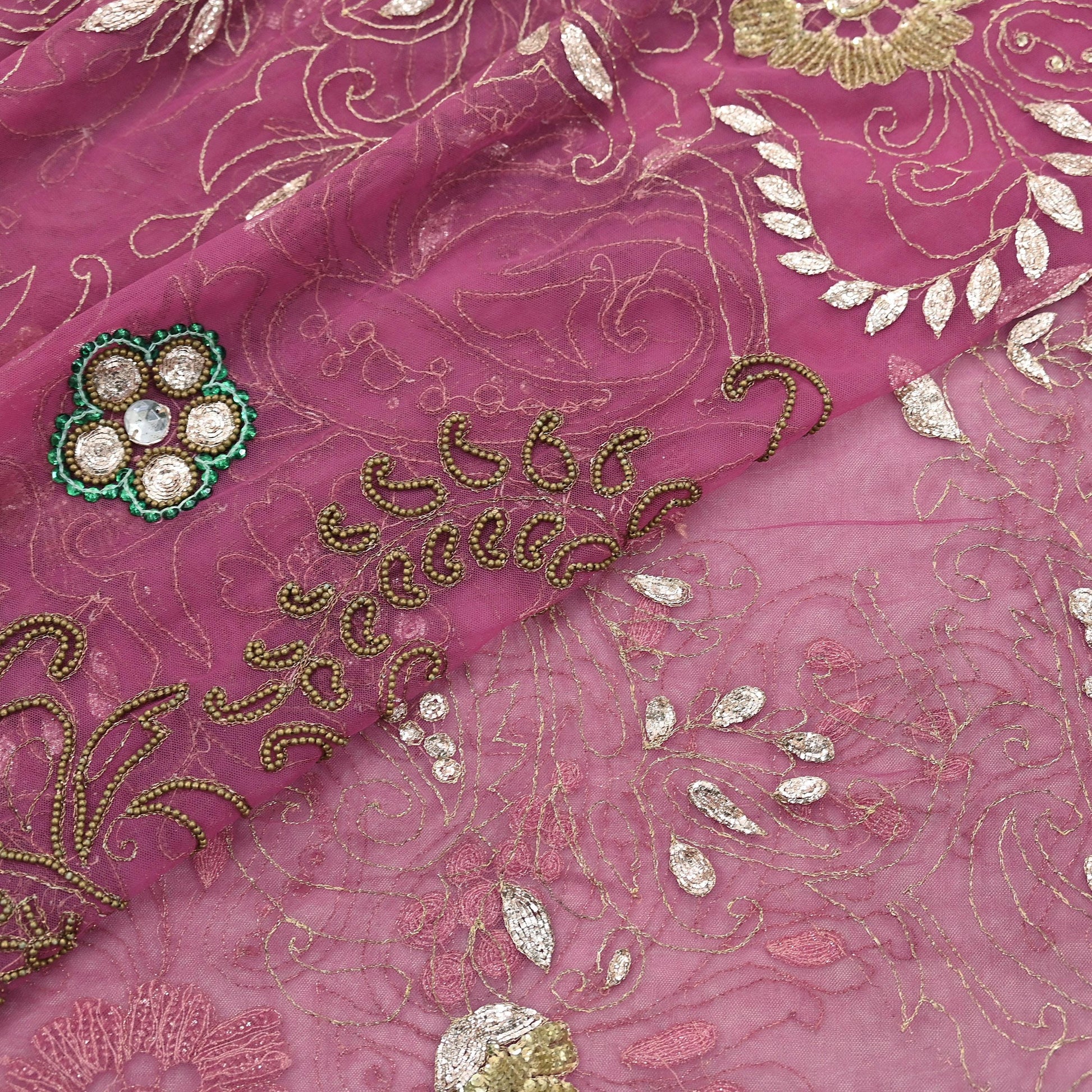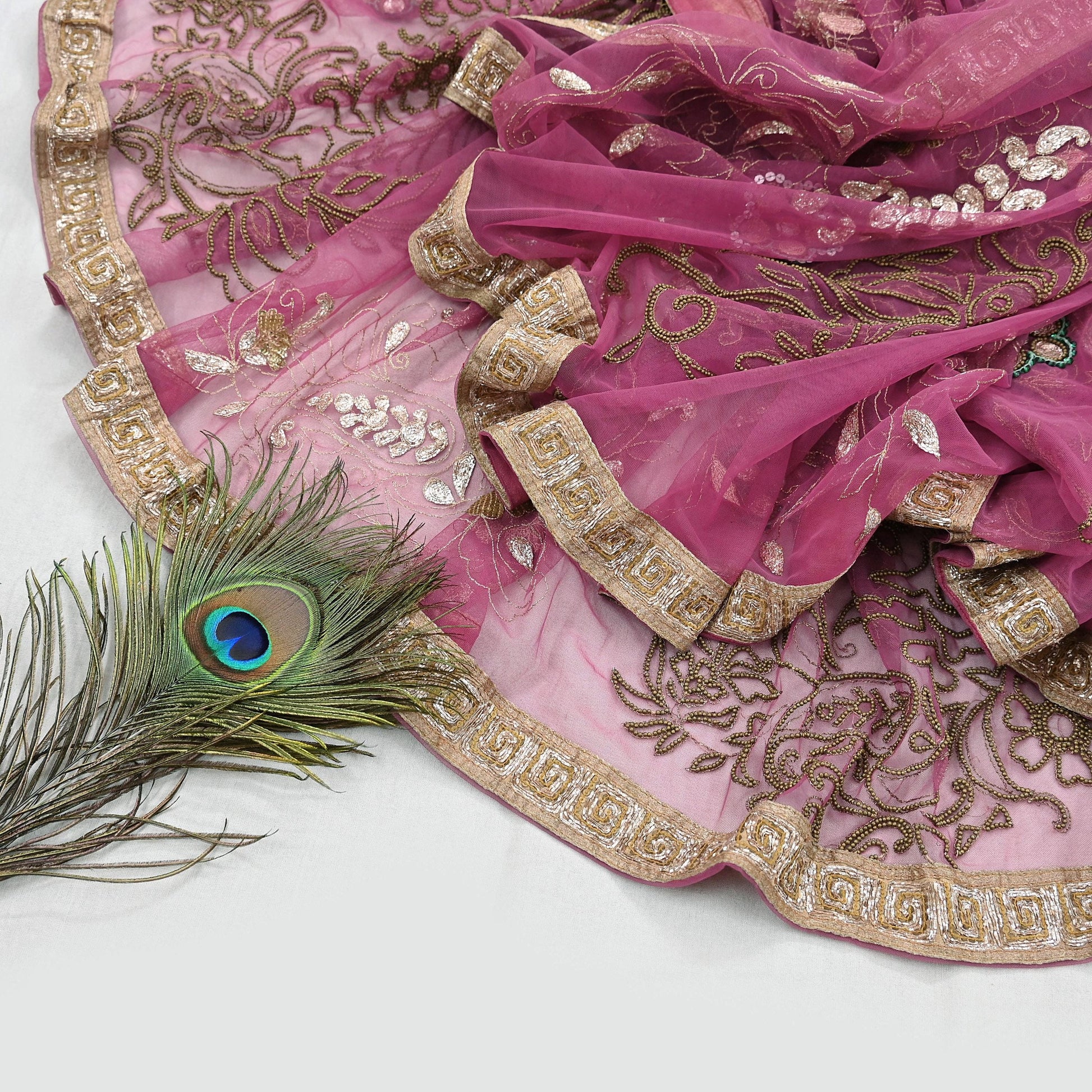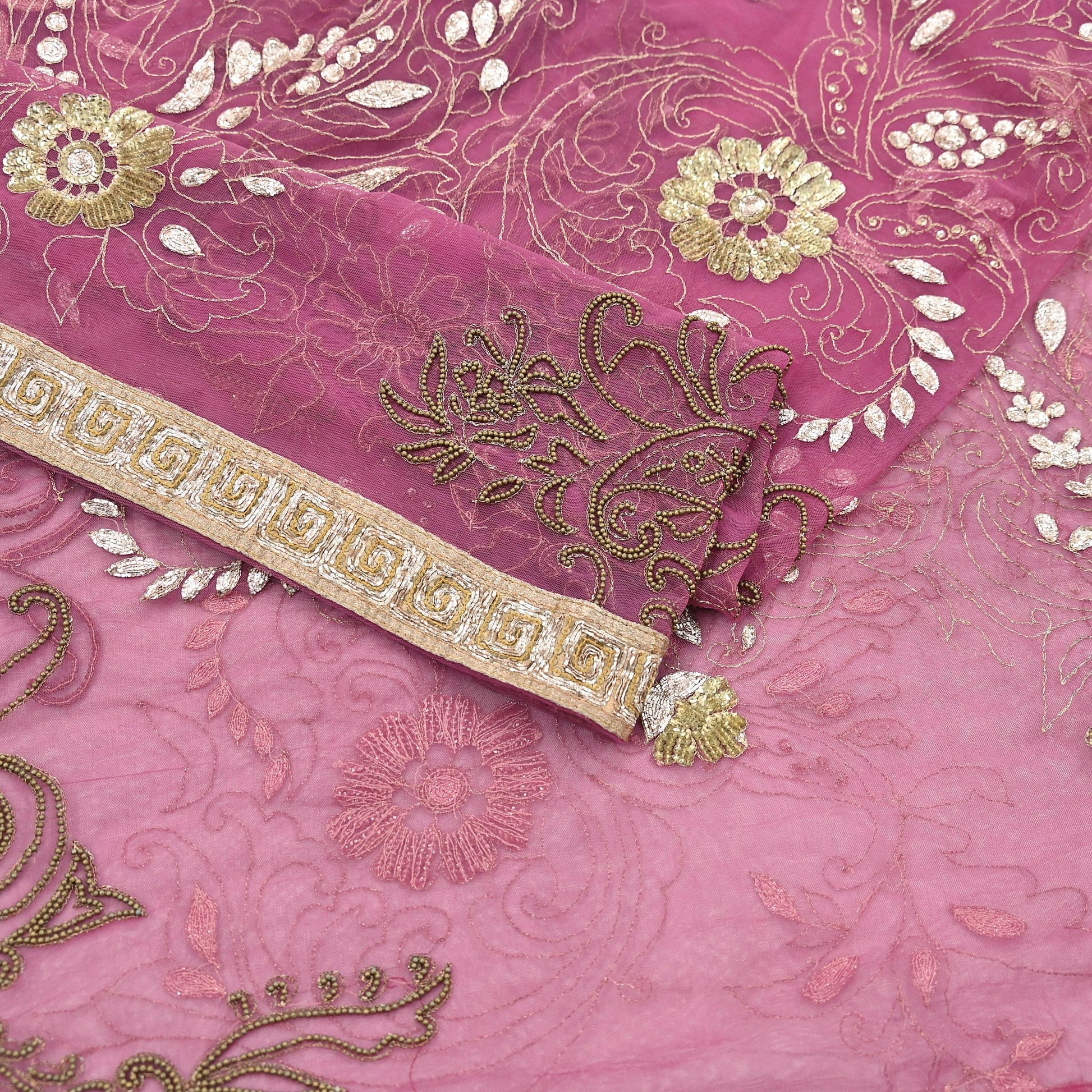 Stunning Beautiful Heavy Dupatta Hand Embroidered Net Dupatta/Stole In Pink Color Fabric. This one of a kind item is difficult to express in words. Border feature is floral design embroidered pure metallic Golden Dabka, zardozi/Zari And Golden sequins & Golden Beaded, work embellished work is the highlight of the dupatta. Also you can see similar work with floral pattern in center part adds to its beauty. Golden tissue Border work is giving a fabulous look to the dupatta. Awesome one !!!