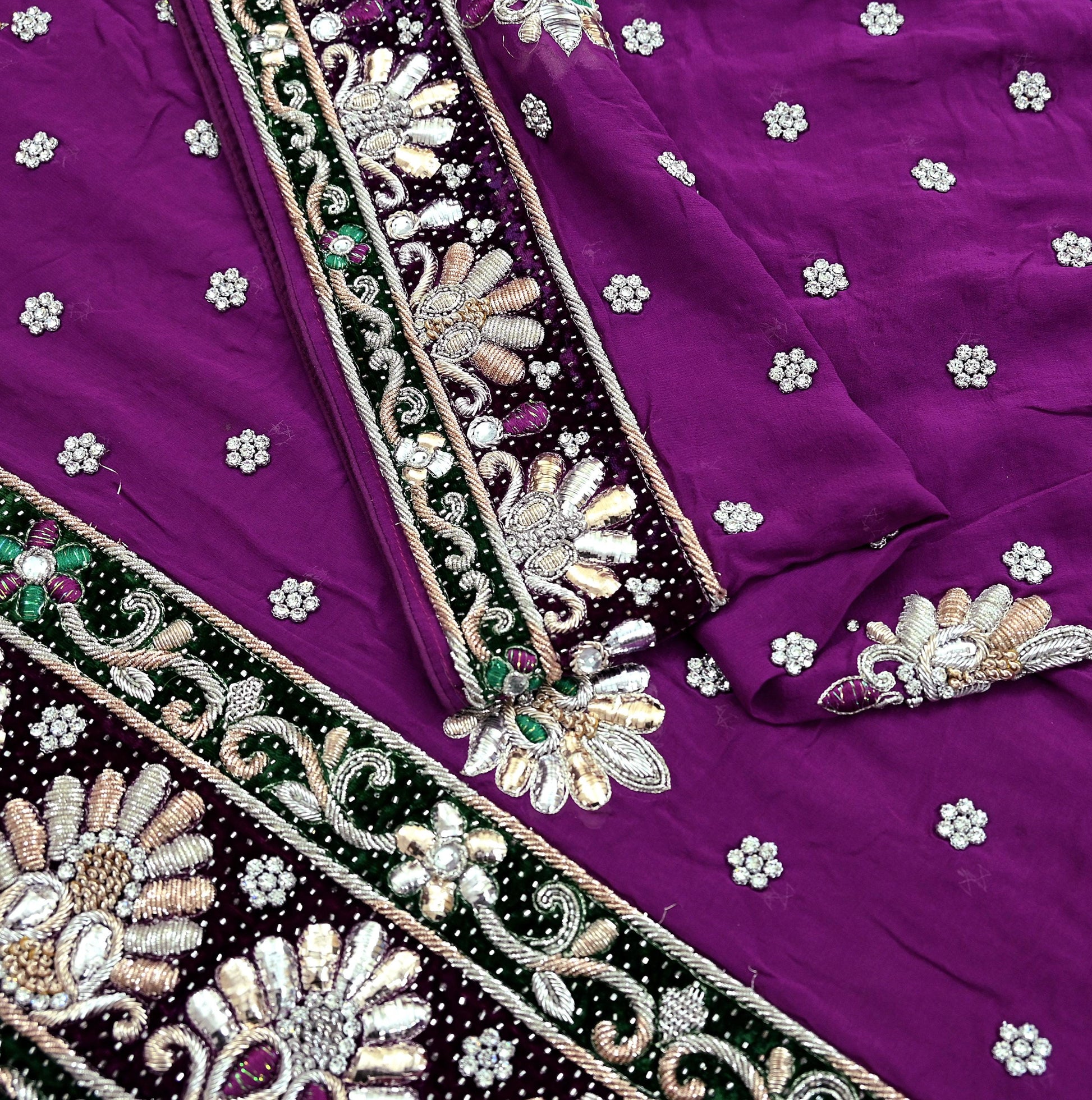 Stunning Very Heavy Dupatta Hand Embroidered 100% Pure Georgette Silk Dupatta/Stole In Purple Color Fabric. This one of a kind item is difficult to express in words. Border feature is Floral design embroidered pure metallic Golden, & Silver Orange zardozi/ Dabka, Zari and Golden & Silver Sequins, Silver Beaded, Purple & green Thread, Silver Golden Mukesh work embellished work is the highlight of the dupatta. Also you can see similar Zardozi work with floral pattern in center part adds to its beauty. Beautiful Purple & Green Velvet Border work is giving a fabulous look to the dupatta. Awesome one !!!