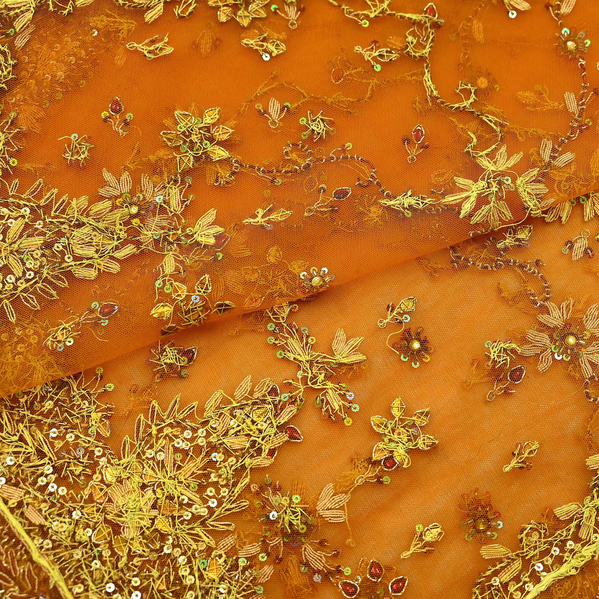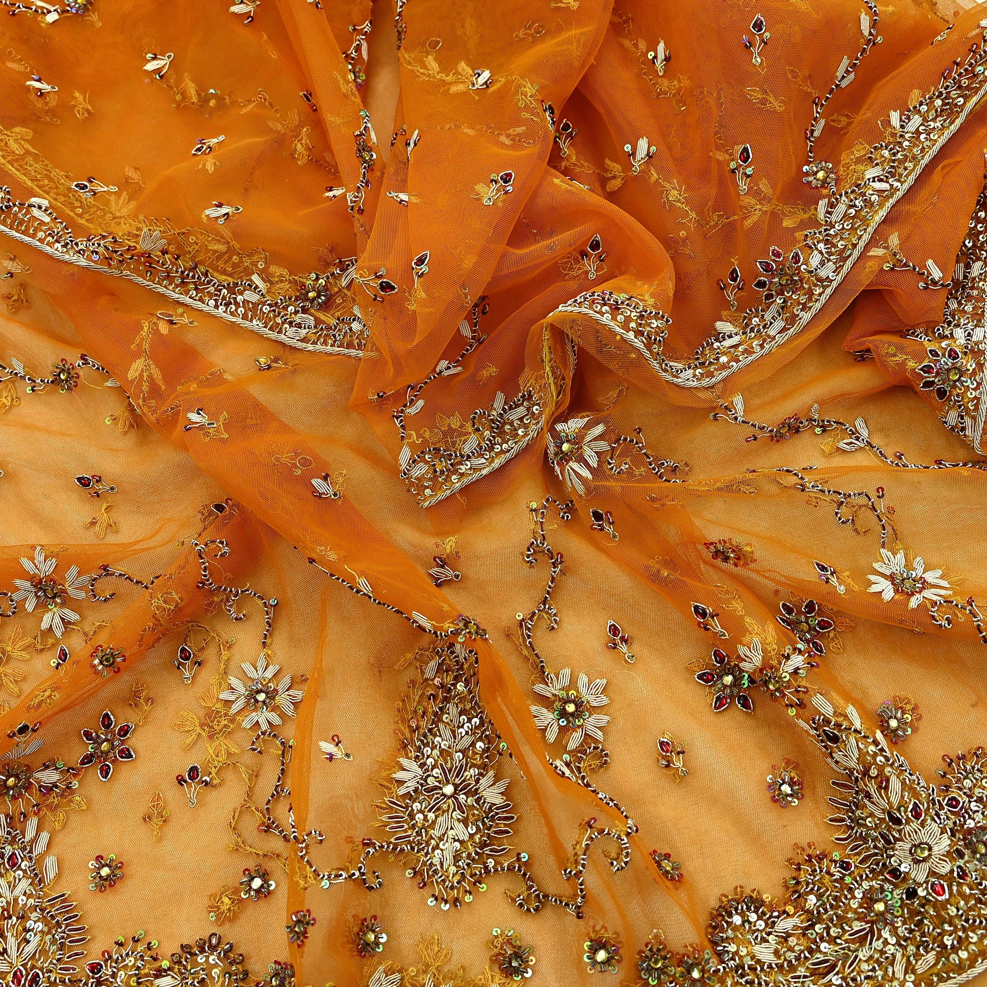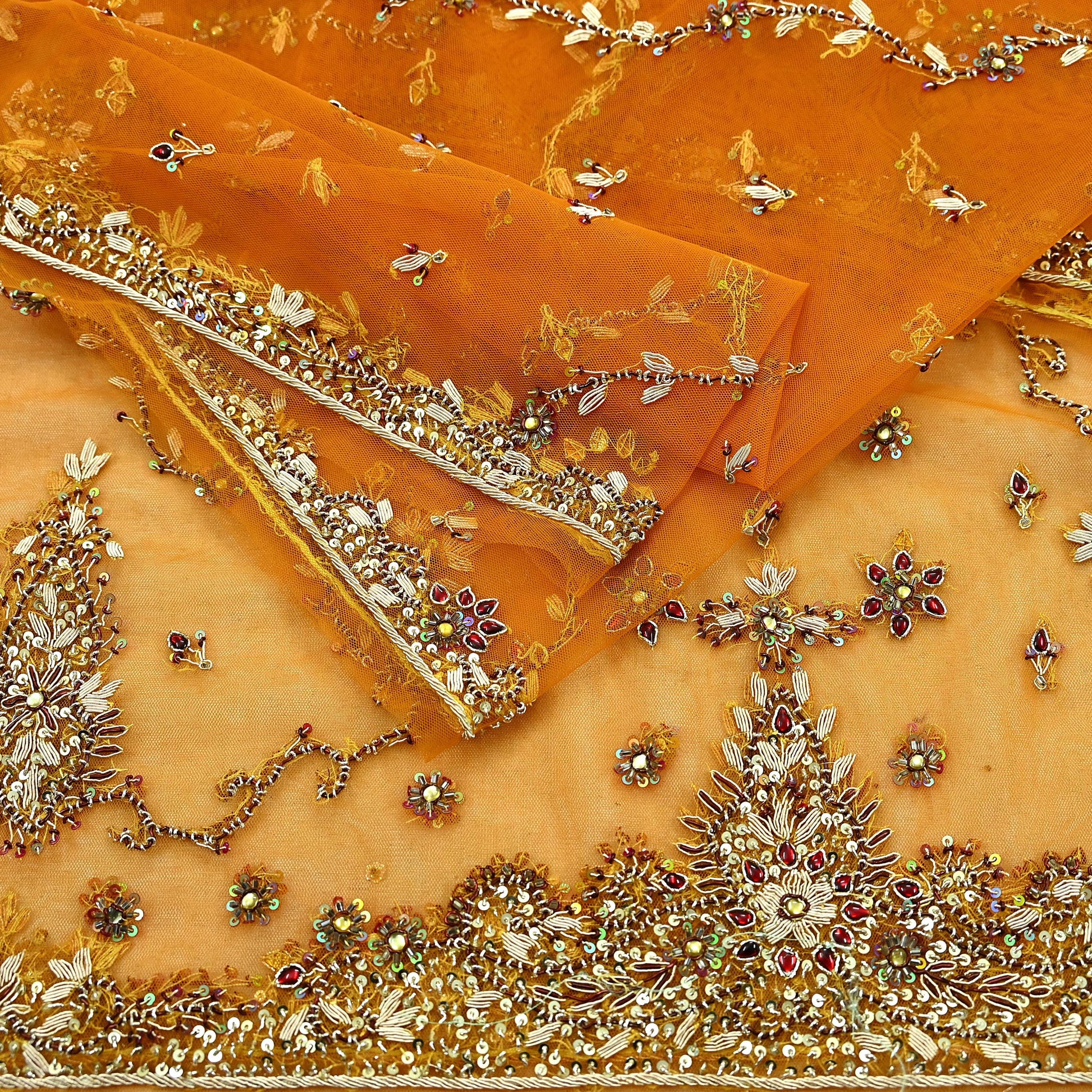 Stunning Beautiful Heavy Dupatta Hand Embroidered Net Dupatta/Stole In Saffron Color Fabric. This one of a kind item is difficult to express in words. Border feature is floral design embroidered pure metallic golden & Maroon zardozi, Multi Sequins, Yellow Kundan Beaded work embellished work is the highlight of the dupatta. Also you can see similar Zardozi, White Beaded & Golden Sequins work with floral pattern in center part adds to its beauty. Zardozi work is giving a fabulous look to the dupatta. Awesome one !!!