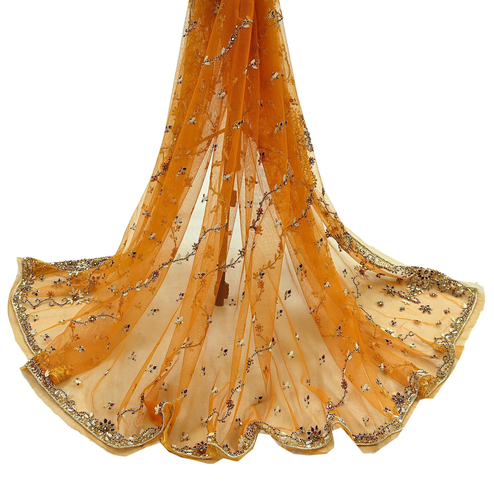 Indian Vintage Heavy Bridal Dupatta Saffron Net Mesh Long Stole Hand Embroidered Scarves Golden Zardozi Zari Sequins Wedding hijab