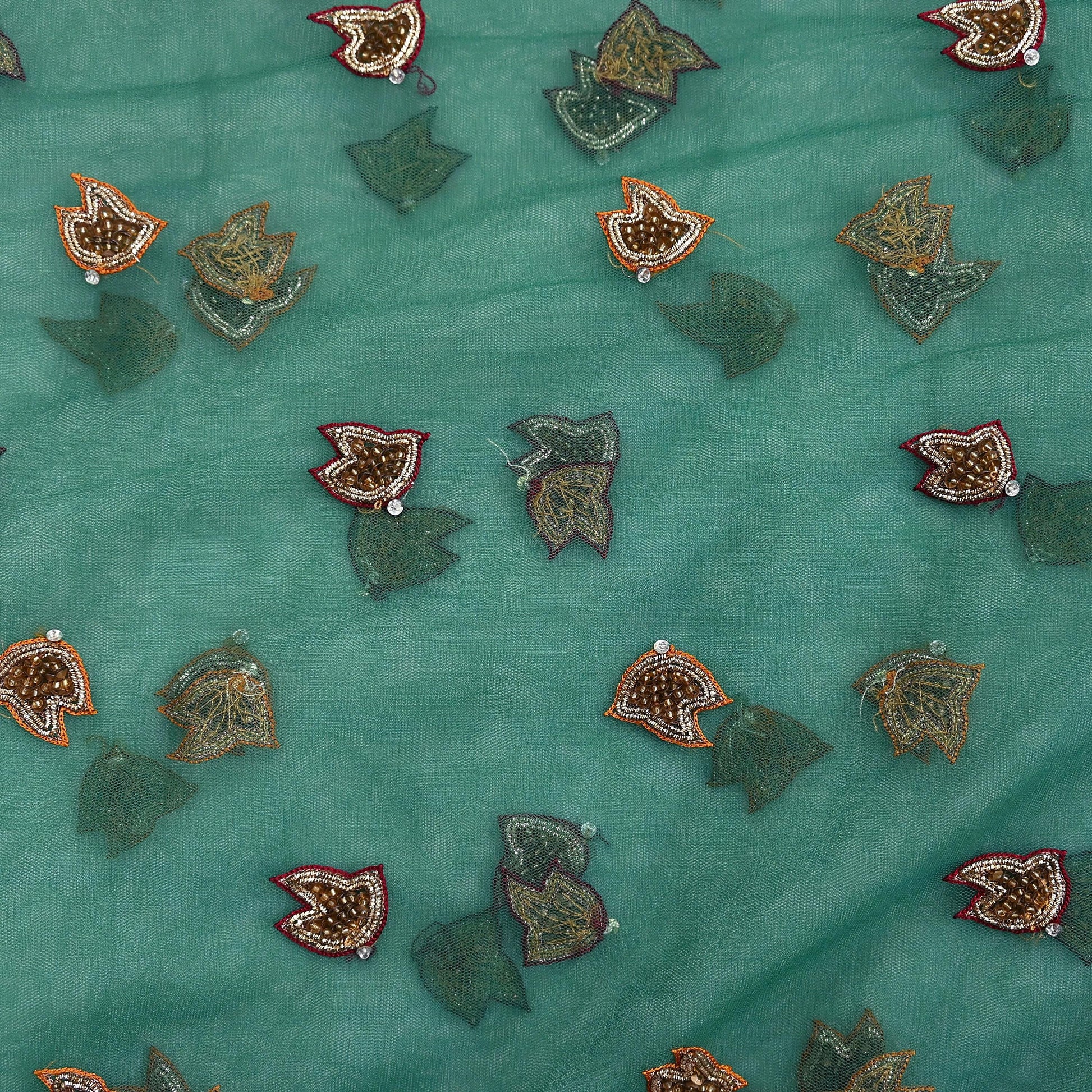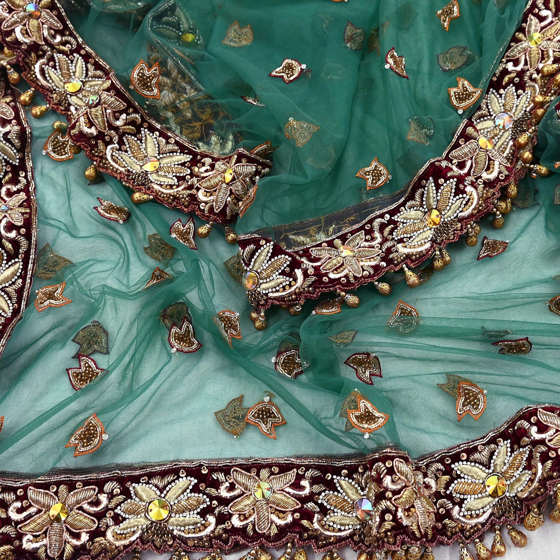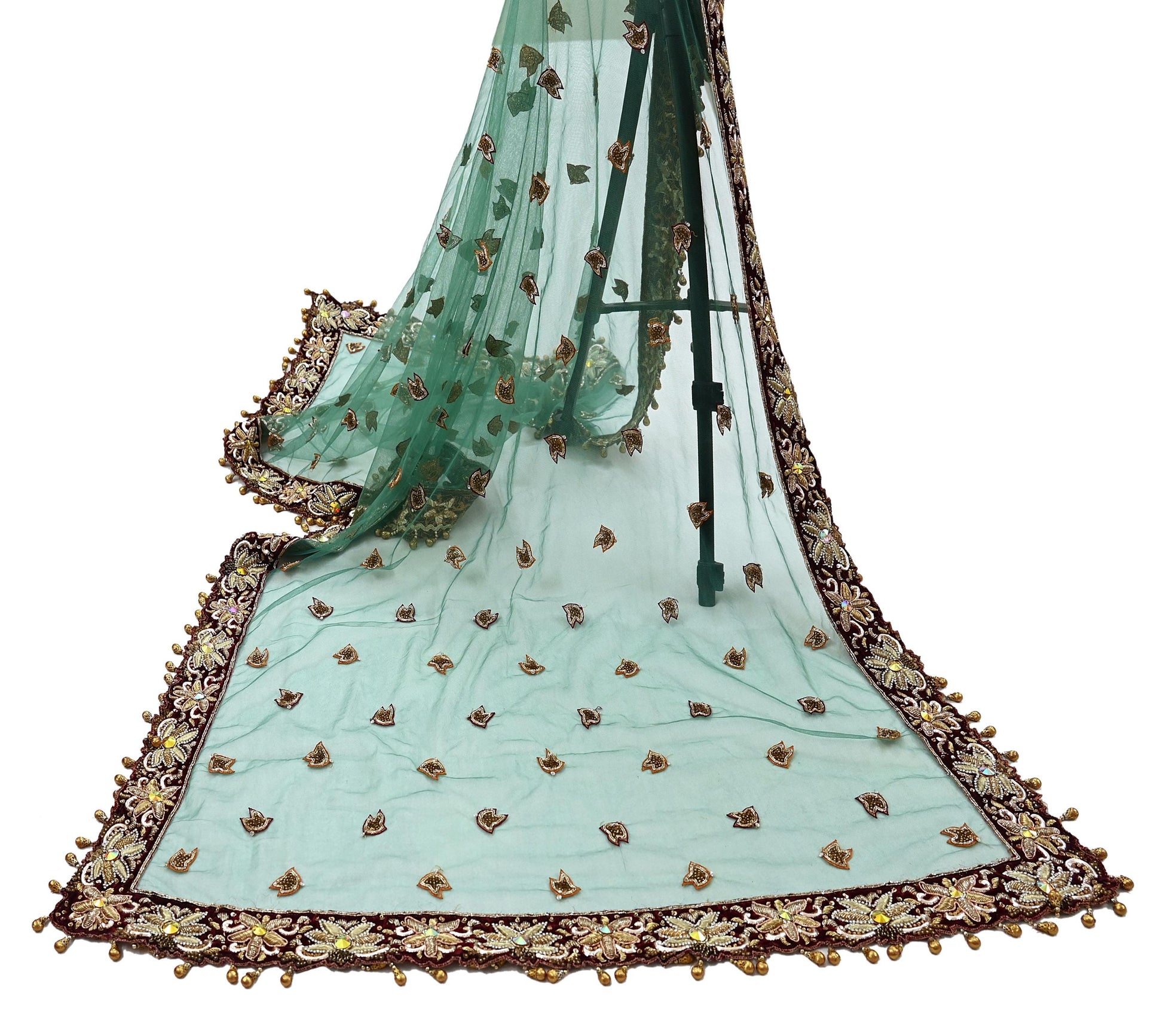 Indian Vintage Heavy Bridal Green Dupatta Net Mesh Long Stole Hand Embroidered Scarf Zardozi Zari Sequins Wedding Stole Veil hijab