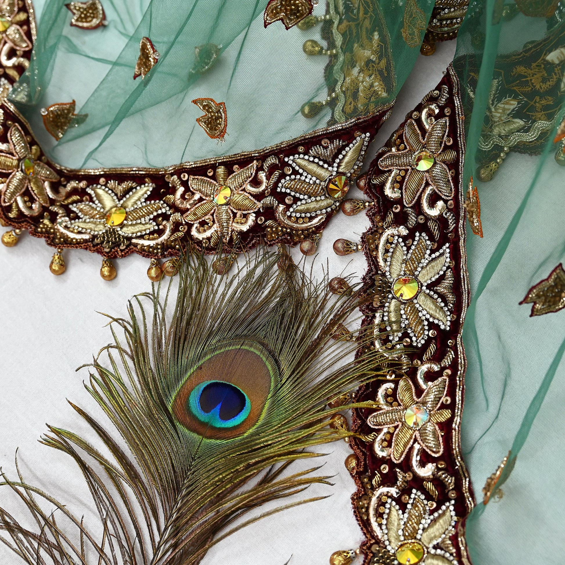 Stunning Beautiful Heavy Dupatta Hand Embroidered Net Dupatta/Stole In Green Color Fabric. This one of a kind item is difficult to express in words. Border feature is floral & Paisley design embroidered Golden Sequins, pure metallic Golden zardozi/Dabka/Zari And Golden Glass Stone/Beaded, Green Stone, Mukesh work embellished work is the highlight of the dupatta. Also you can see similar Zardozi, Beaded work with floral pattern in center part adds to its beauty. Maroon Velvet Border work is giving a fabulous look to the dupatta. Awesome one !!!