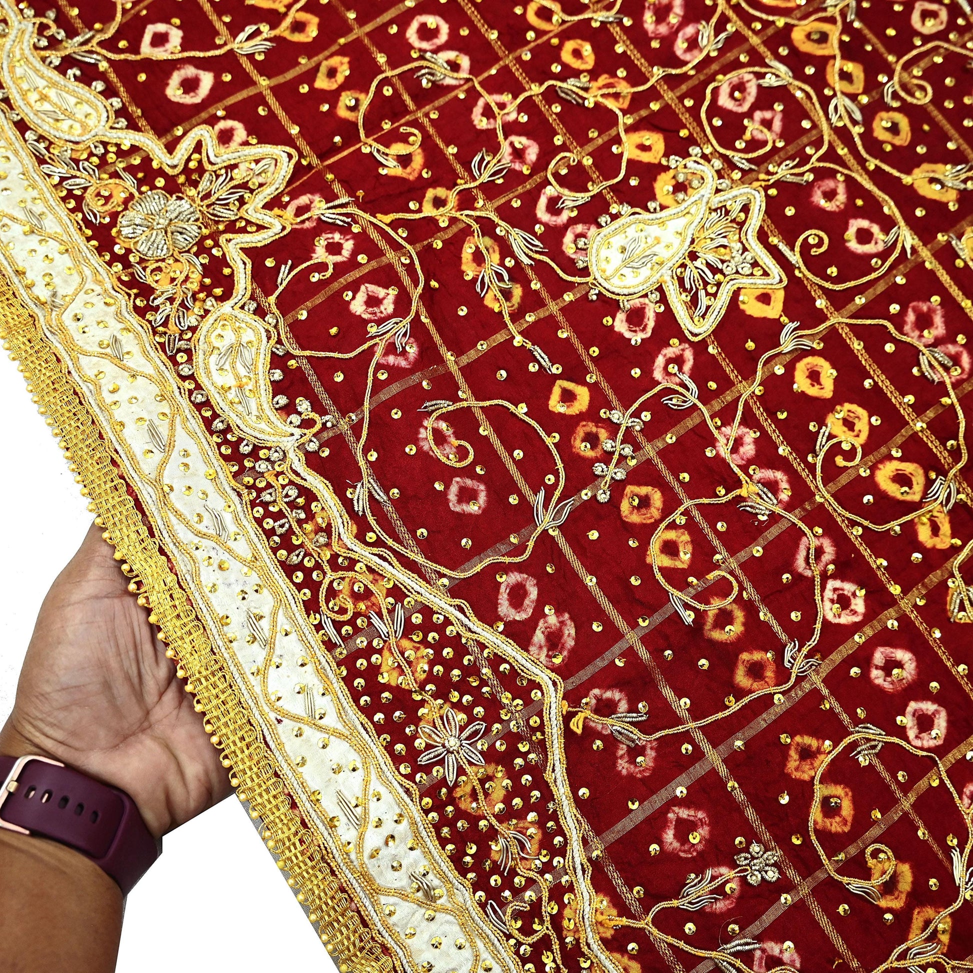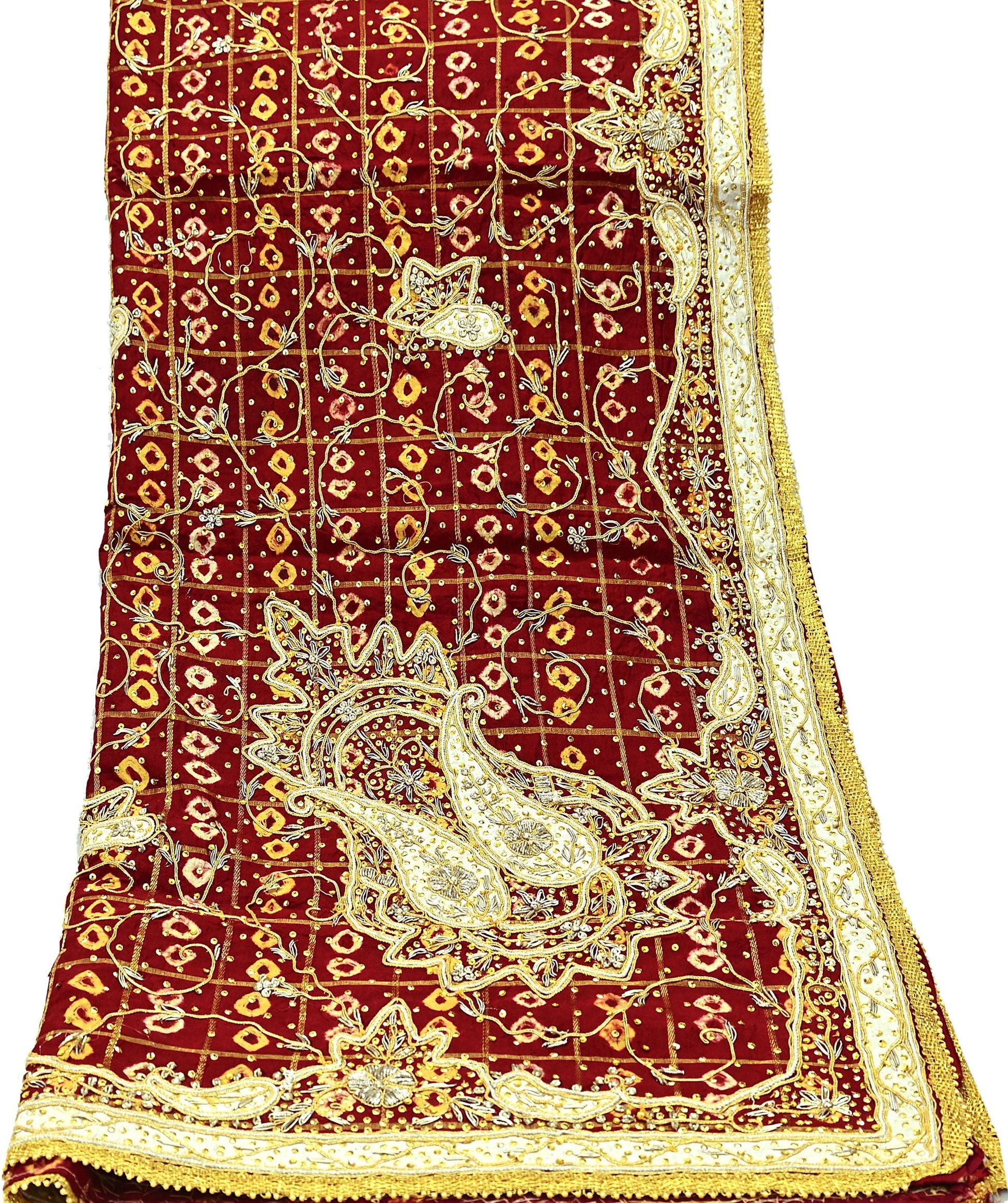 Indian Vintage Heavy Bridal Maroon Dupatta Pure Cotton Long Stole Hand Embroidered Bandhani Gharchola Scarves Wedding/Party Wear Peacock