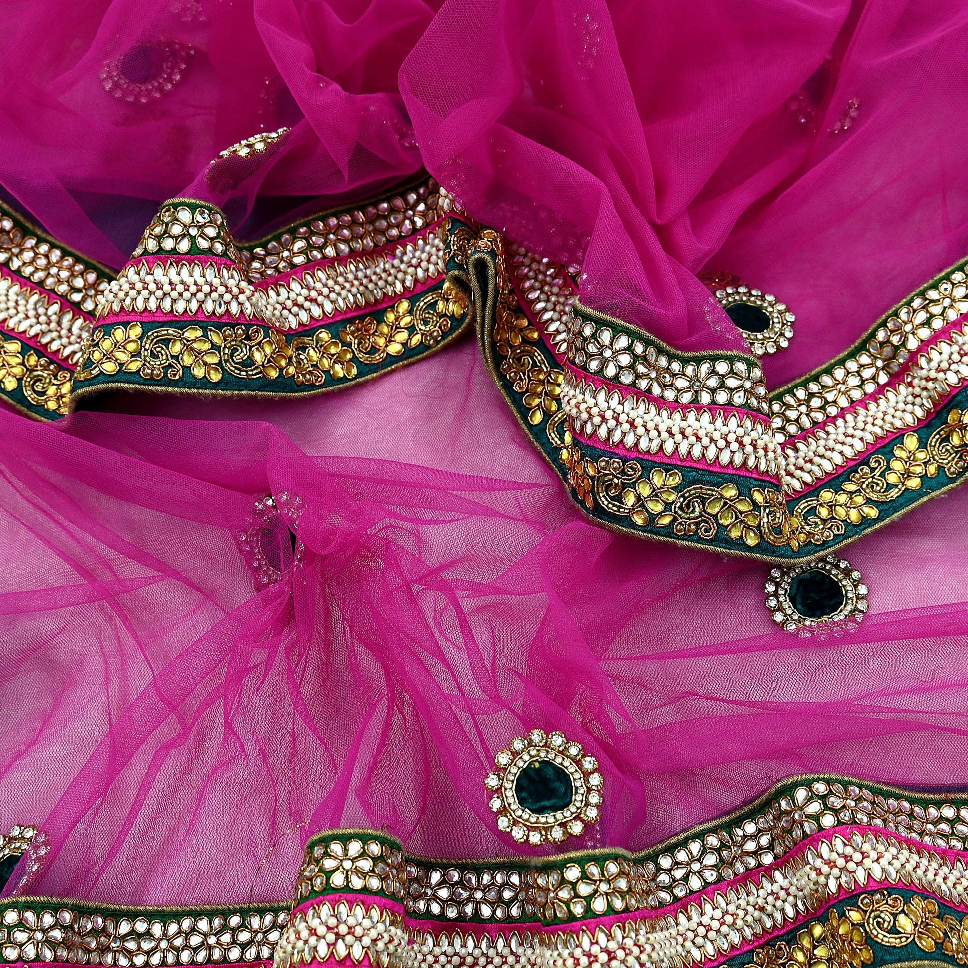 The center portion is equally stunning, embellished with:, Pure metallic golden Zardozi/Dabka Zari, White Beaded Work floral motifs