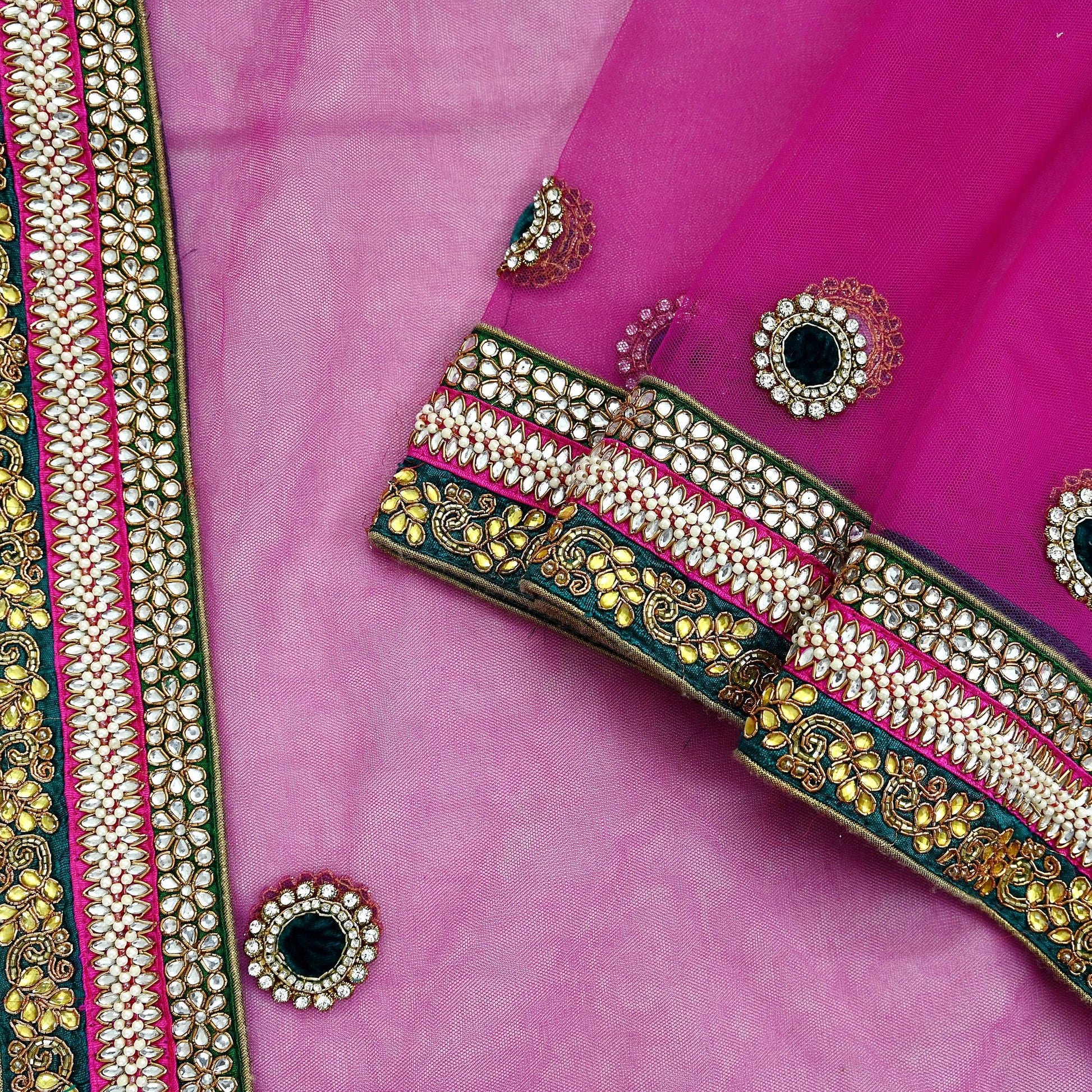 Luxurious border work featuring floral designs hand-embroidered with: