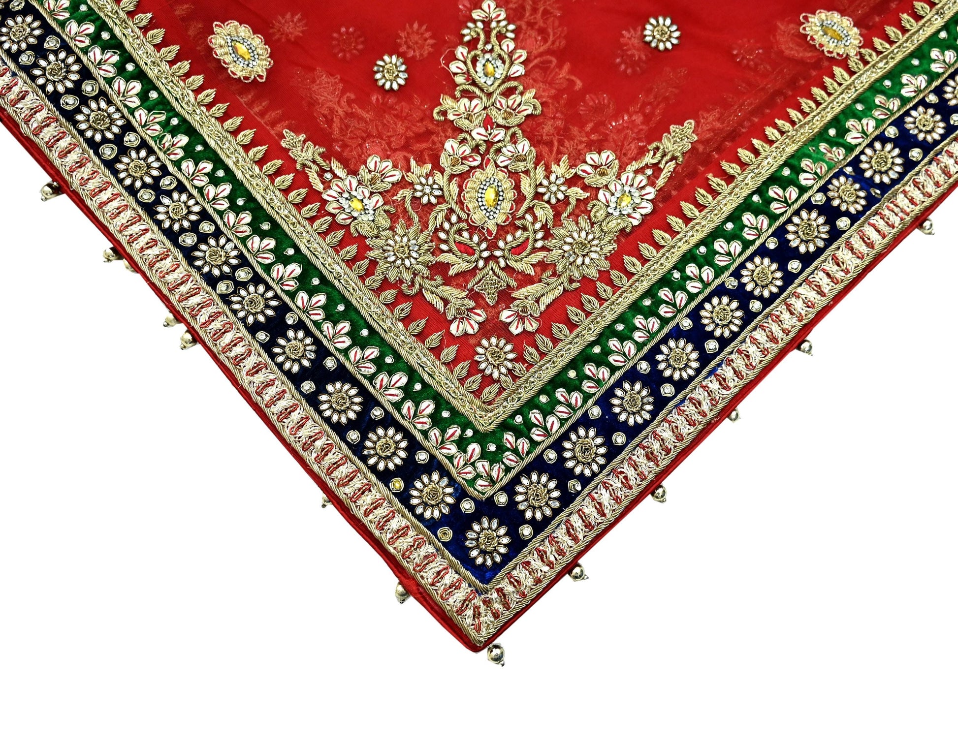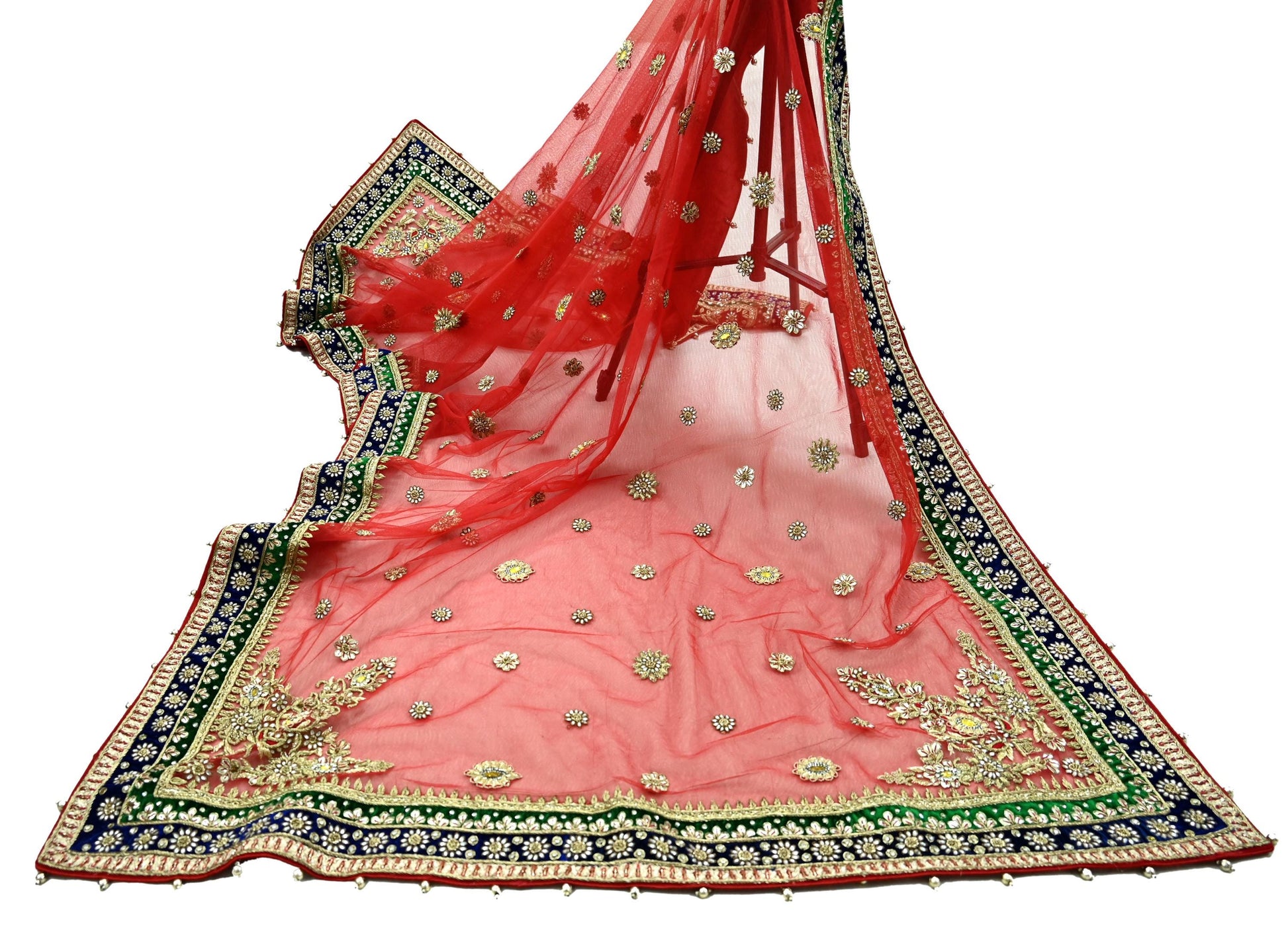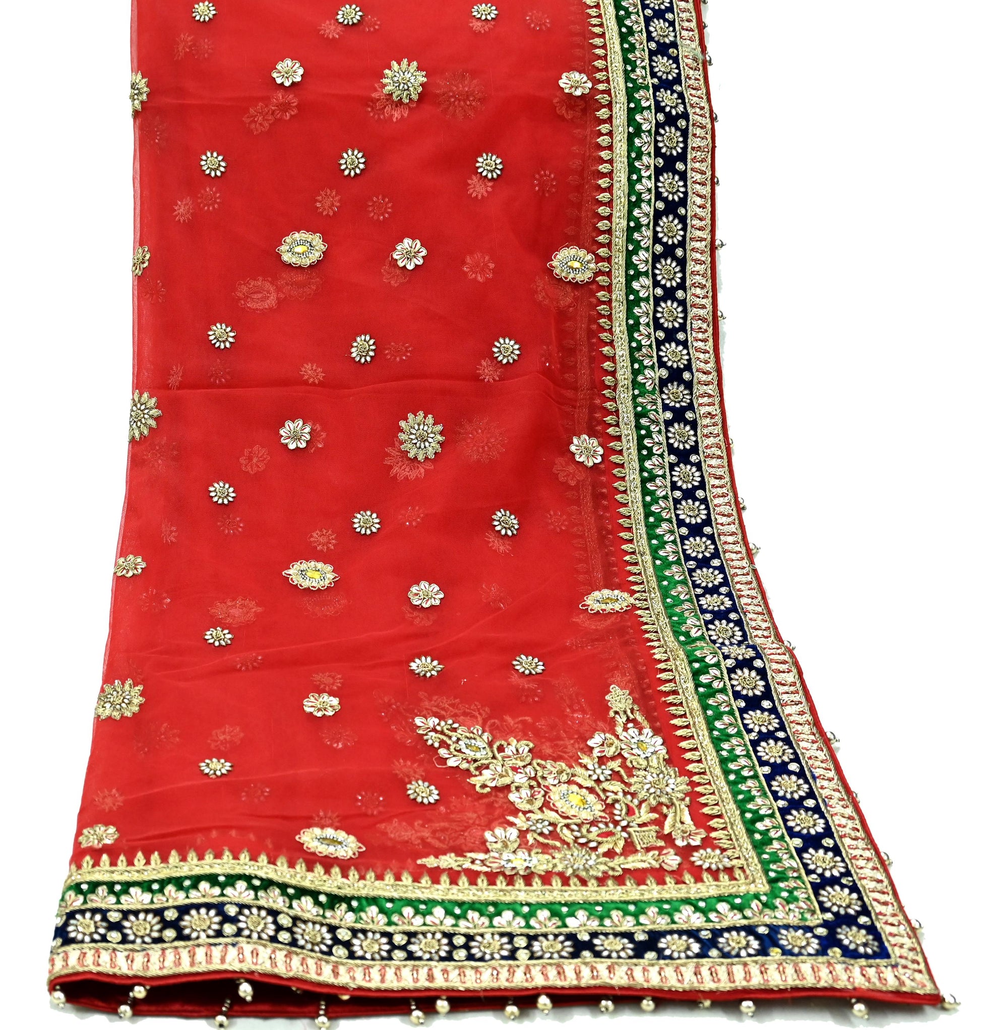 Stunning Beautiful Heavy Dupatta Hand Embroidered Net Dupatta/Stole In Red Color Fabric. This one of a kind item is difficult to express in words. Border feature is floral design embroidered pure metallic Golden & Red zardozi/Dabka Zari And Golden sequins, Yellow & White Stone, Golden Glass Beaded work embellished work is the highlight of the dupatta. Also you can see similar Zardozi, Beaded & Multi Sequins work with floral pattern in center part adds to its beauty. Green & Blue Velvet Border work is giving a fabulous look to the dupatta. Awesome one !!!