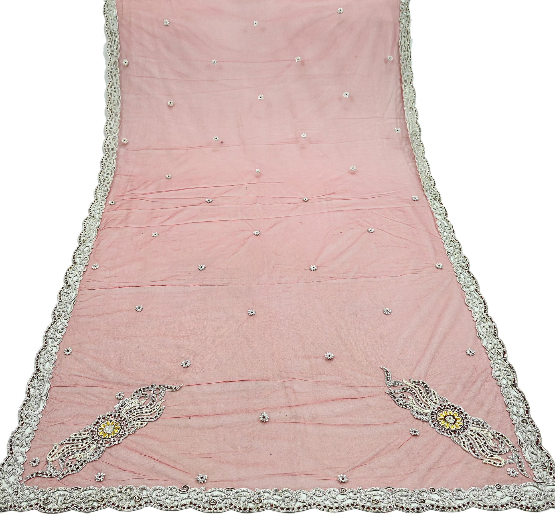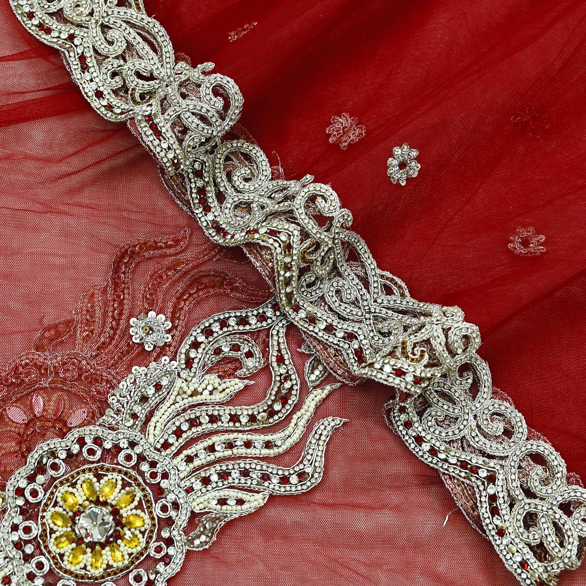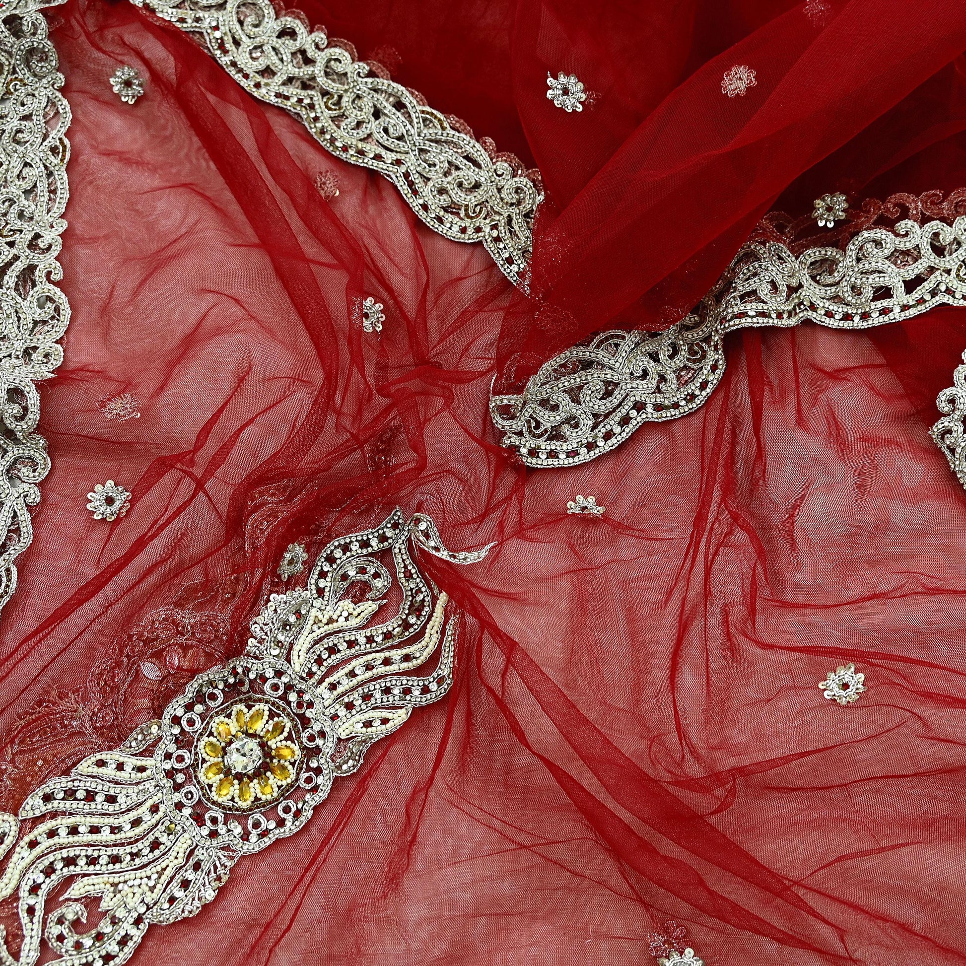 Stunning Beautiful Heavy Dupatta Hand Embroidered Net Dupatta/Stole In Red Color Fabric. This one of a kind item is difficult to express in words. Border feature is floral & Paisley design embroidered pure metallic Silver zardozi/ Dabka, Zari, White Glass Beaded, Silver sequins, White, Yellow & Red Stone work embellished work is the highlight of the dupatta. Also you can see similar Zardozi, Beaded work with floral pattern in center part adds to its beauty. Cut work Border is giving a fabulous look to the dupatta. Awesome one !!!