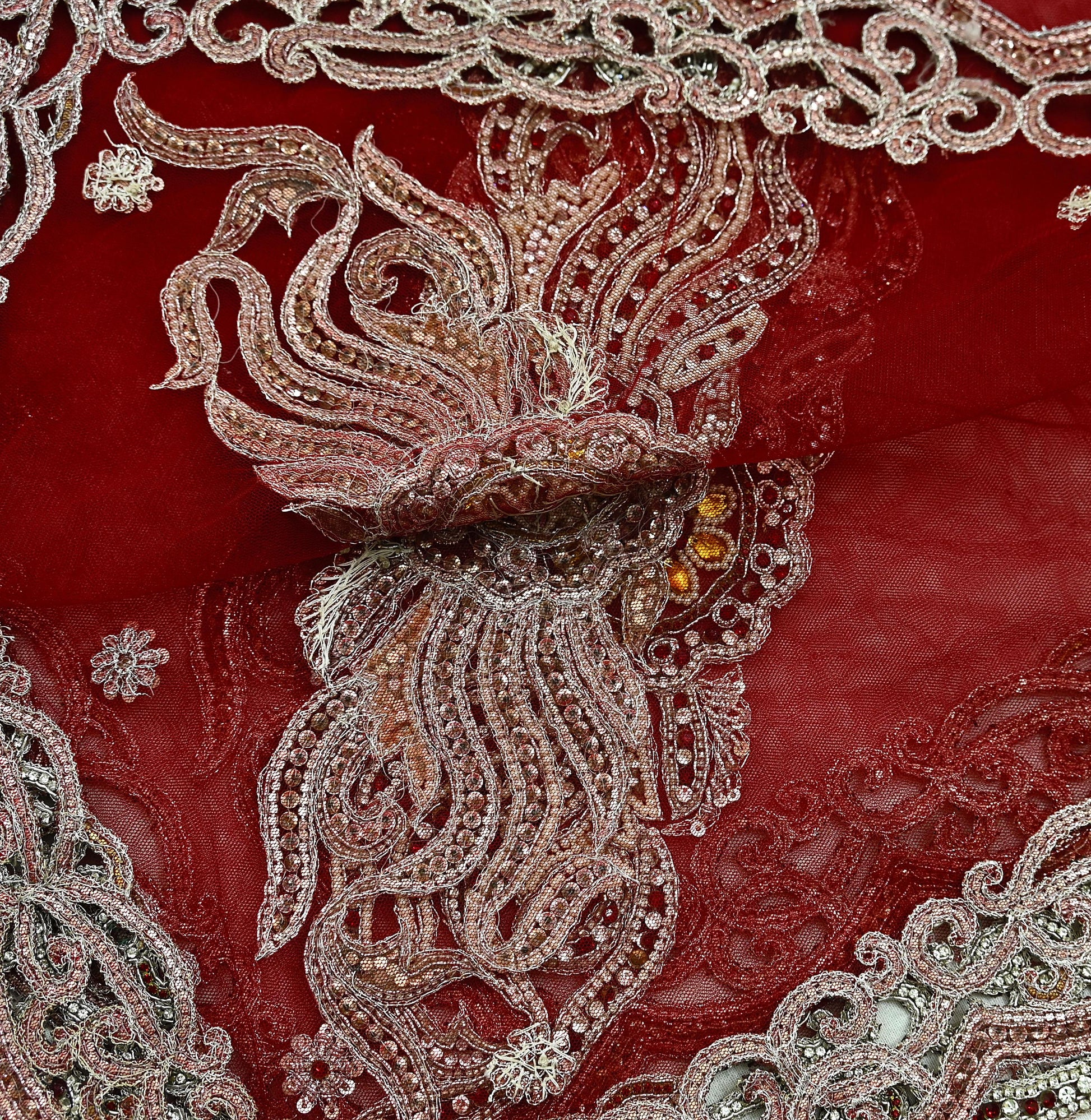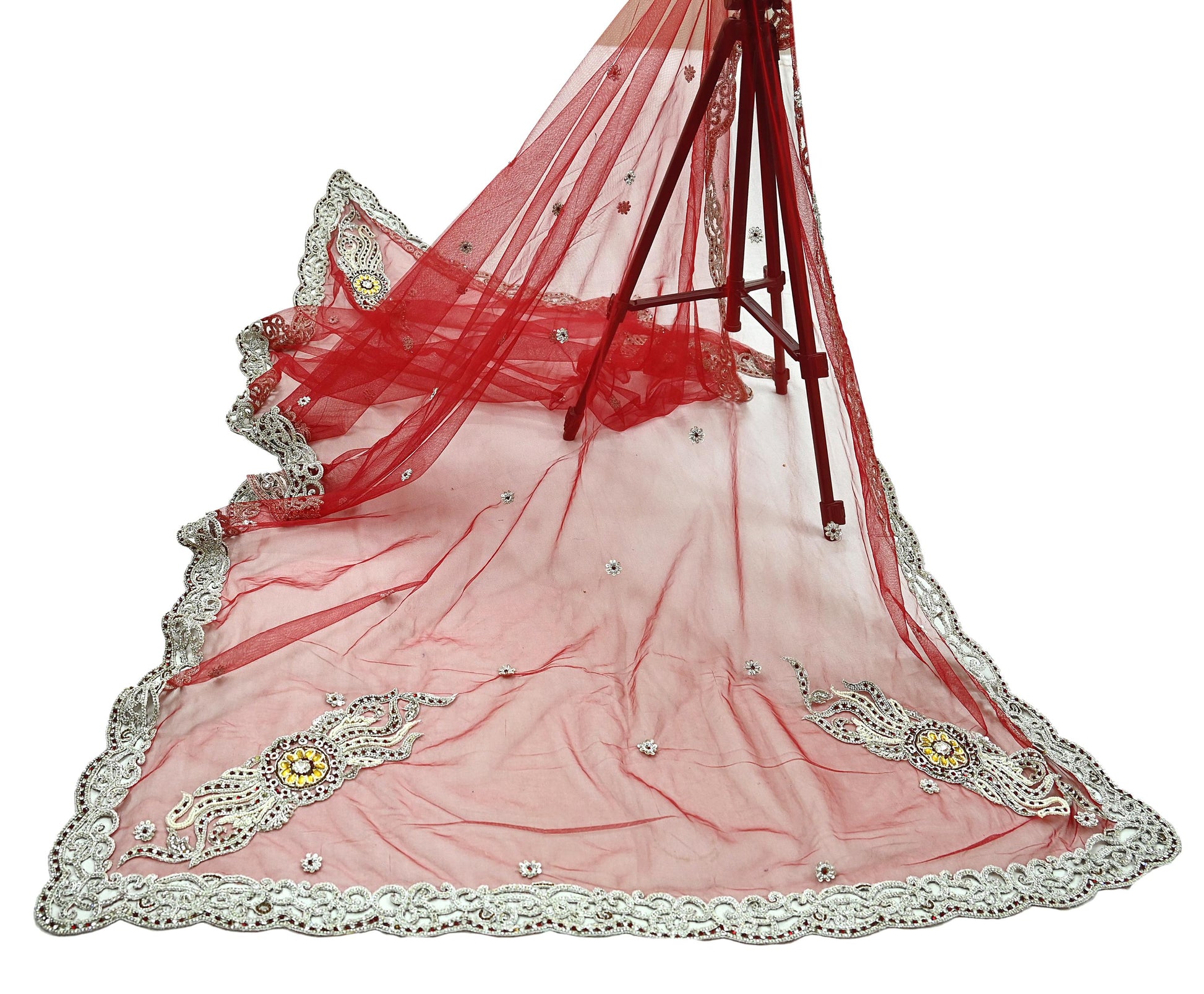 Indian Vintage Heavy Bridal Red Dupatta Net Mesh Long Stole Hand Embroidered Scarves Zardozi Dabka Zari Wedding dupatta veil hijab