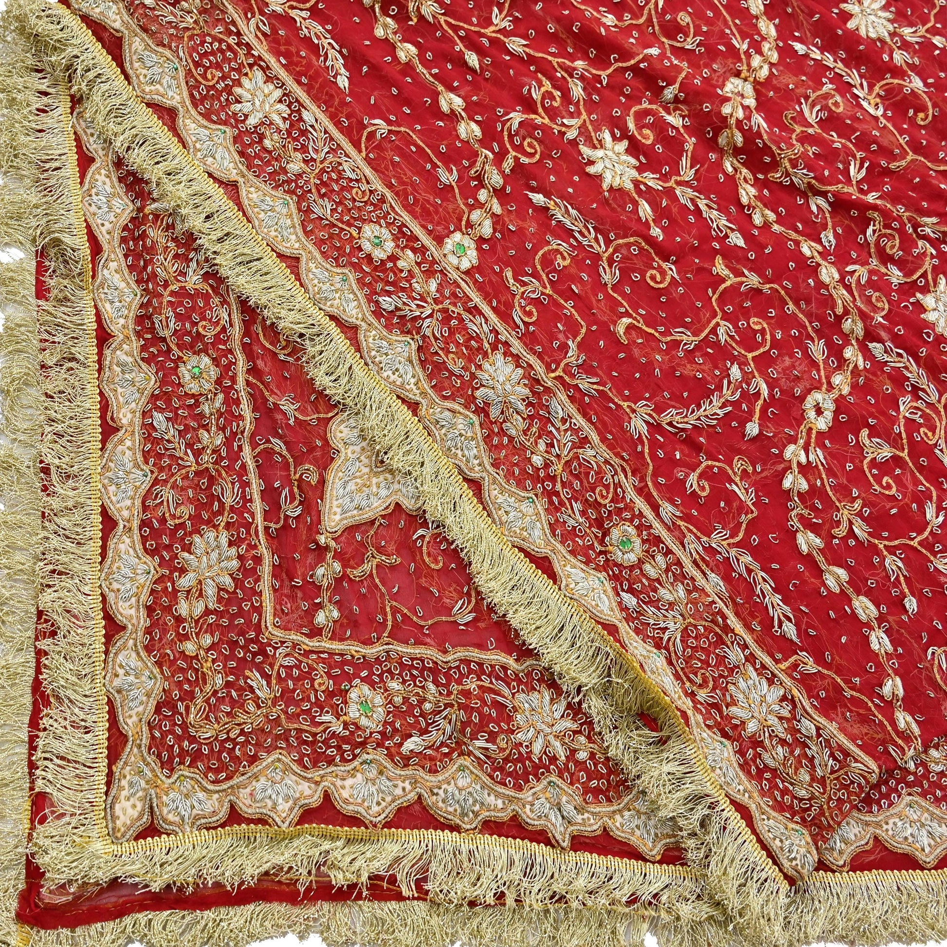 Stunning Very Heavy Dupatta Hand Embroidered 100% Pure Chiffon Silk Dupatta/Stole In Red Color Fabric. This one of a kind item is difficult to express in words. Border feature is Floral design embroidered pure metallic golden zardozi/ Dabka, Zari and green stones, green Pearl Like Bead work embellished work is the highlight of the dupatta. Also you can see similar Zardozi work with floral pattern in center part adds to its beauty. Beautiful Golden Fringes Border & White Silk patch work is giving a fabulous look to the dupatta. Awesome one !!!