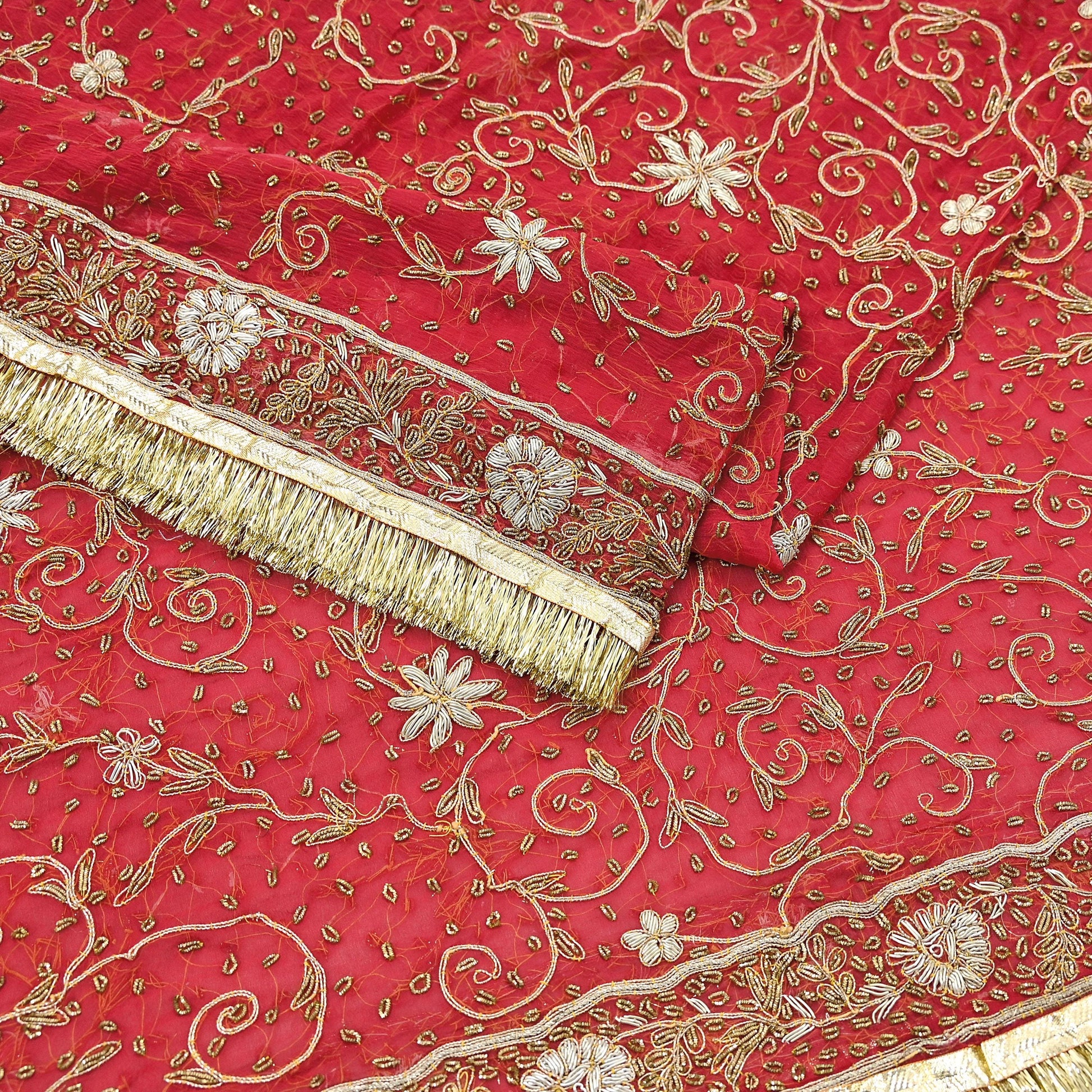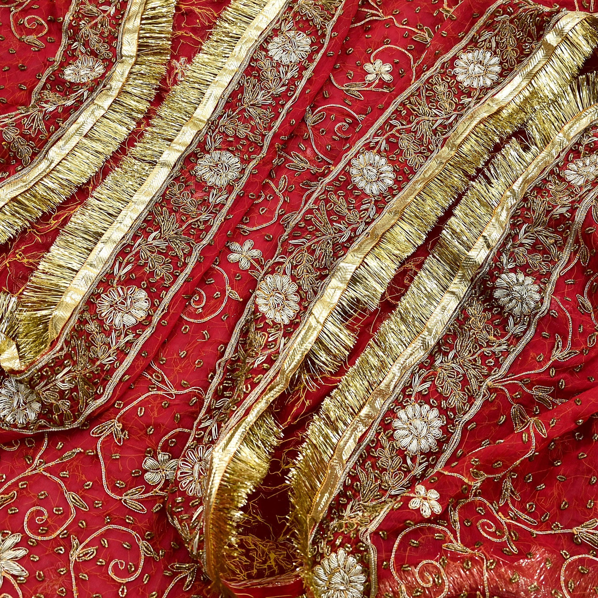 Stunning Very Heavy Dupatta Hand Embroidered 100% Pure Chiffon Silk Dupatta/Stole In Red Color Fabric. This one of a kind item is difficult to express in words. Border feature is Floral design embroidered pure metallic golden & Silver zardozi/ Dabka, Zari and work embellished work is the highlight of the dupatta. Also you can see similar Zardozi work with floral pattern in center part adds to its beauty. Beautiful Golden Fringes Border work is giving a fabulous look to the dupatta. Awesome one !!!