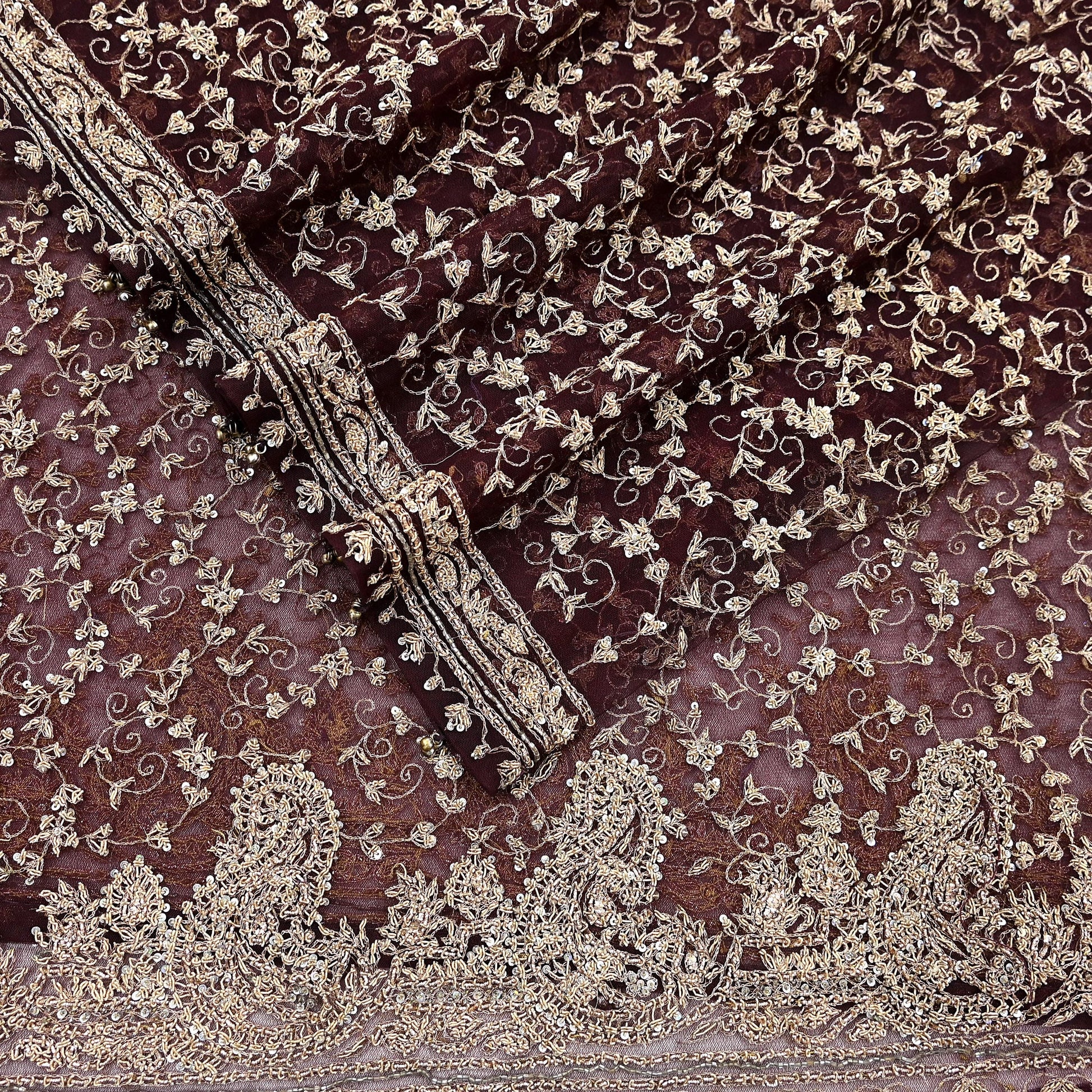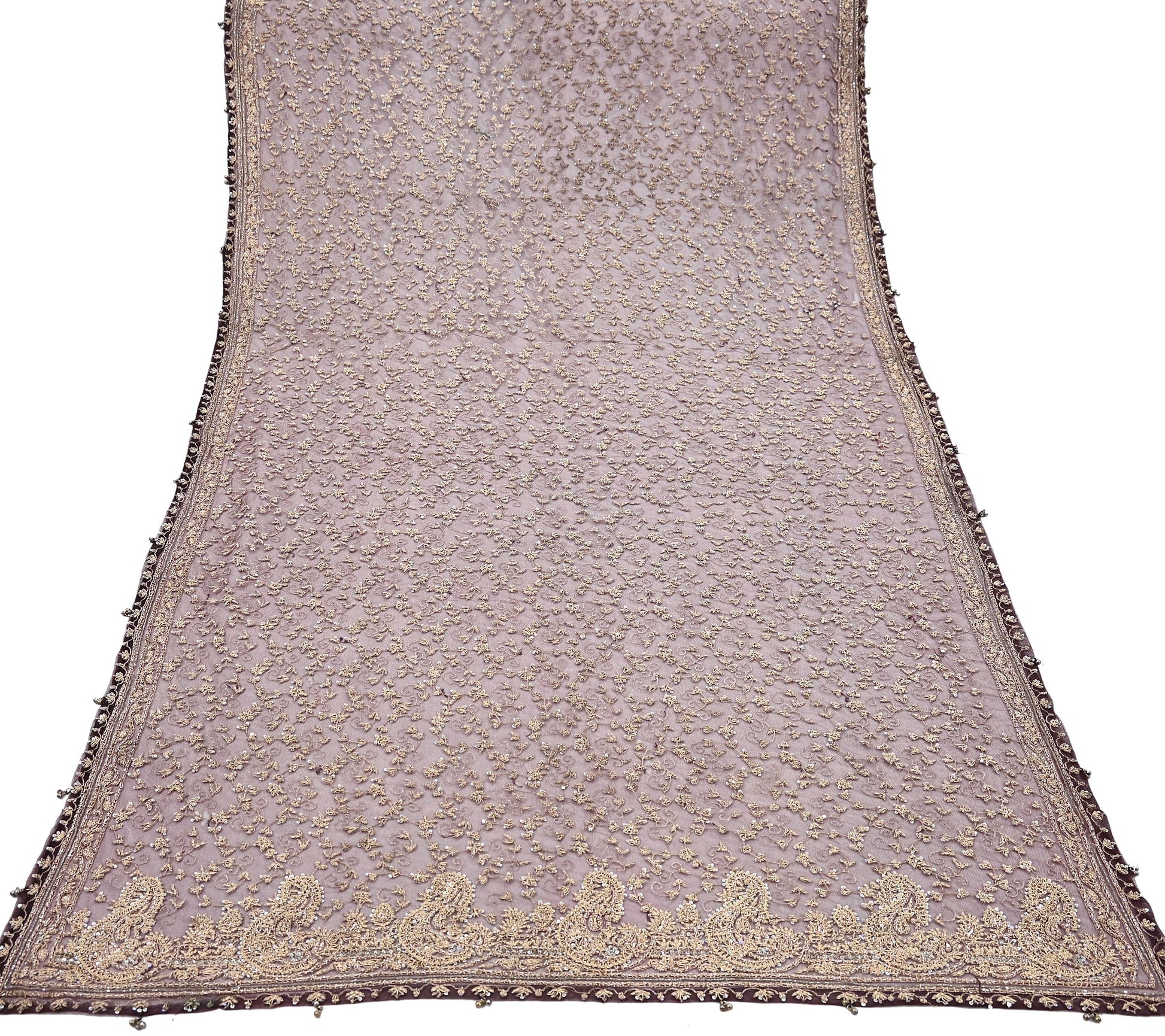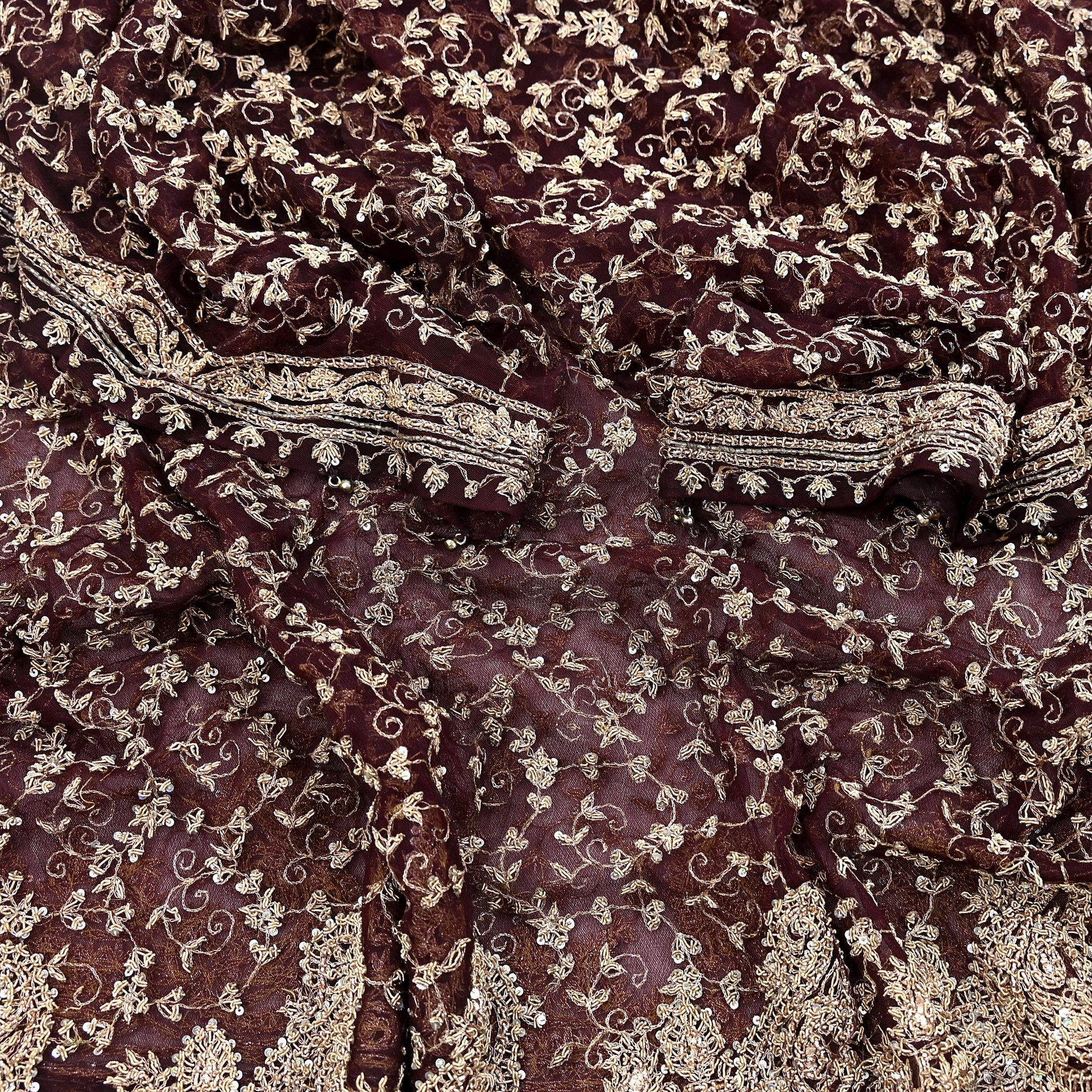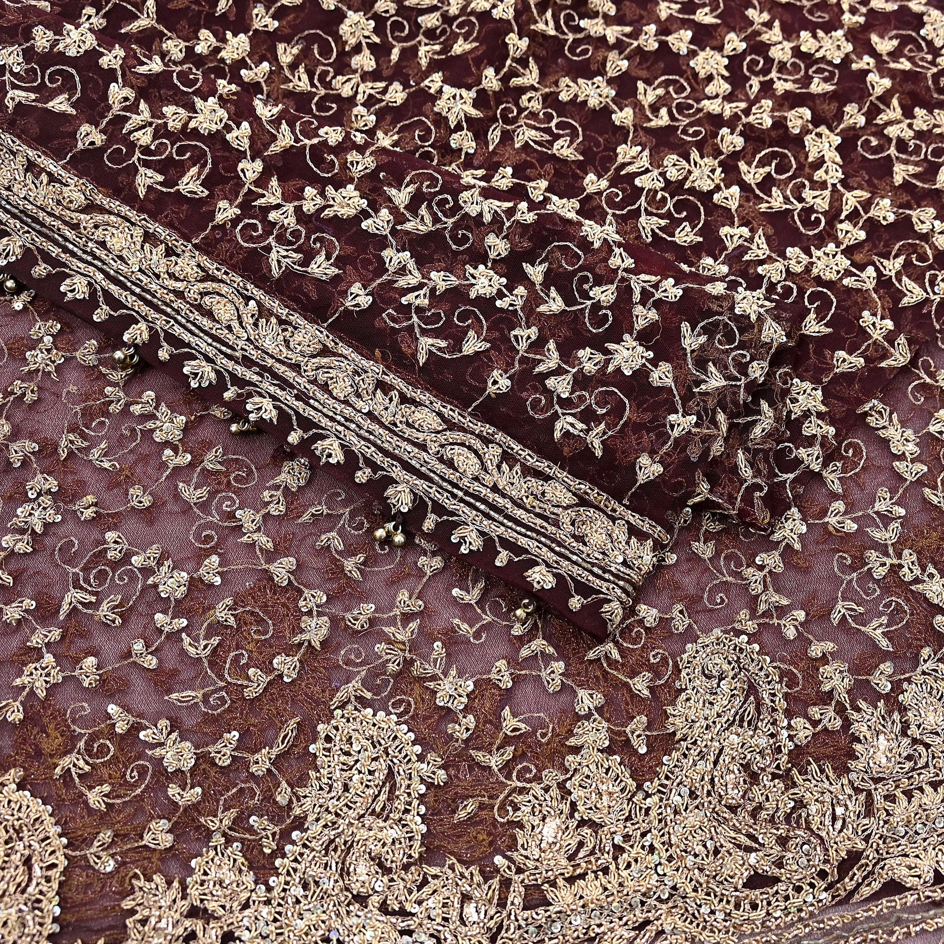 Stunning Pr-owned Beautiful Heavy Dupatta Hand Embroidered Net Dupatta/Stole In Dark Maroon Color Fabric. This one of a kind item is difficult to express in words. Border feature is floral design embroidered pure metallic Golden zardozi/Zari , Glass Beaded, Silver sequins, work embellished work is the highlight of the dupatta. Also you can see similar Zardozi, Beaded & Multi Sequins work with floral pattern in center part adds to its beauty. Beautiful Border work is giving a fabulous look to the dupatta. Awesome one !!!