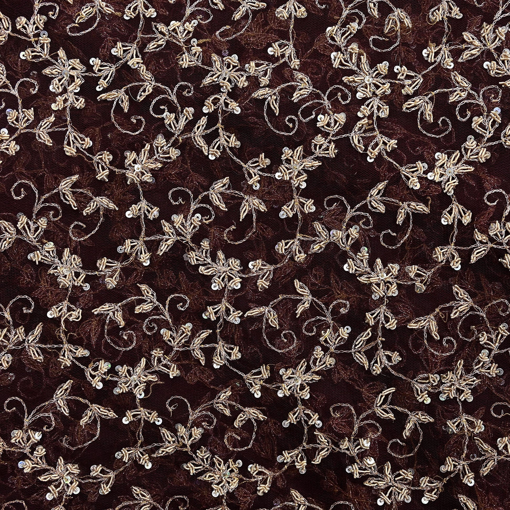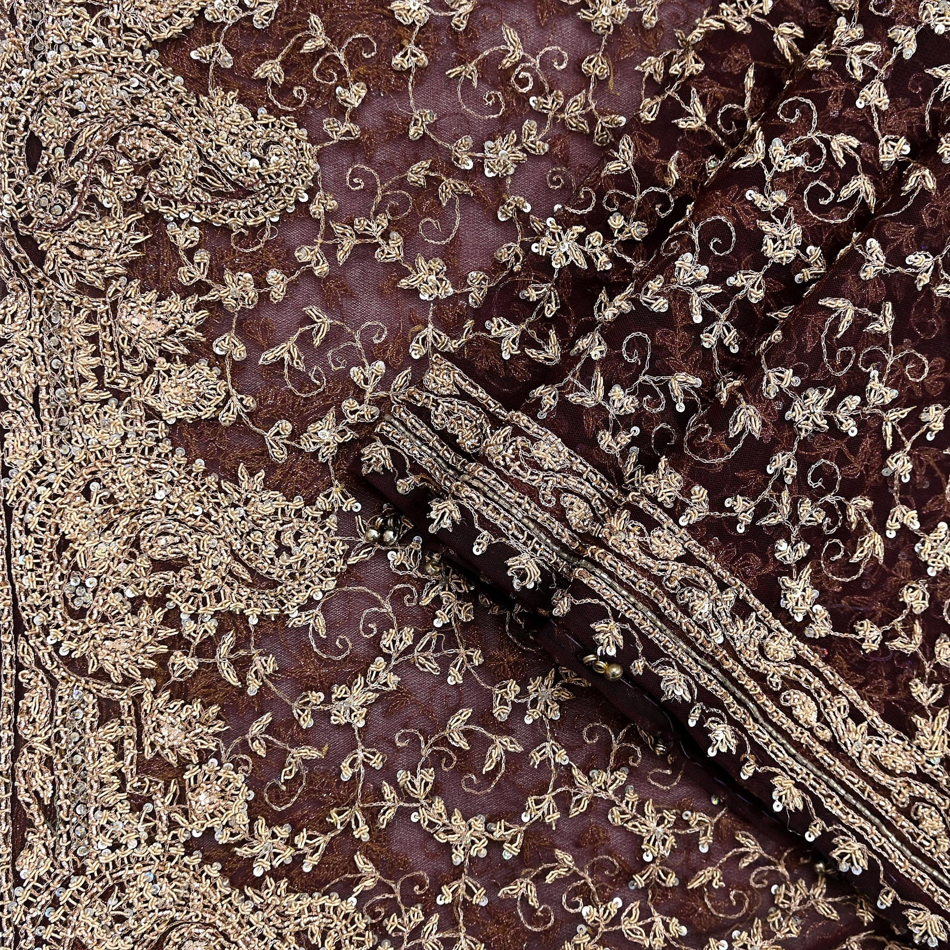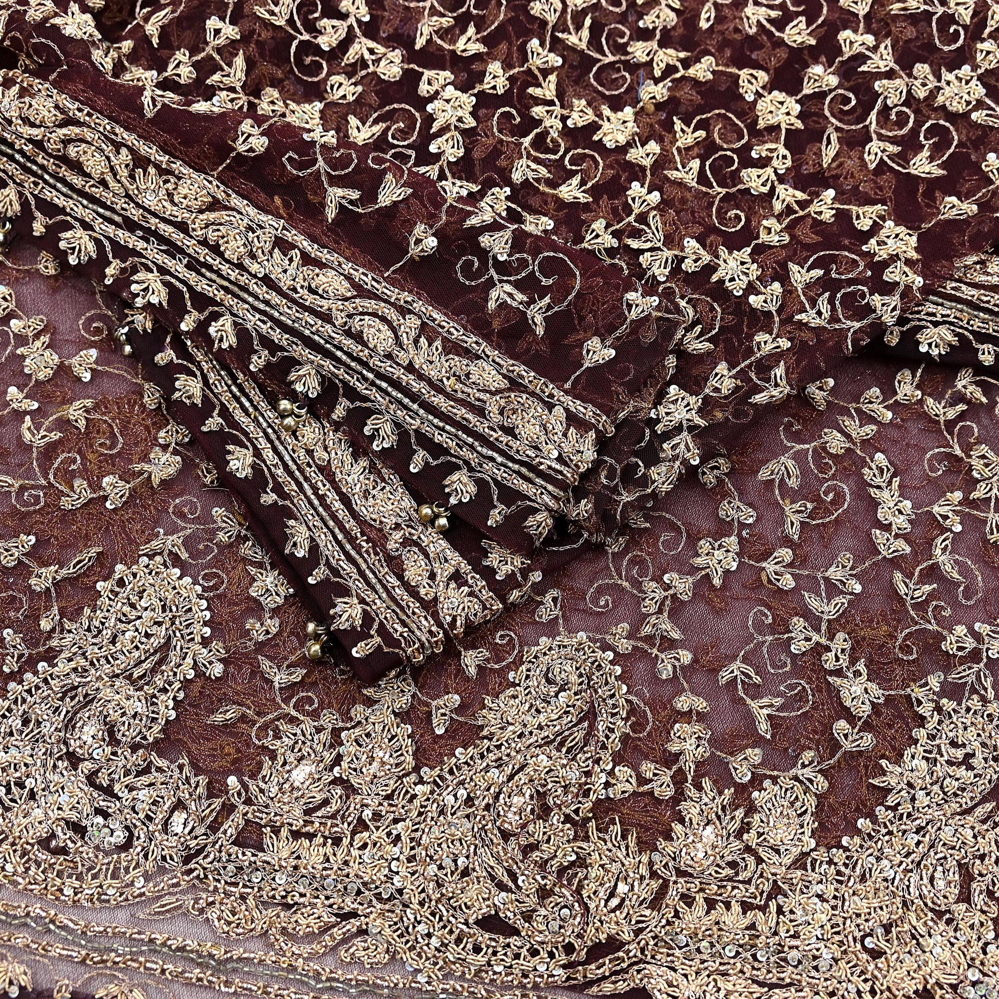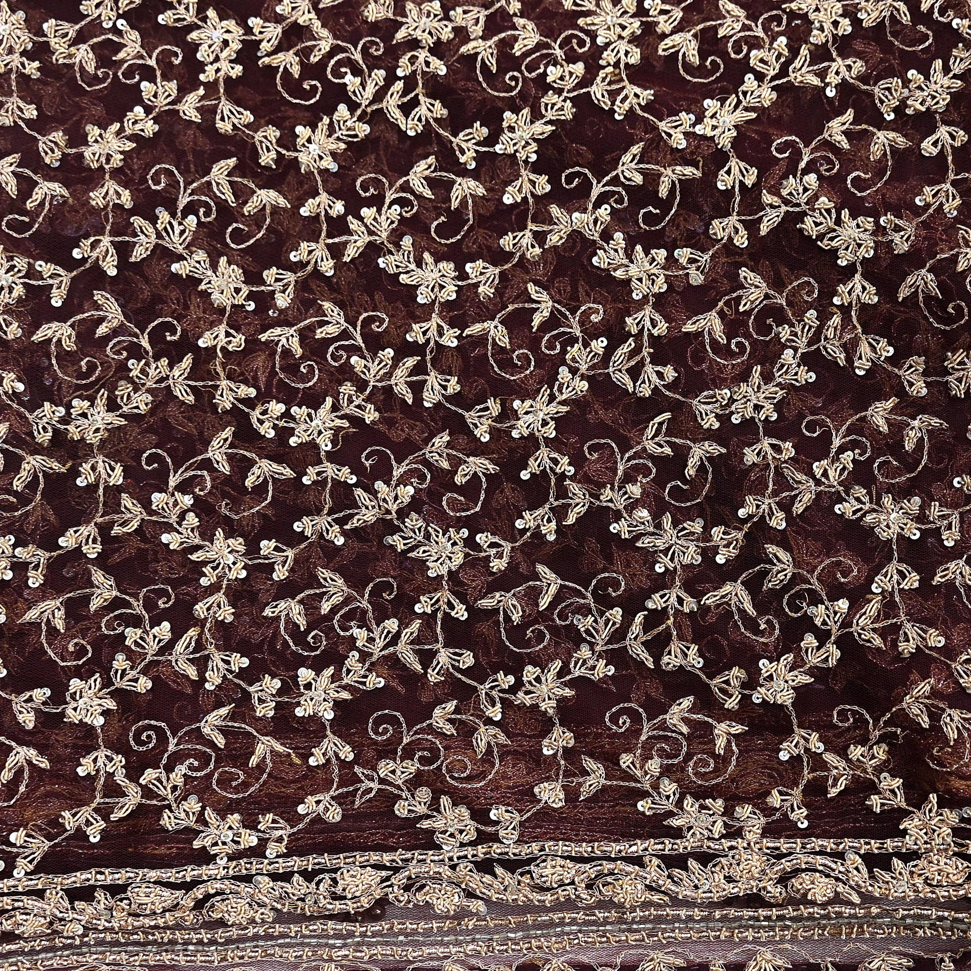 Stunning Pr-owned Beautiful Heavy Dupatta Hand Embroidered Net Dupatta/Stole In Dark Maroon Color Fabric. This one of a kind item is difficult to express in words. Border feature is floral design embroidered pure metallic Golden zardozi/Zari , Glass Beaded, Silver sequins, work embellished work is the highlight of the dupatta. Also you can see similar Zardozi, Beaded & Multi Sequins work with floral pattern in center part adds to its beauty. Beautiful Border work is giving a fabulous look to the dupatta. Awesome one !!!