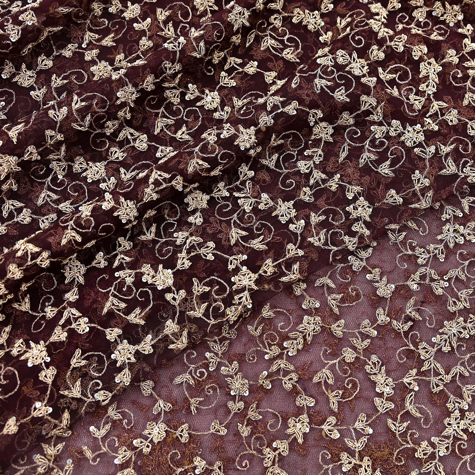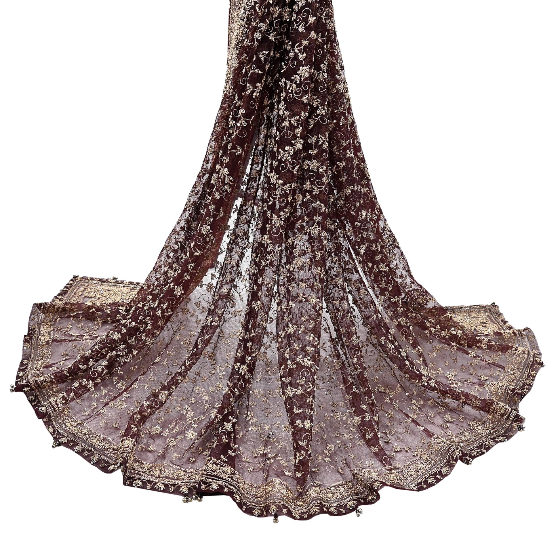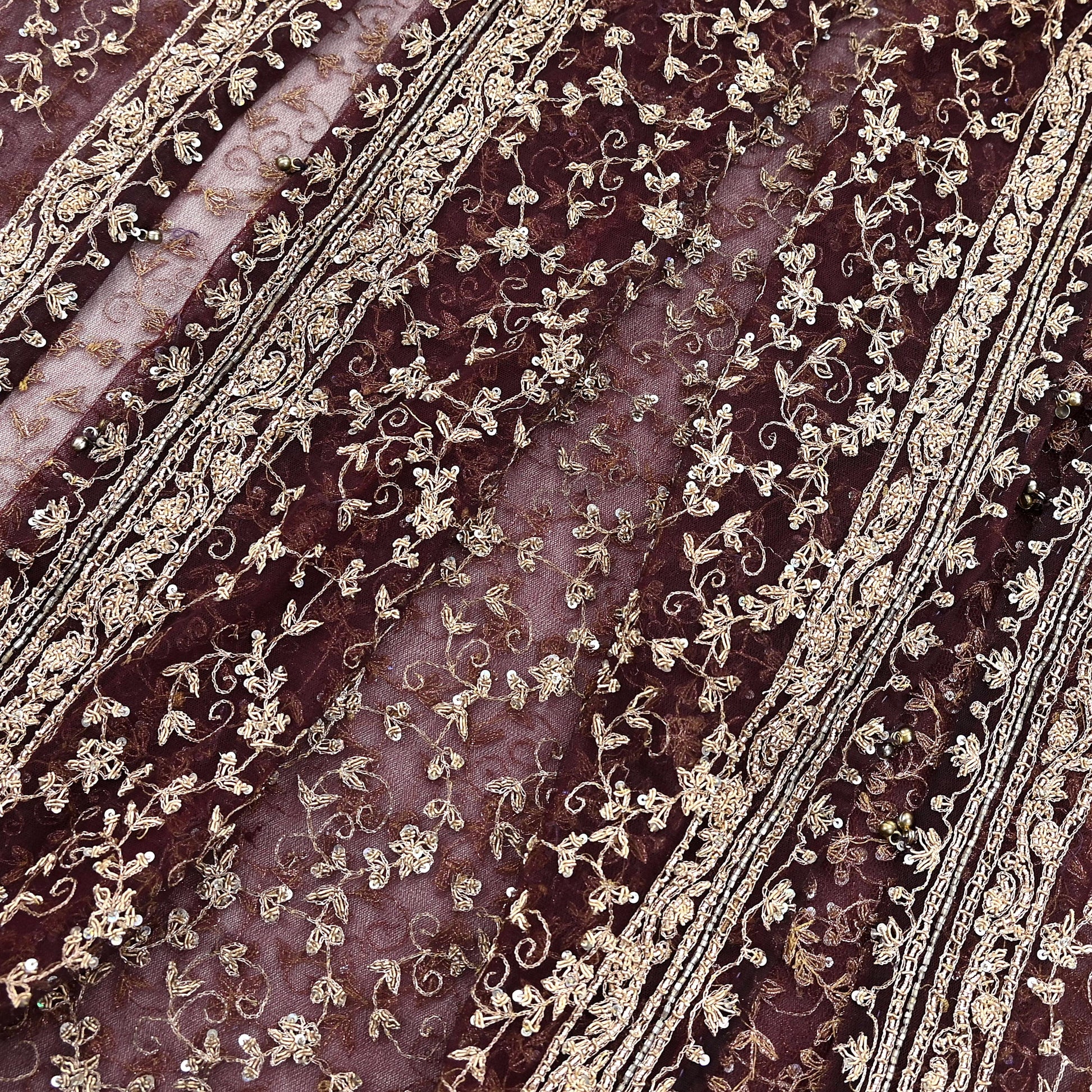 Indian Vintage Heavy Dark Maroon Dupatta Net Mesh Long Stole Hand Embroidered Scarf Zardozi Zari Sequins Stole Bridal Veil