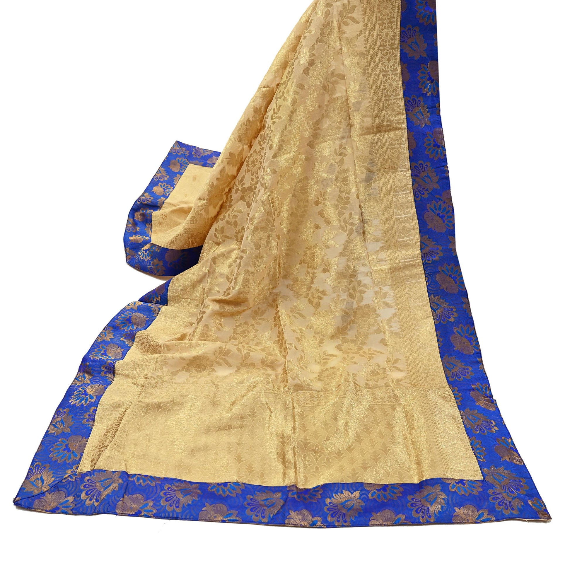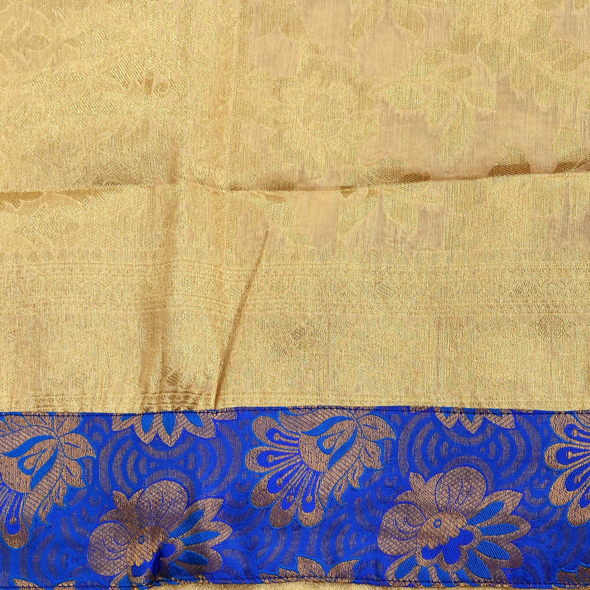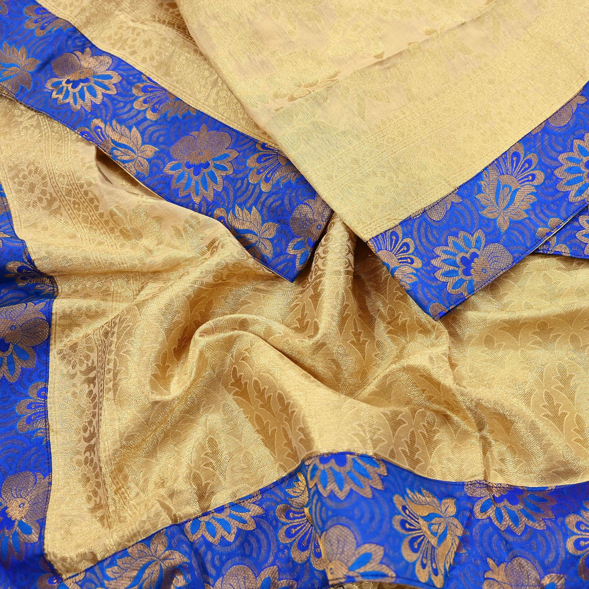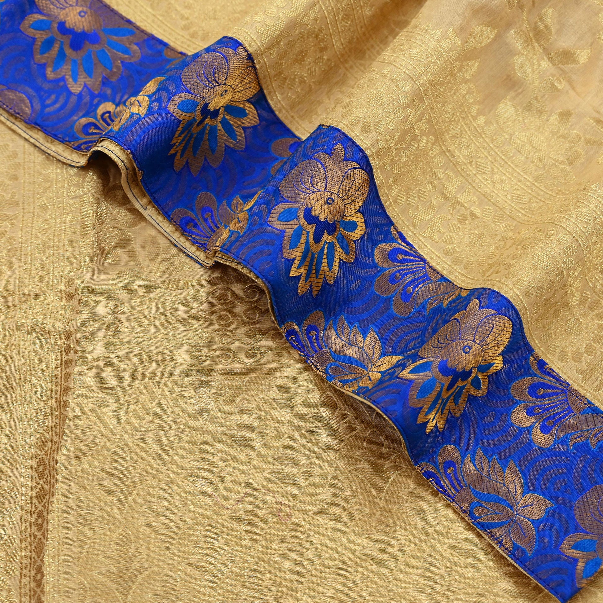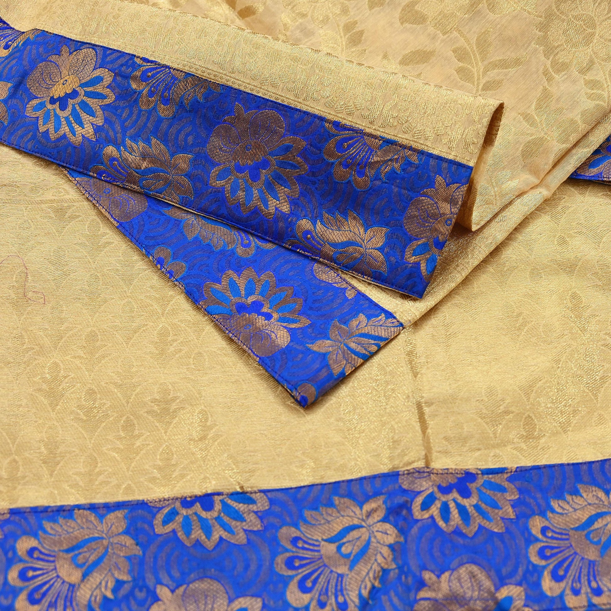 Antique Vintage Heavy Dupatta Hand Embroidered 100% Pure Silk Dupatta/Stole In Golden Beige Color Fabric. This one of a kind item is difficult to express in words. Border feature is floral design embroidered pure metallic golden Zari work embellished work is the highlight of the dupatta. Also you can see similar Zari work with floral pattern in center part adds to its beauty. Beautiful Blue Kanjivaram Border work is giving a fabulous look to the dupatta. Awesome one !!!
