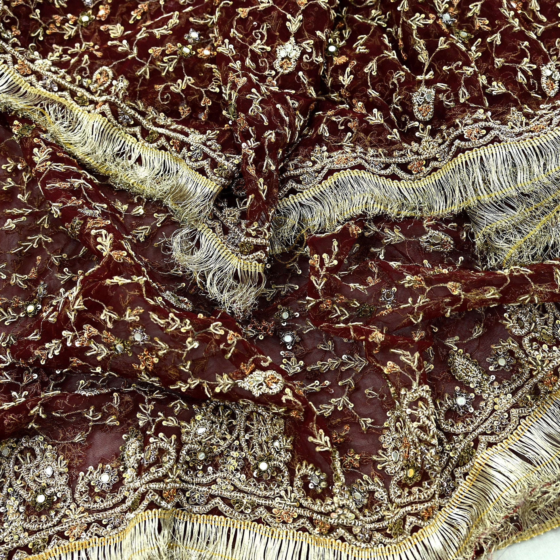 Stunning Beautiful Heavy Dupatta Hand Embroidered Net Dupatta/Stole In Maroon Color Fabric. This one of a kind item is difficult to express in words. Border feature is floral & Paisley design embroidered pure metallic Golden & Maroon zardozi/Zari And Golden sequins work embellished work is the highlight of the dupatta. Also you can see similar Zardozi, Golden Sequins work with floral pattern in center part adds to its beauty. Golden Lace/ Fringes work is giving a fabulous look to the dupatta. Awesome one !!!