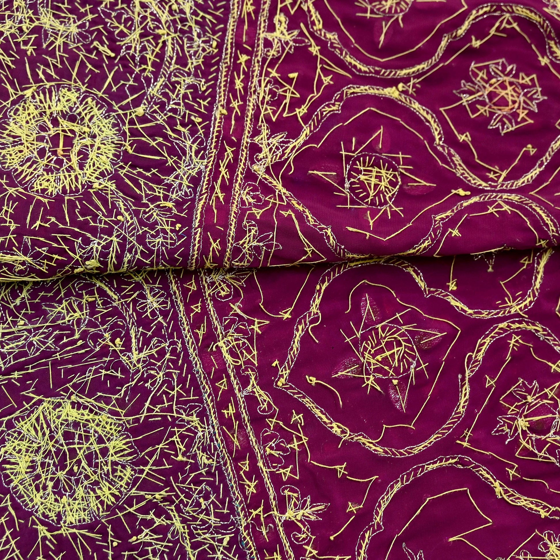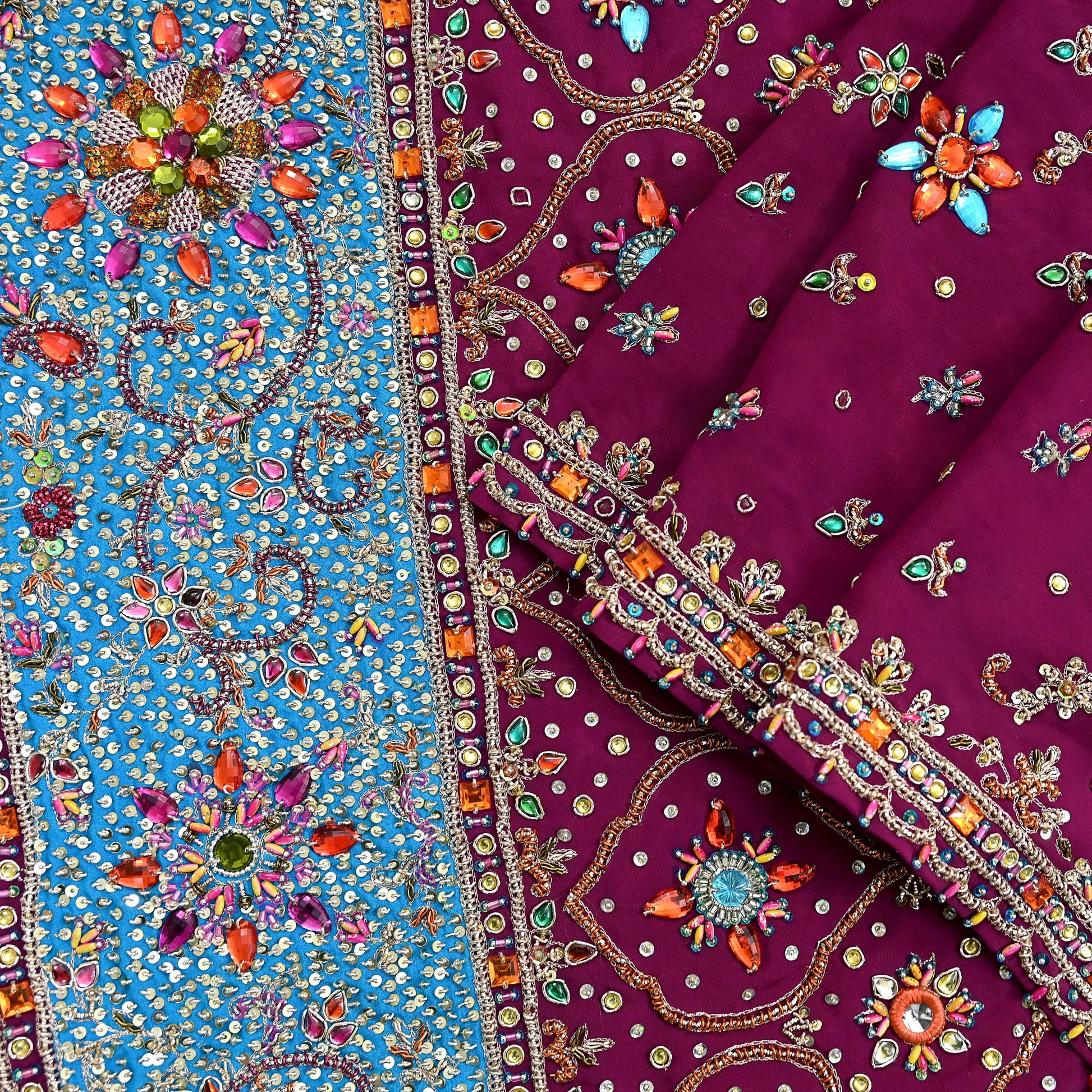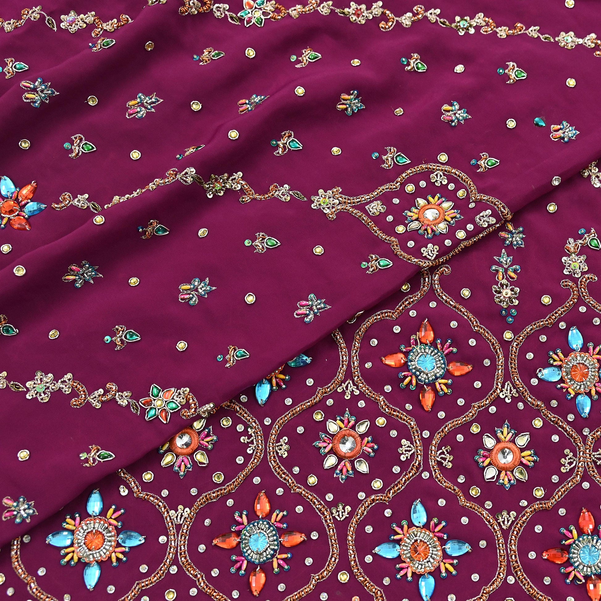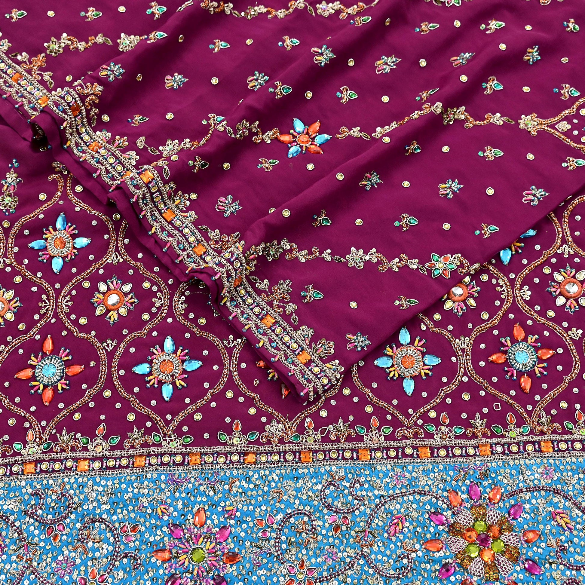 Stunning Very Heavy Dupatta Hand Embroidered 100% Pure Crepe Silk Dupatta/Stole In Maroon Color Fabric. This one of a kind item is difficult to express in words. Border feature is floral design embroidered pure metallic Multi zardozi/Dabka/Zari, Multi Sequins, Golden Beaded. Glass Beaded, Multi stones work embellished work is the highlight of the dupatta. Also you can see similar Zardozi work with floral pattern in center part adds to its beauty. Blue silk Border work is giving a fabulous look to the dupatta. Awesome one !!!