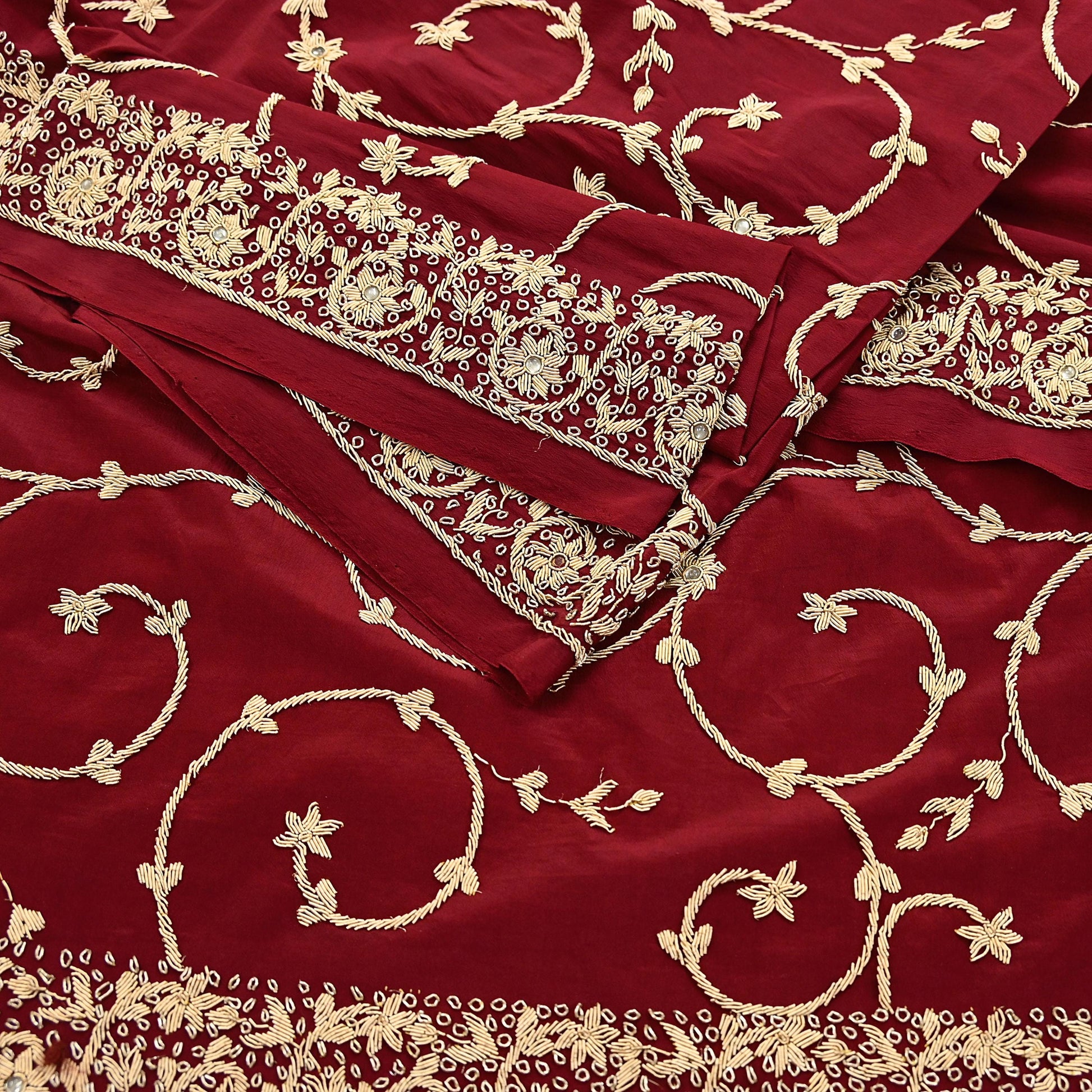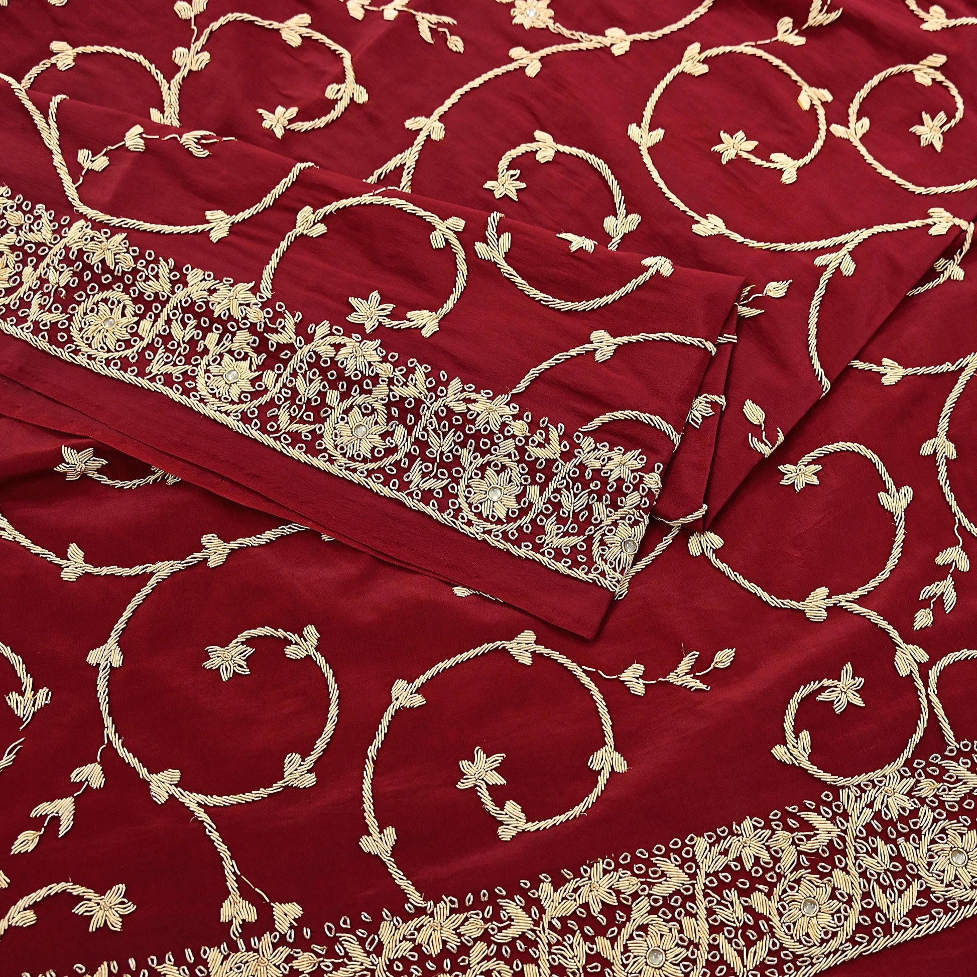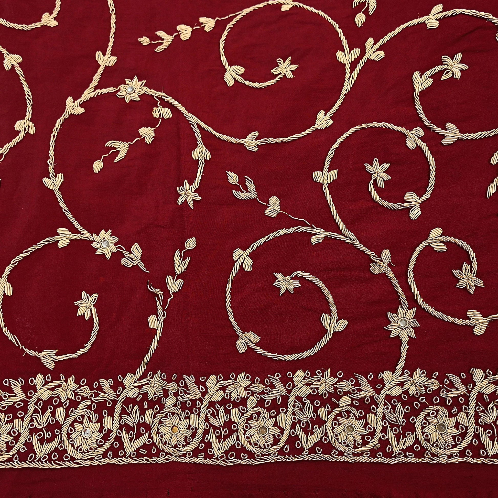 Stunning Very Heavy Dupatta Hand Embroidered 100% Pure Crepe Silk Dupatta/Stole In Maroon Color Fabric. This one of a kind item is difficult to express in words. Border feature is floral design embroidered pure metallic Golden zardozi/Dabka/Zari, Golden & Green Sequins, Golden Beaded. Black Glass Beaded work embellished work is the highlight of the dupatta. Also you can see similar Zardozi work with floral pattern in center part adds to its beauty. Zardozi Border work is giving a fabulous look to the dupatta. Awesome one !!!