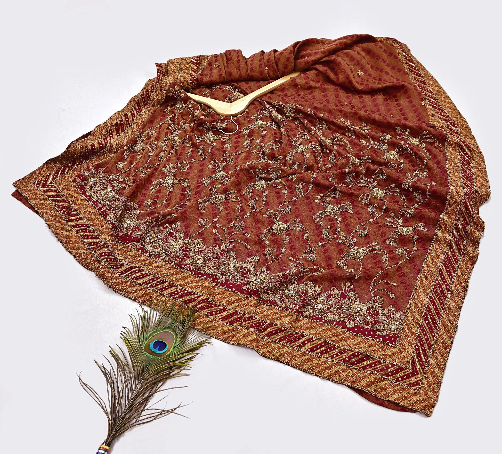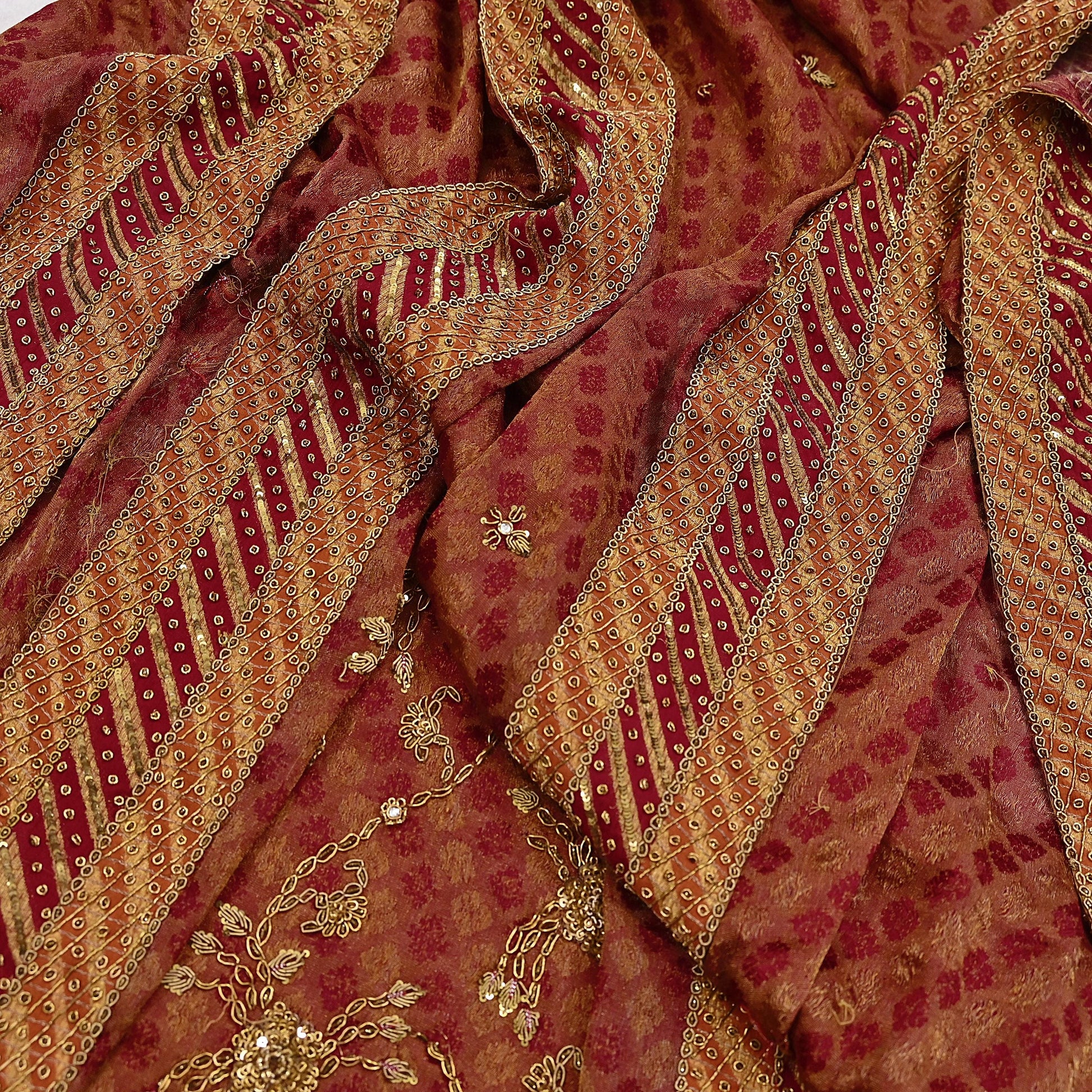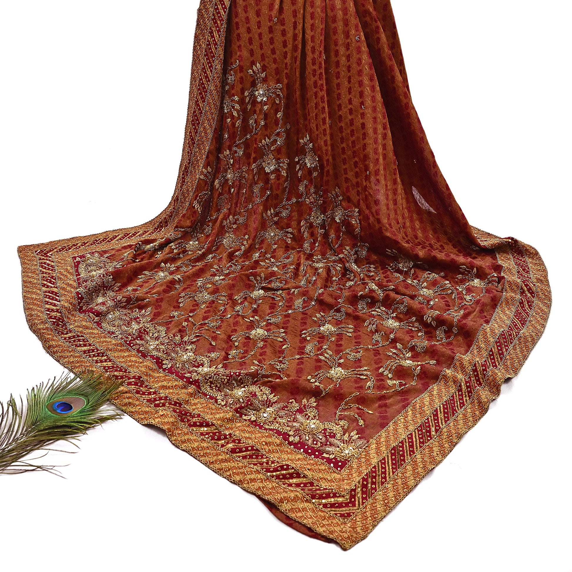 This dupatta features hand-embroidered zardozi, dabka, and zari, Golden sequins, White stones work on rich Orange & Red pure Georgette silk fabric. The intricate floral motifs and golden threadwork evoke the charm of royal Indian attire. The highlight lies in its heavily embroidered borders, designed in shimmering gold and green patterns that frame the piece beautifully.