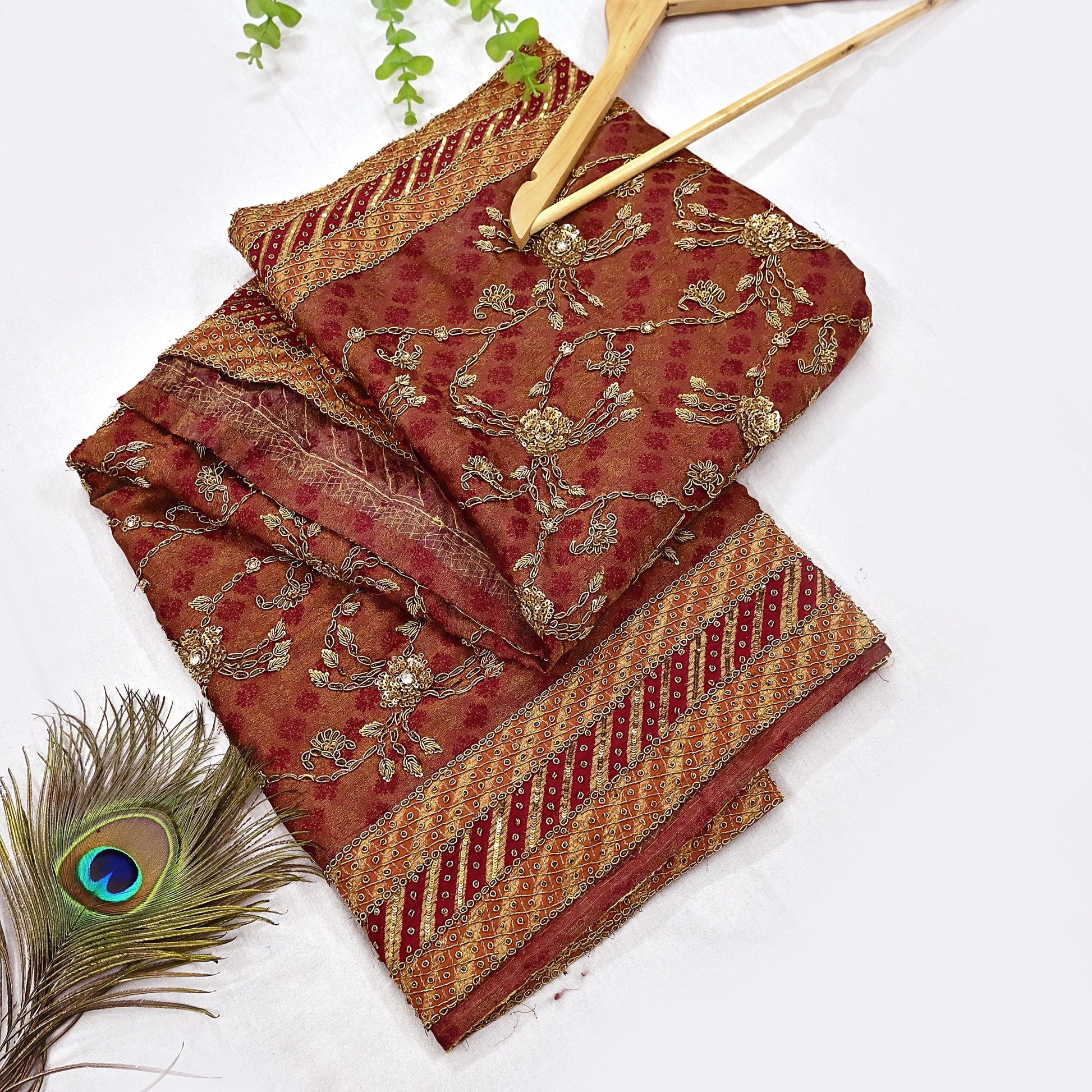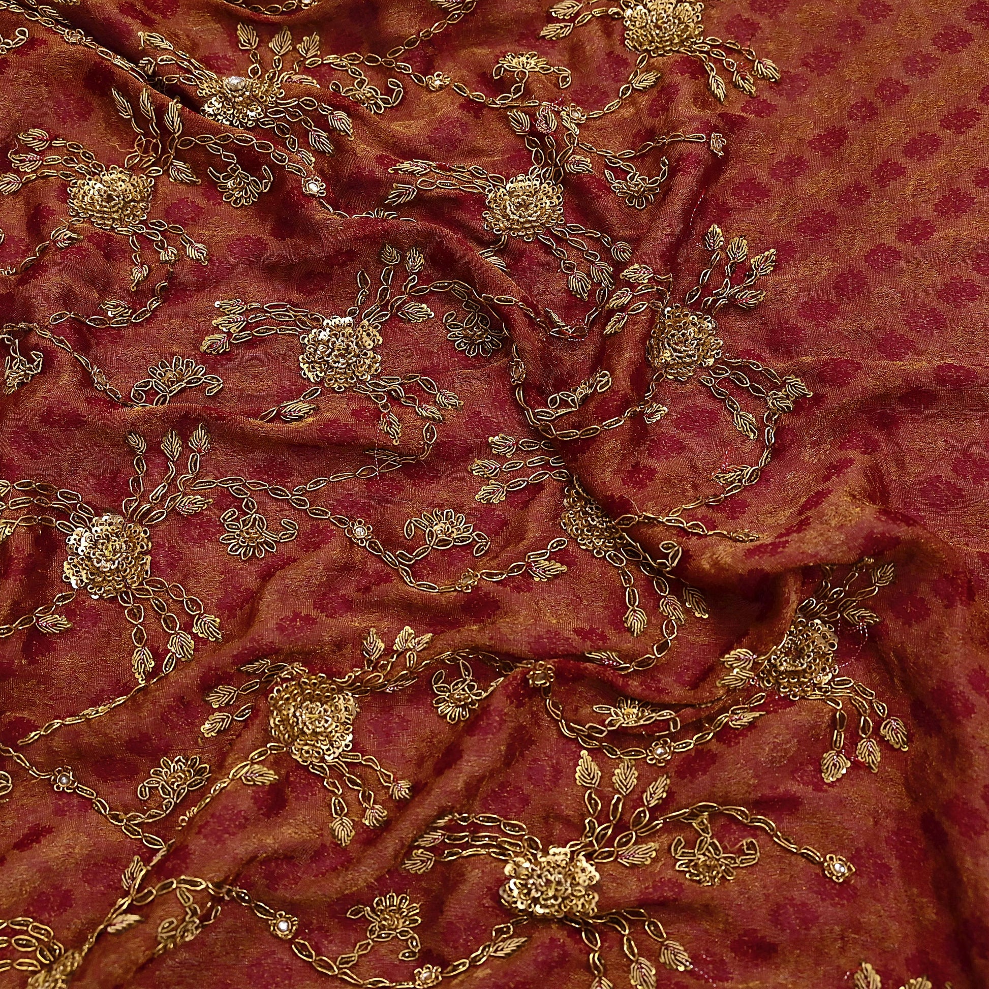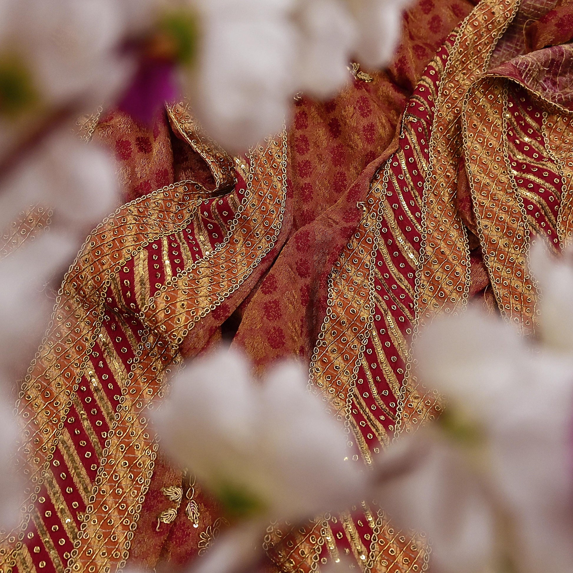 This dupatta features hand-embroidered zardozi, dabka, and zari, Golden sequins, White stones work on rich Orange & Red pure Georgette silk fabric. The intricate floral motifs and golden threadwork evoke the charm of royal Indian attire. The highlight lies in its heavily embroidered borders, designed in shimmering gold and green patterns that frame the piece beautifully.