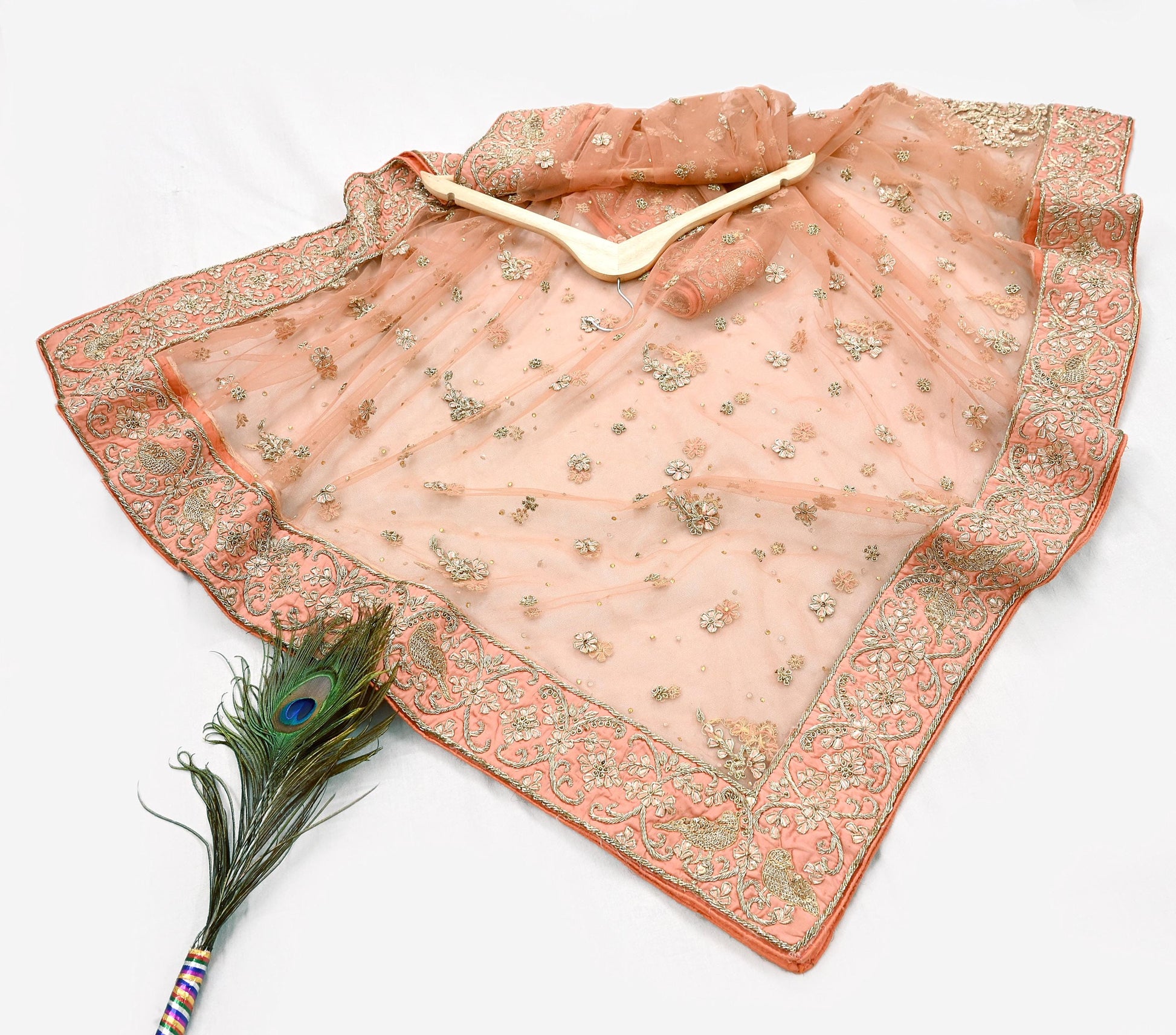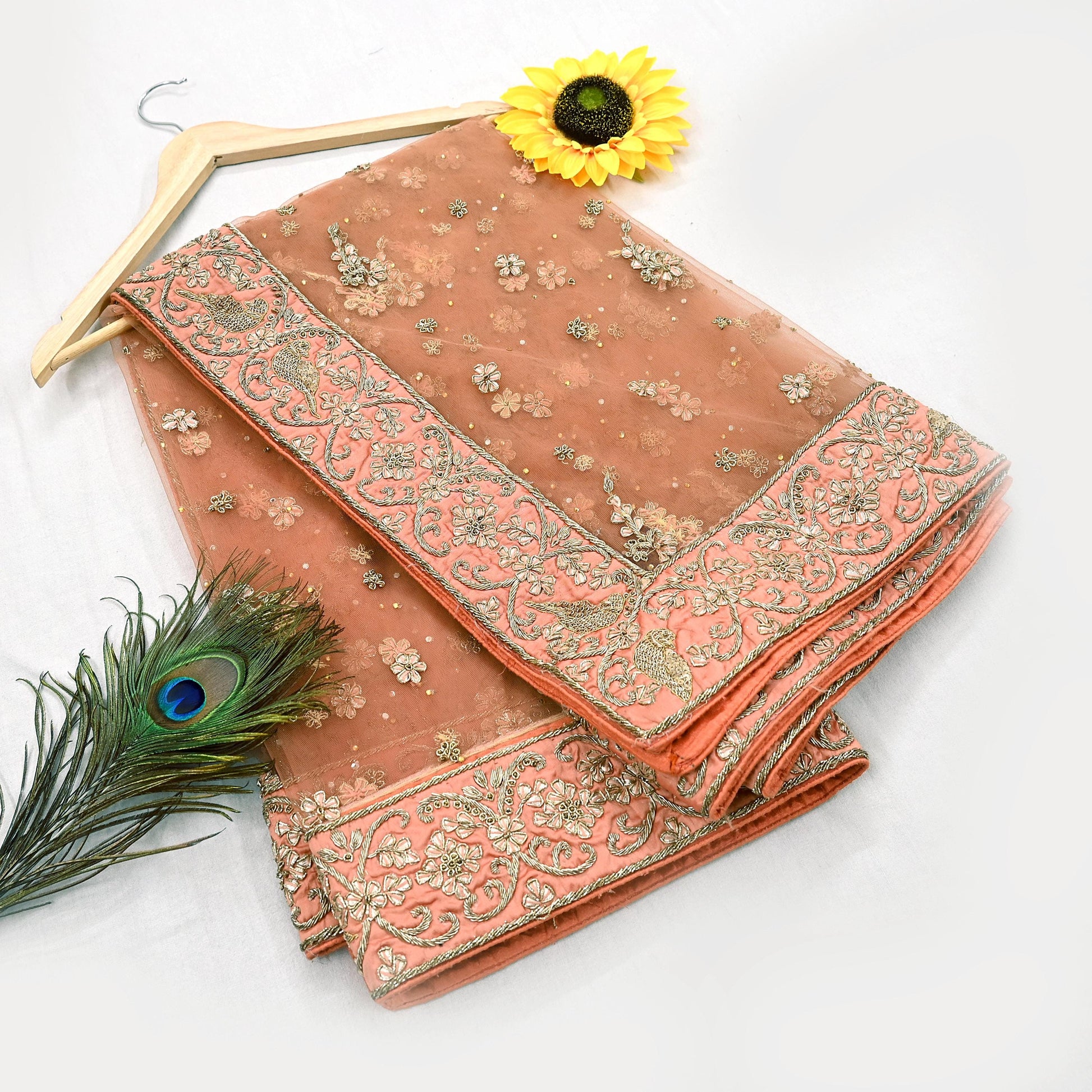 Stunning Beautiful Heavy Dupatta Hand Embroidered Net Dupatta/Stole In Peach Color Fabric. This one of a kind item is difficult to express in words. Border feature is floral design embroidered pure metallic Golden zardozi/ Dabka, Zari, Golden Sequins, Golden glass Beaded, Golden gota patti work embellished work is the highlight of the dupatta. Also you can see similar Zardozi, Beaded work with floral & Parrot pattern in center part adds to its beauty. raw silk Peach Border work is giving a fabulous look to the dupatta. Awesome one !!!