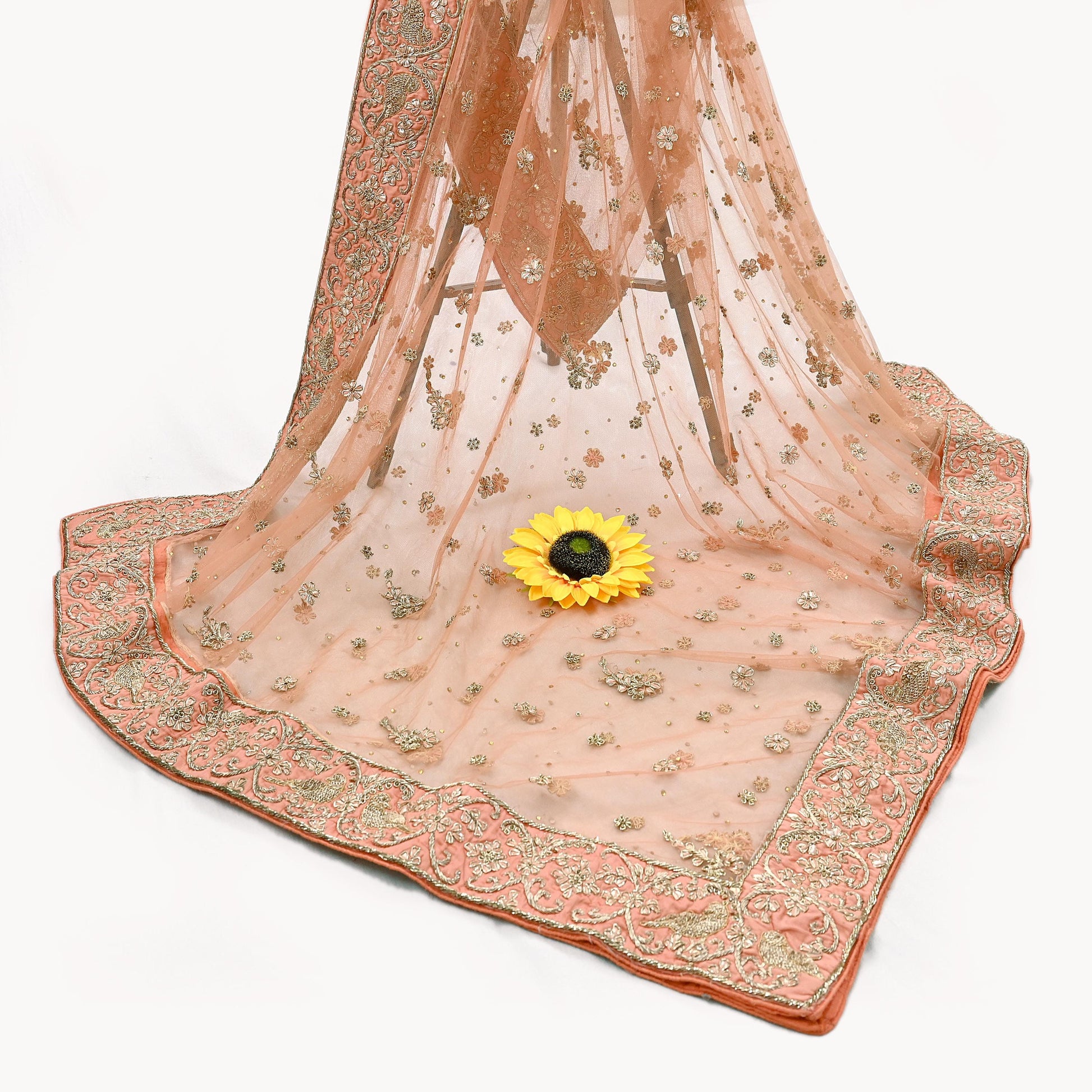 Indian Vintage Heavy Peach Dupatta Net Mesh Long Stole Hand Embroidered Scarves Golden Zardozi Dabka Zari Stole Bridal/ Wedding veil