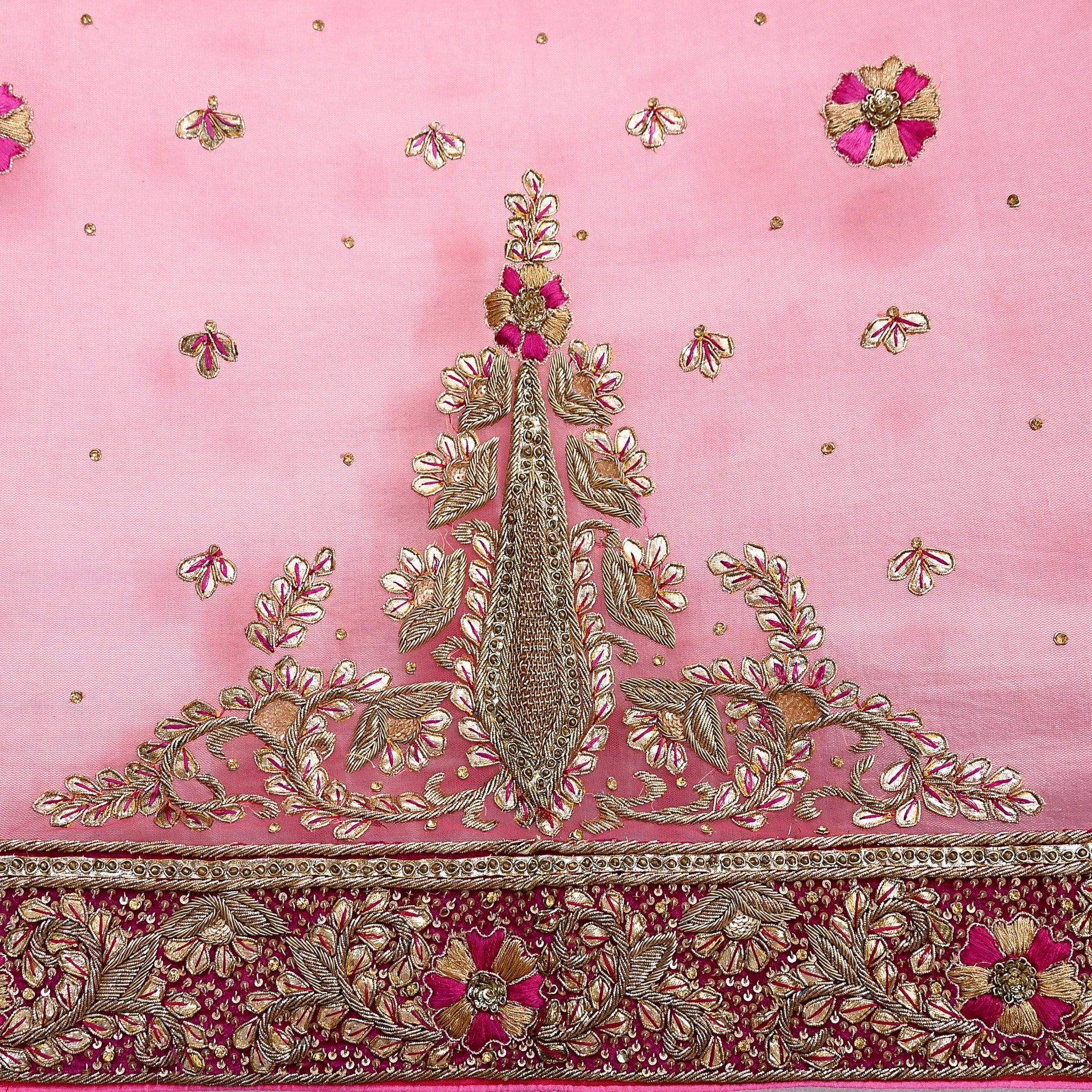 Stunning Beautiful Heavy Dupatta Hand Embroidered Net Dupatta/Stole In Peach Color Fabric. This one of a kind item is difficult to express in words. Border feature is floral & Paisley design embroidered pure metallic golden zardozi/dabka work, golden zari, golden sequins, Golden glass beads, Golden stones, Golden gota patti, thread work embellished work is the highlight of the dupatta. Also you can see similar Zardozi, Beaded work with floral pattern in center part adds to its beauty. Purple Velvet Border work is giving a fabulous look to the dupatta. Awesome one !!!