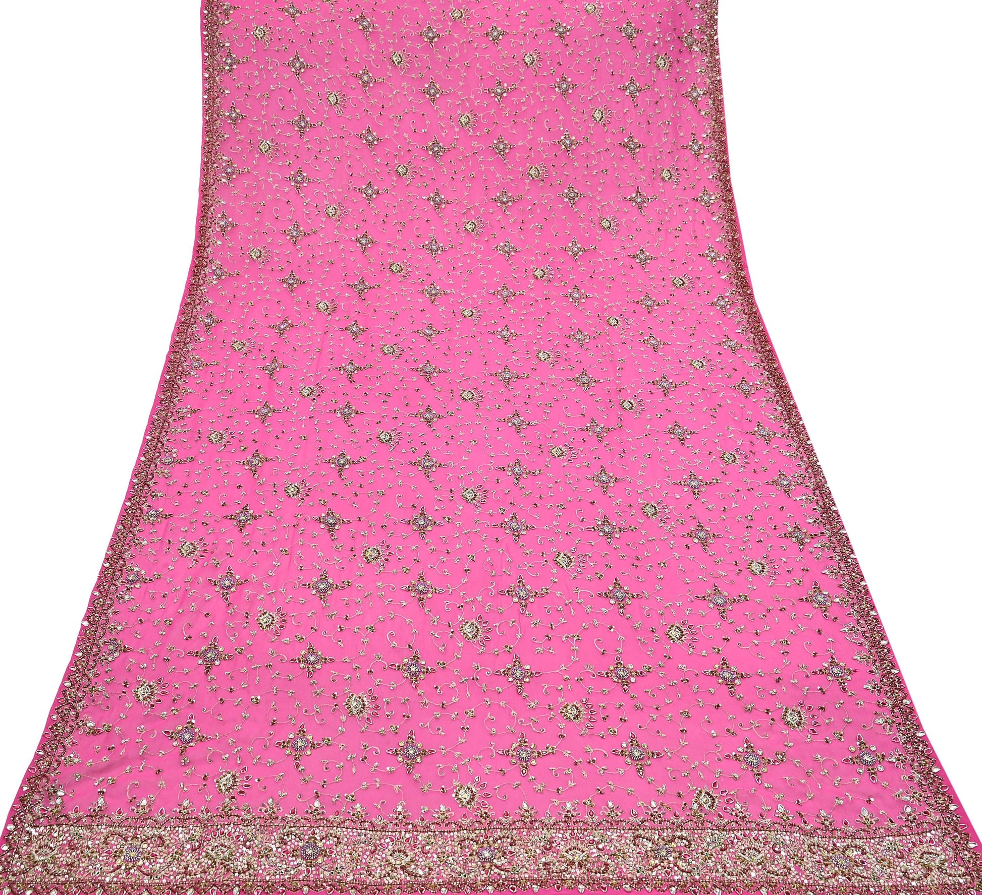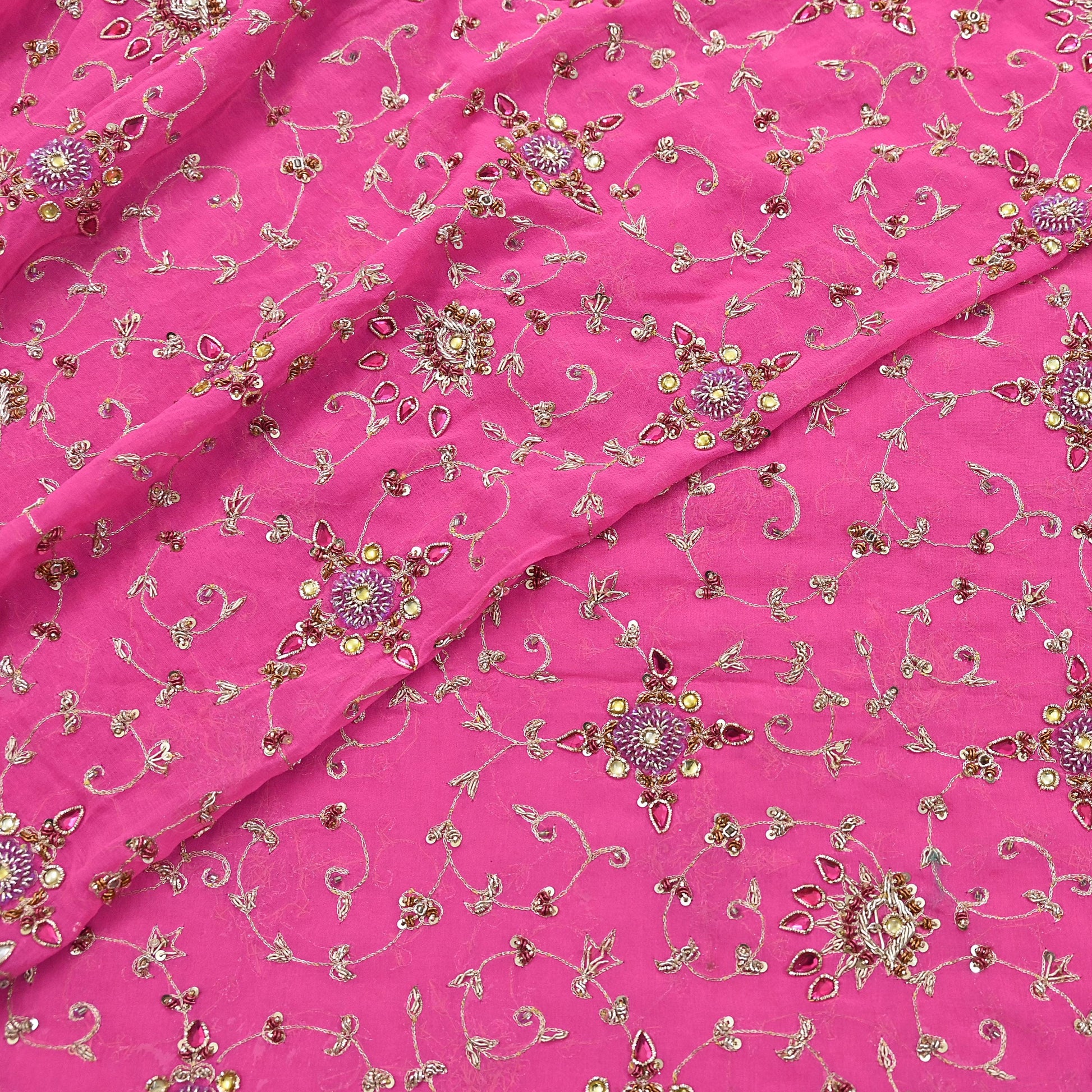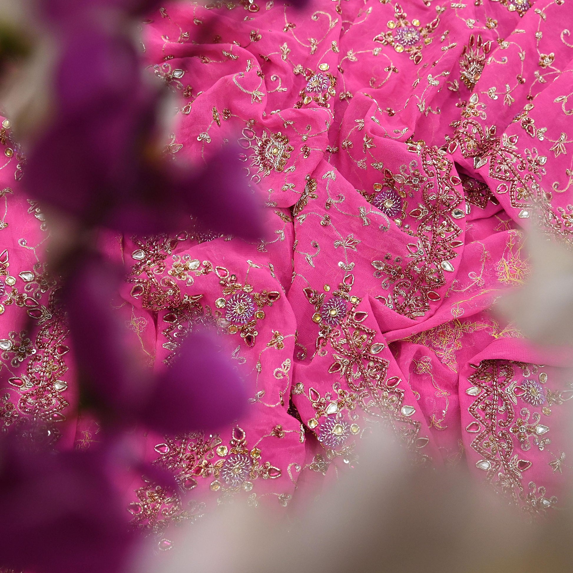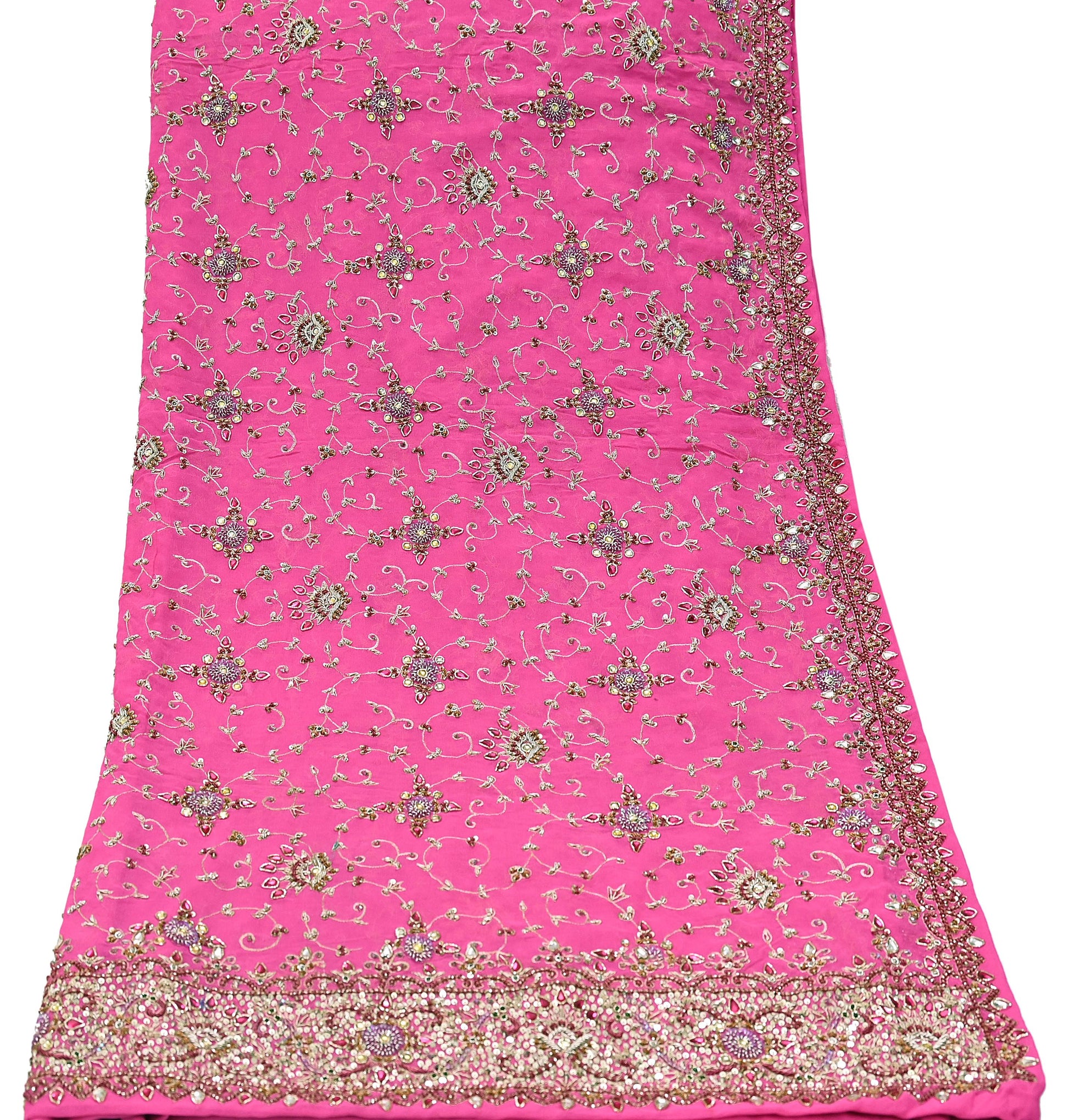 This exceptional vintage dupatta is a rare and regal piece, handcrafted on rich 100% pure georgette silk in a Pink hue. Adorned with luxurious floral hand embroidery, the border and center showcase pure metallic golden & Green, Pink zardozi/dabka, zari, golden sequins, silver beading, White & Pink Stones work, and intricate mukesh embellishments.