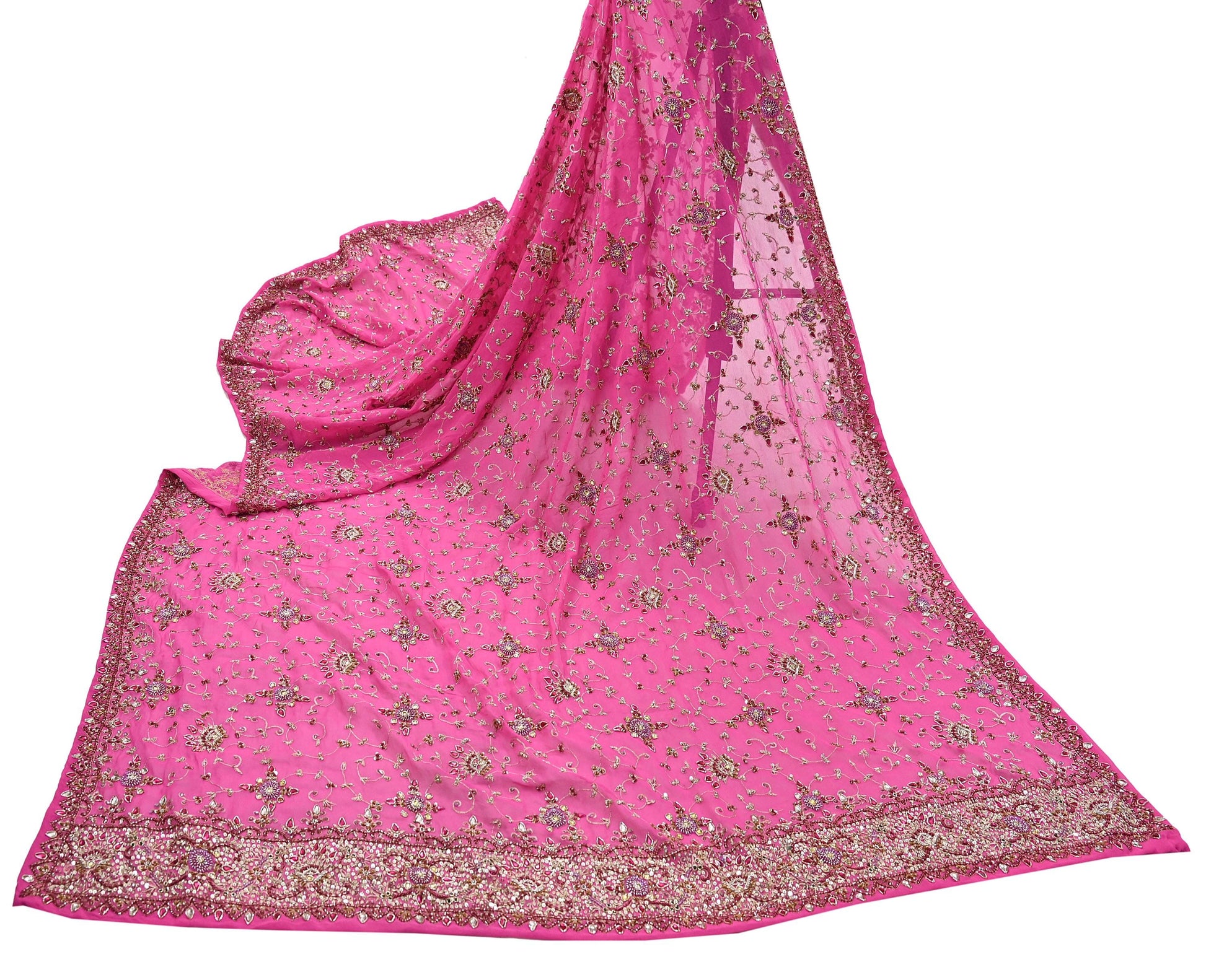 Indian Vintage Heavy Pink Bridal Dupatta Pure Georgette Silk Hand Embroidered Zardozi, Dabka, Zari Work Party Wear Long Stole