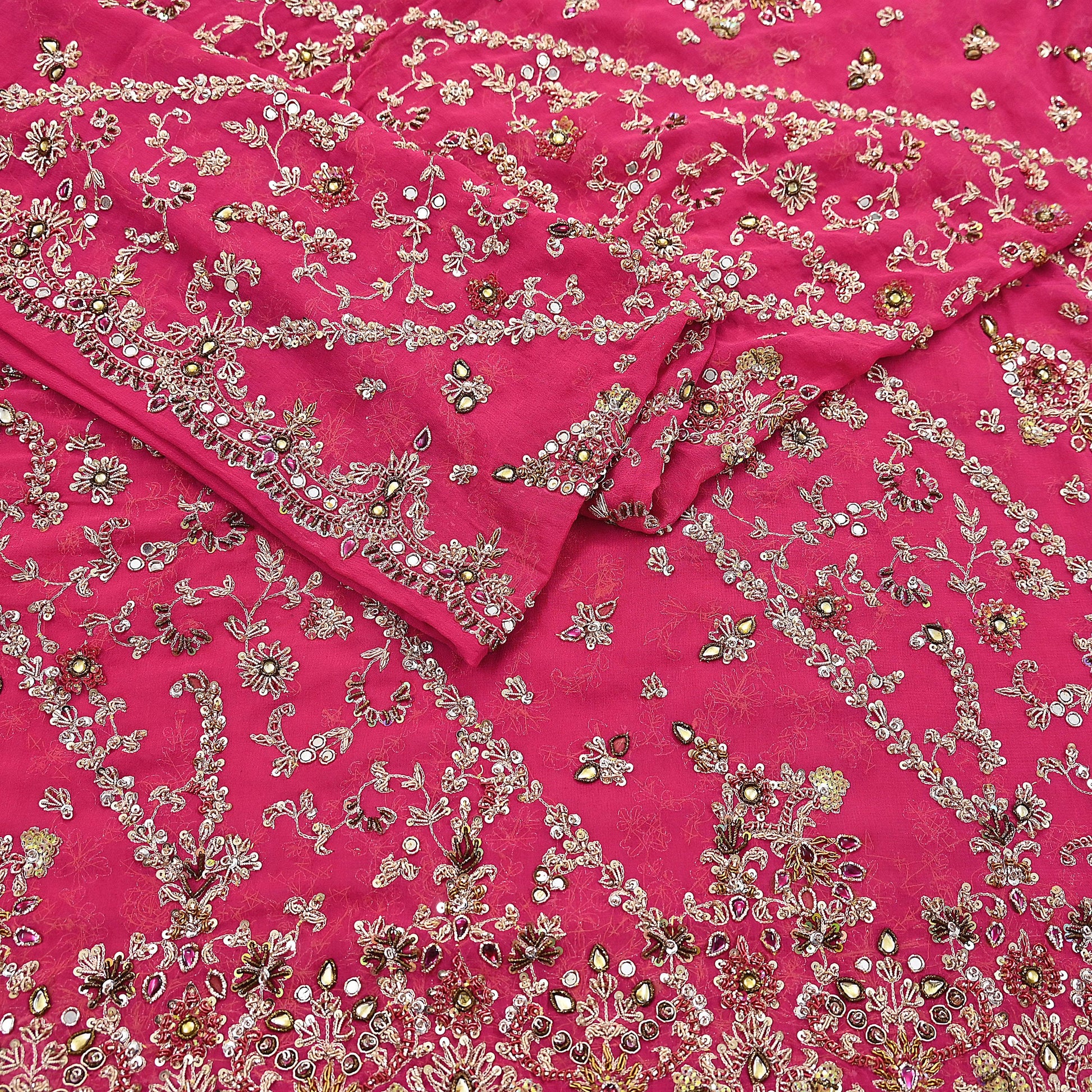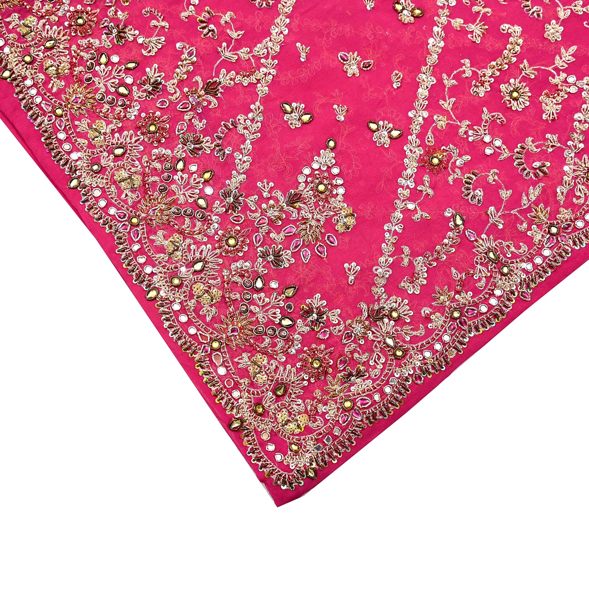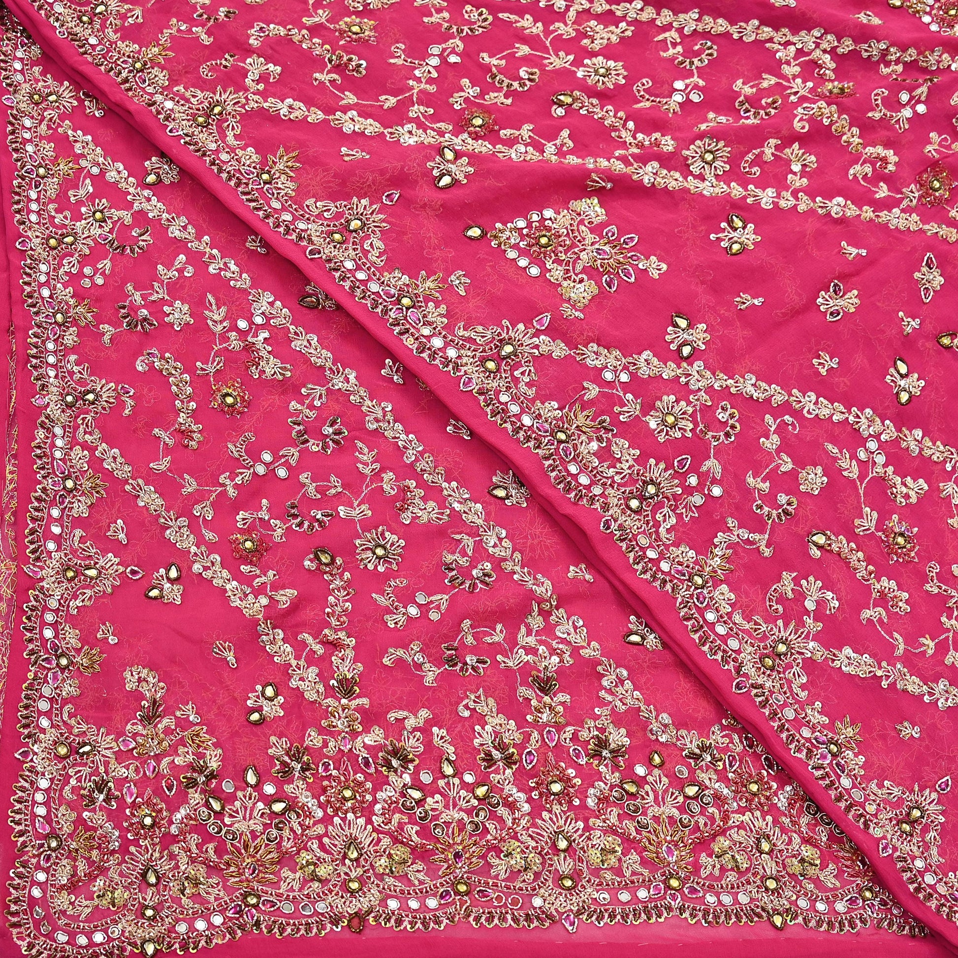 This exceptional vintage dupatta is a rare and regal piece, handcrafted on rich 100% pure georgette silk in a Pink hue. Adorned with luxurious floral hand embroidery, the border and center showcase pure metallic golden & Green, Pink zardozi/dabka, zari, golden sequins, silver beading, White & Pink Stones work, and intricate mukesh embellishments.