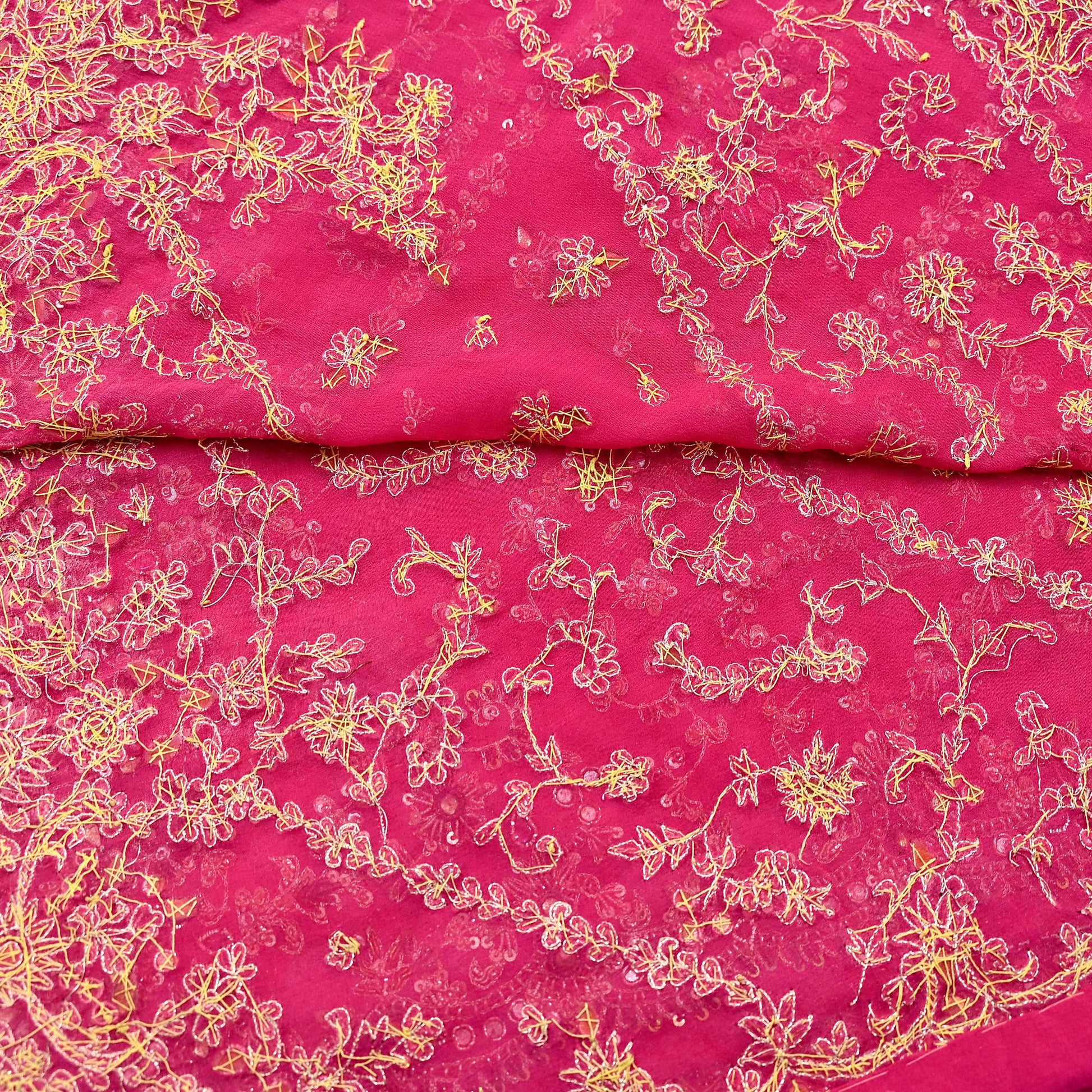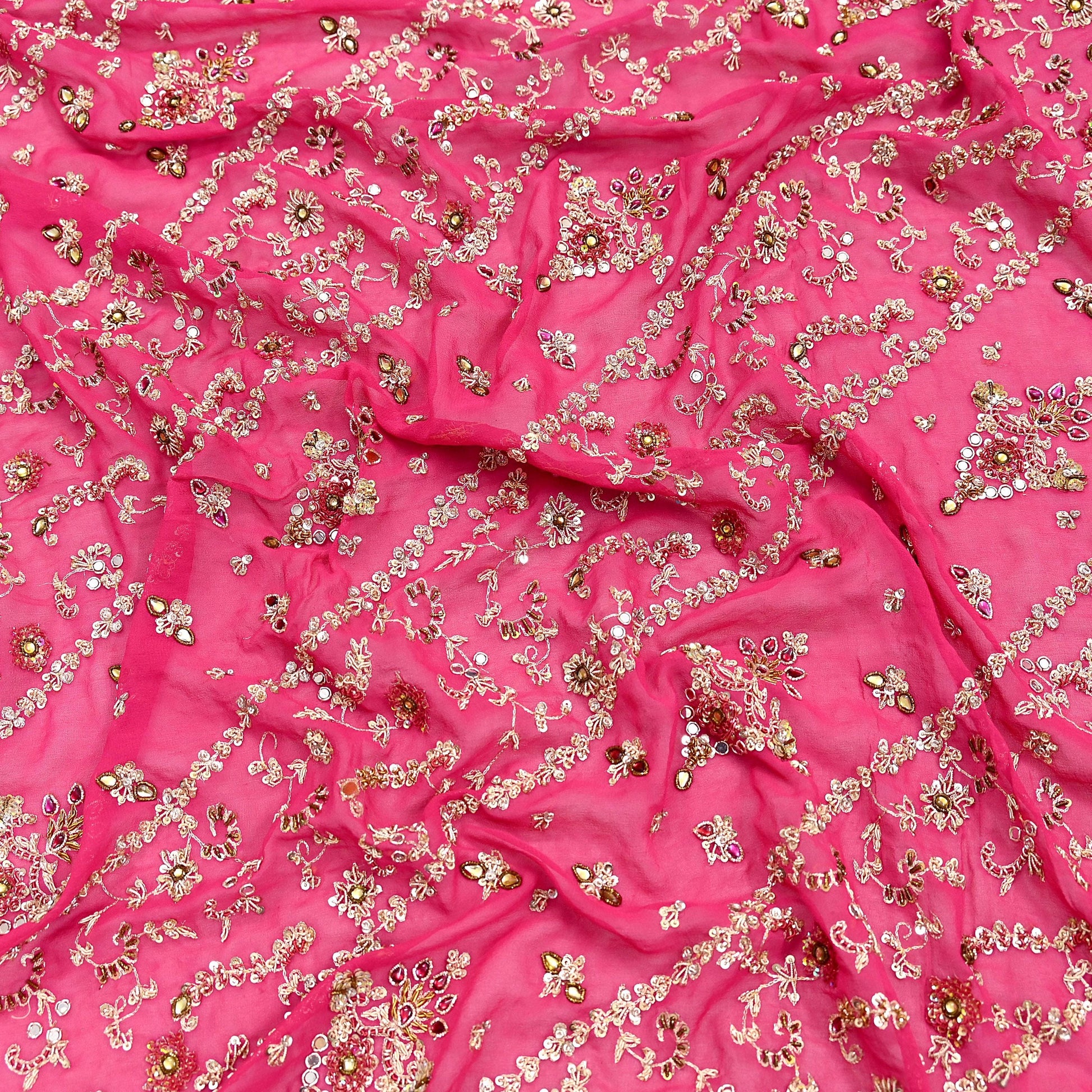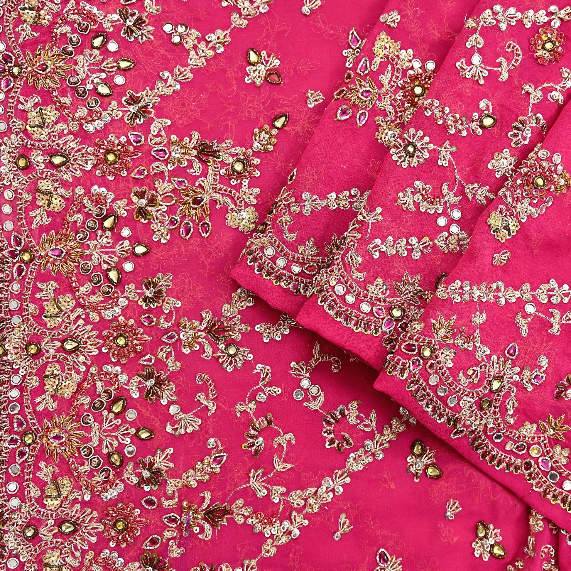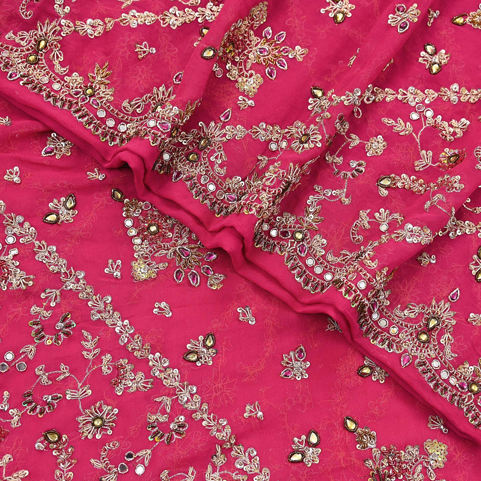 This exceptional vintage dupatta is a rare and regal piece, handcrafted on rich 100% pure georgette silk in a Pink hue. Adorned with luxurious floral hand embroidery, the border and center showcase pure metallic golden & Green, Pink zardozi/dabka, zari, golden sequins, silver beading, White & Pink Stones work, and intricate mukesh embellishments.