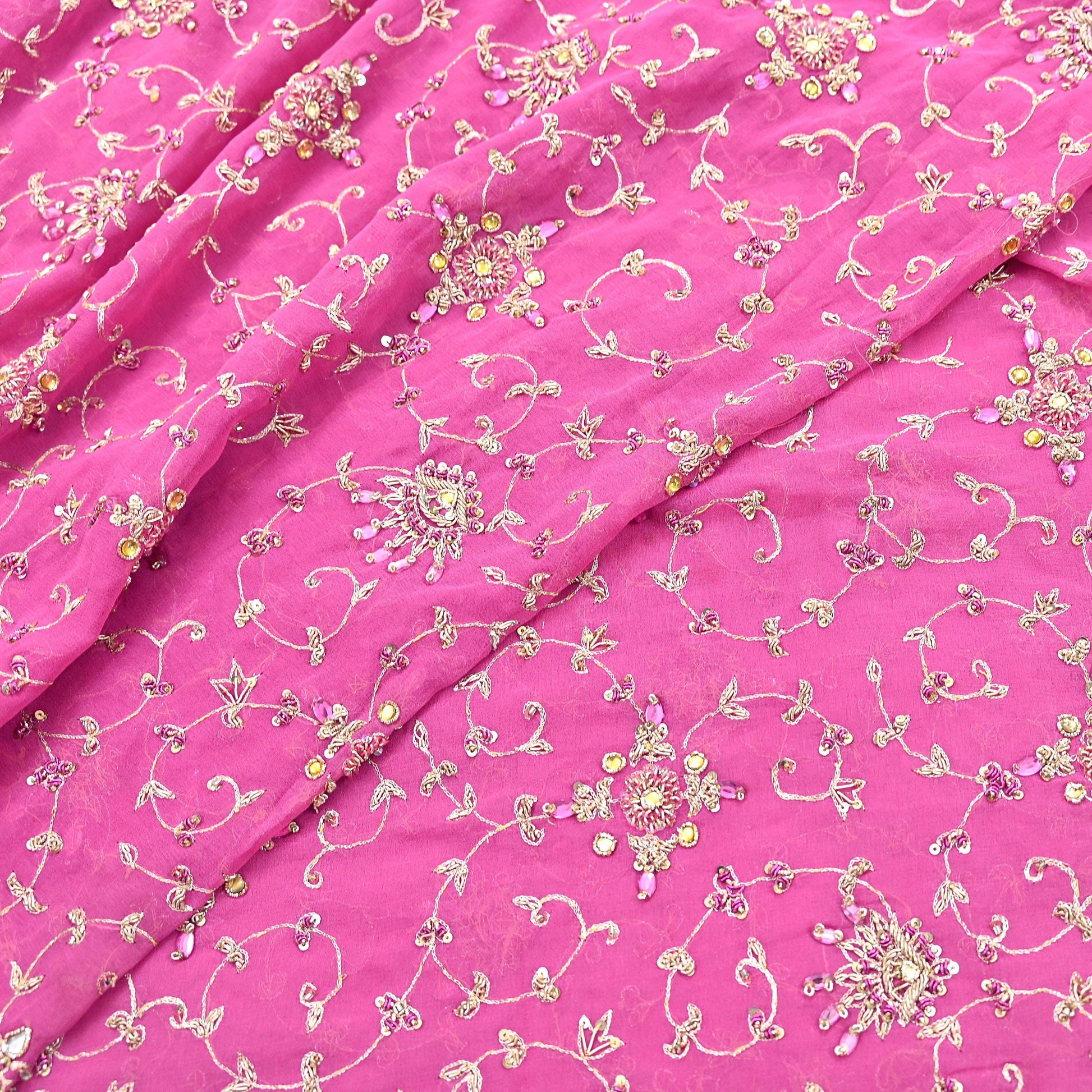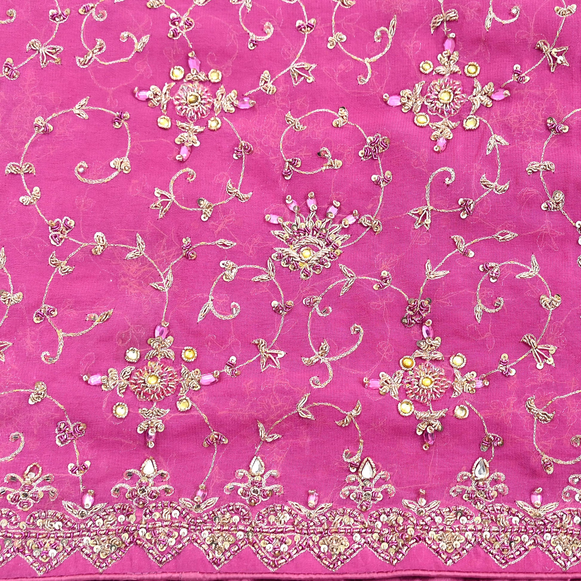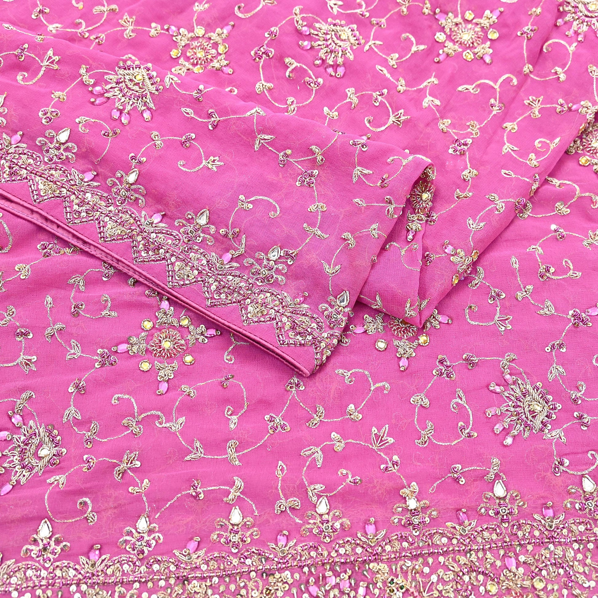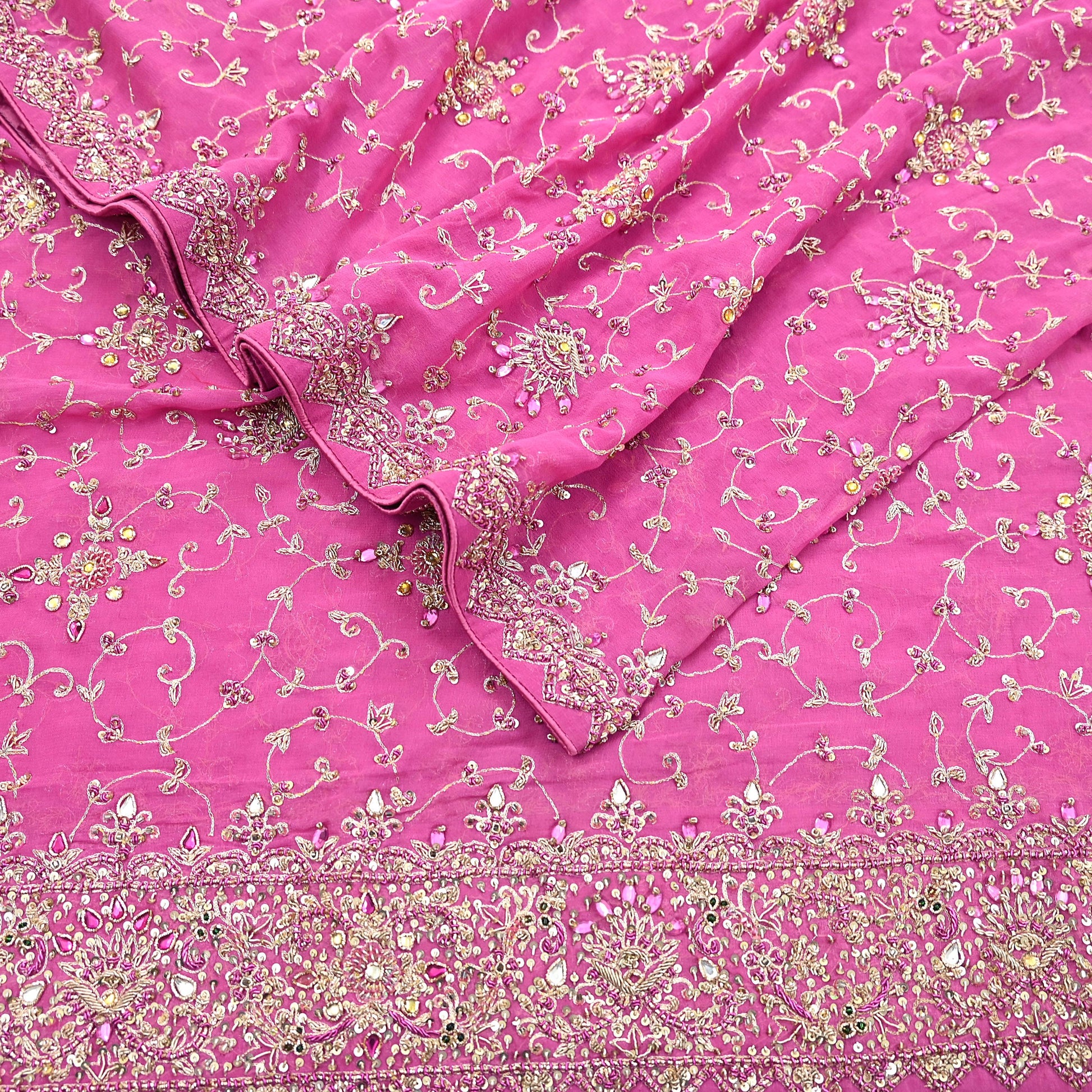 This exceptional vintage dupatta is a rare and regal piece, handcrafted on rich 100% pure georgette silk in a Pink hue. Adorned with luxurious floral hand embroidery, the border and center showcase pure metallic golden & Purple zardozi/dabka, zari, golden sequins, silver beading, White & Pink Stones work, and intricate Kundan embellishments.