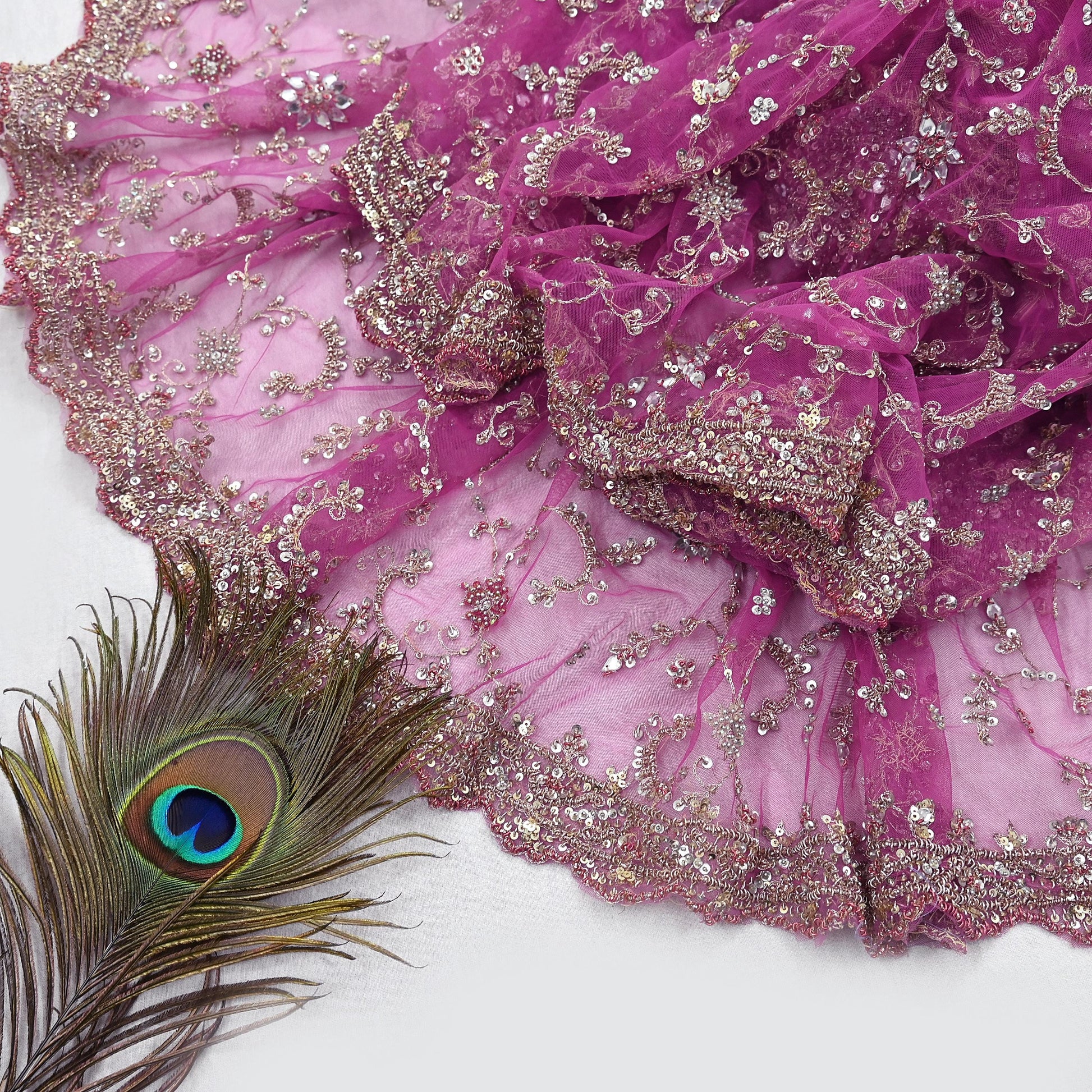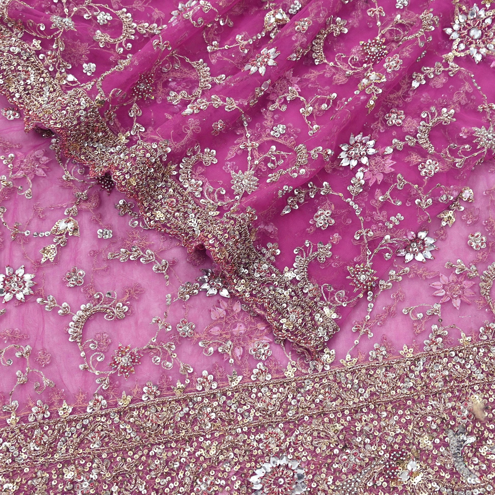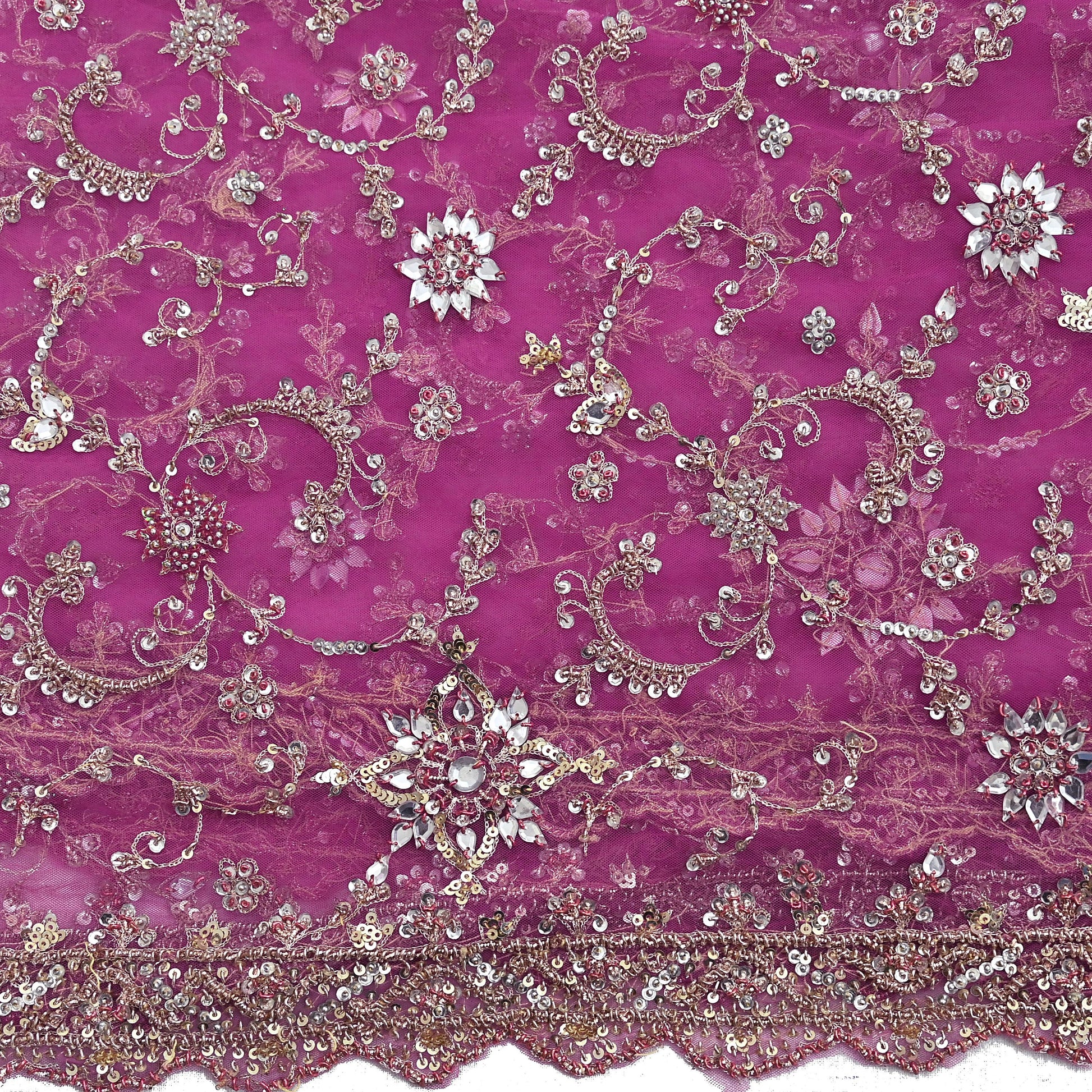 Stunning Beautiful Heavy Dupatta Hand Embroidered Net Dupatta/Stole In Purple Color Fabric. This one of a kind item is difficult to express in words. Border feature is floral & Paisley design embroidered pure metallic Golden, Red, Green & Purple zardozi/Zari And Silver & Golden reflected sequins & White Stone/Beaded work embellished work is the highlight of the dupatta. Also you can see similar Zardozi, Beaded & Multi Sequins work with floral pattern in center part adds to its beauty. Golden Beads Tassels work is giving a fabulous look to the dupatta. Awesome one !!!