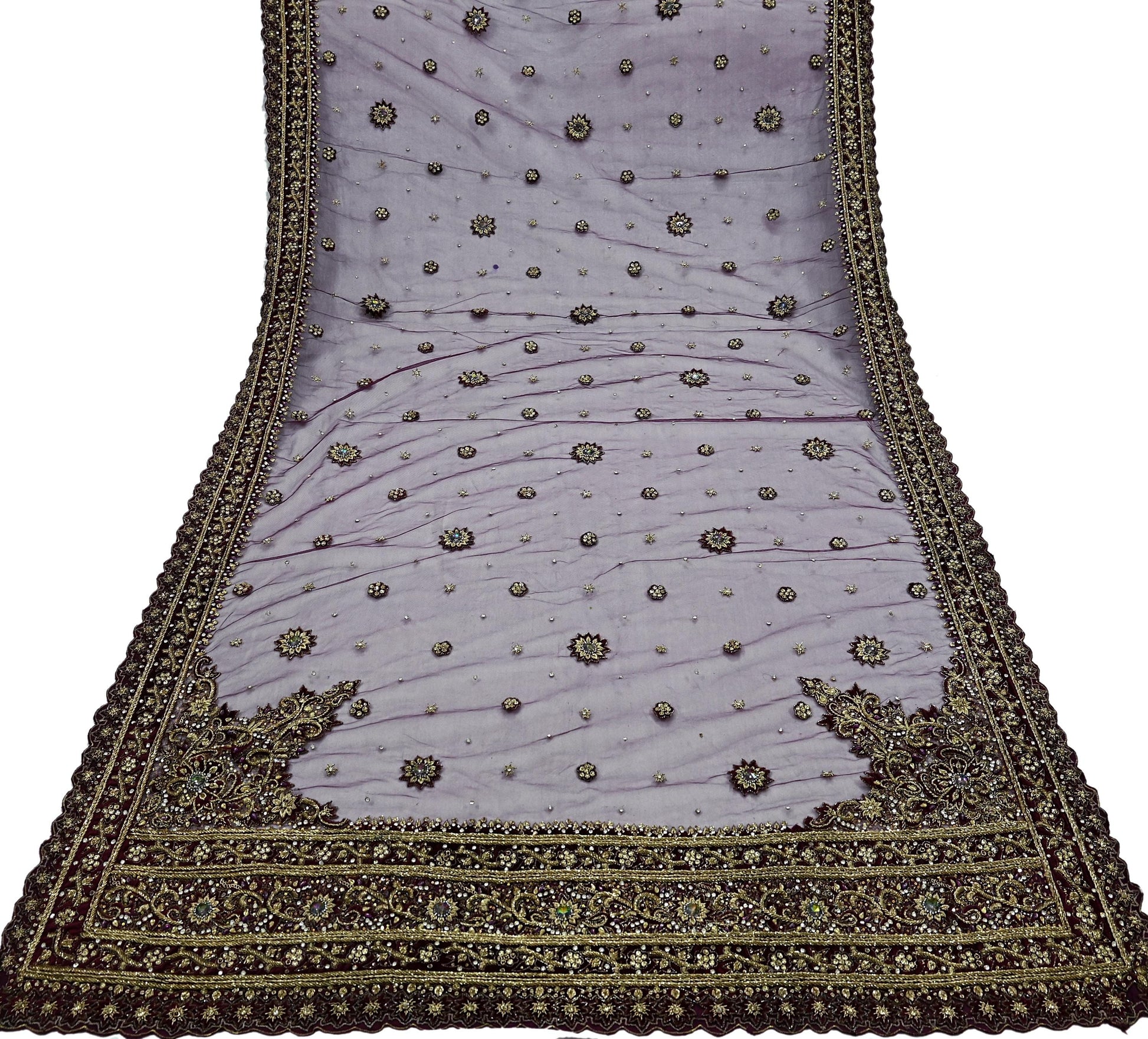 Indian Vintage Heavy Purple Dupatta Net Mesh Long Stole Hand Embroidered Scarves Golden Zardozi Dabka Zari Stole